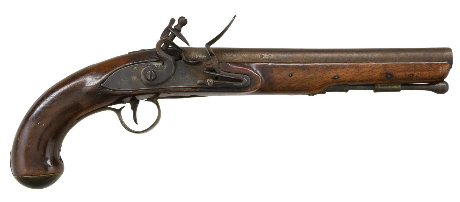 Cal. 61. NSN. Bbl. 9" round. Pistol is devoid of sights. Top of bbl. marked "LONDON" & w/ Birmingham proofs. Center of lock marked "T. KETLAND & CO.". Walnut stock w/ brass furniture. Top of wrist has circular brass plaque. Iron ramrod present. CONDITION: stock has added finish w/ a notable repaired crack running from below lock to above trigger guard, a couple other cracks, scattered dings & handling wear. Brass parts are mostly a dull yellow patina w/ scattered oxidation. Balance of metal is a dull gray patina w/ scattered oxidation & pitting. Oxidized bore. PROVENANCE: From the Lifelong Collection of Glen E. Mattox. (01-22410/MJC). ANTIQUE. $800-1200.