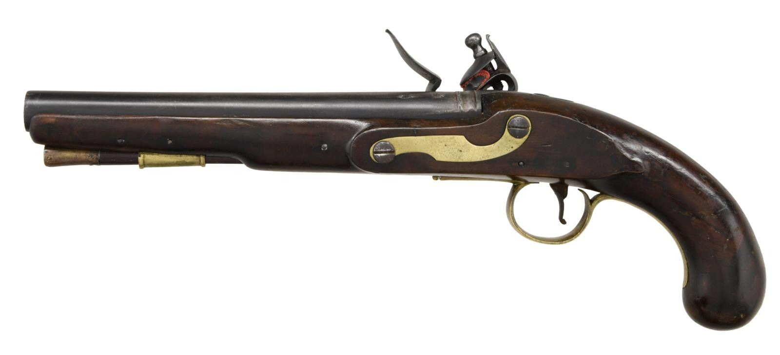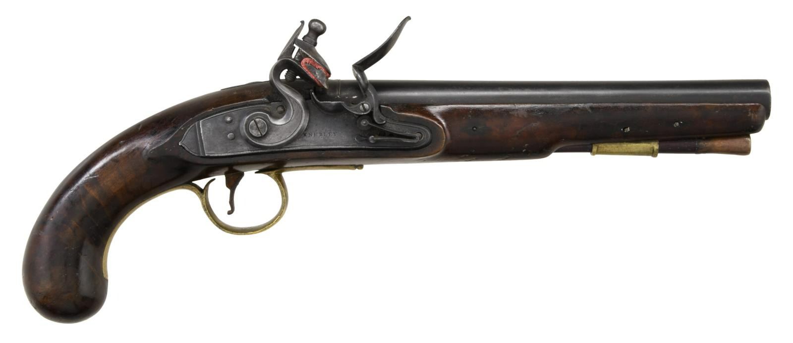 Cal. 65. NSN. Bbl. 9" rnd. Pistol is devoid of sights. Bbl. has British proofs. Center of lock is marked "KNUBLEY". Walnut stock w/ brass furniture. Brass tipped hickory ramrod. CONDITION: stock has added finish w/ a couple notable repaired cracks, a few smaller cracks, scattered dings & handling wear. Brass parts are turning to a dull yellow patina w/ scattered dings & oxidation. Balance of metal has a fading older blue finish w/ scattered oxidation. Oxidized bore. PROVENANCE: From the Lifelong Collection of Glen E. Mattox. (01-22411/MJC). ANTIQUE. $800-1200.