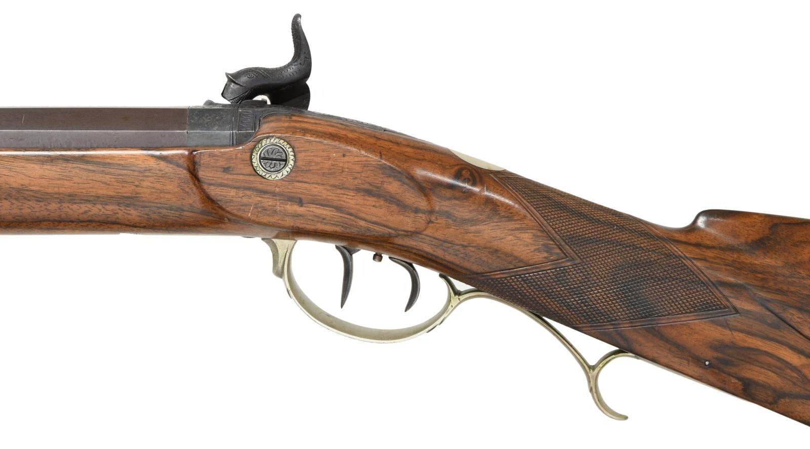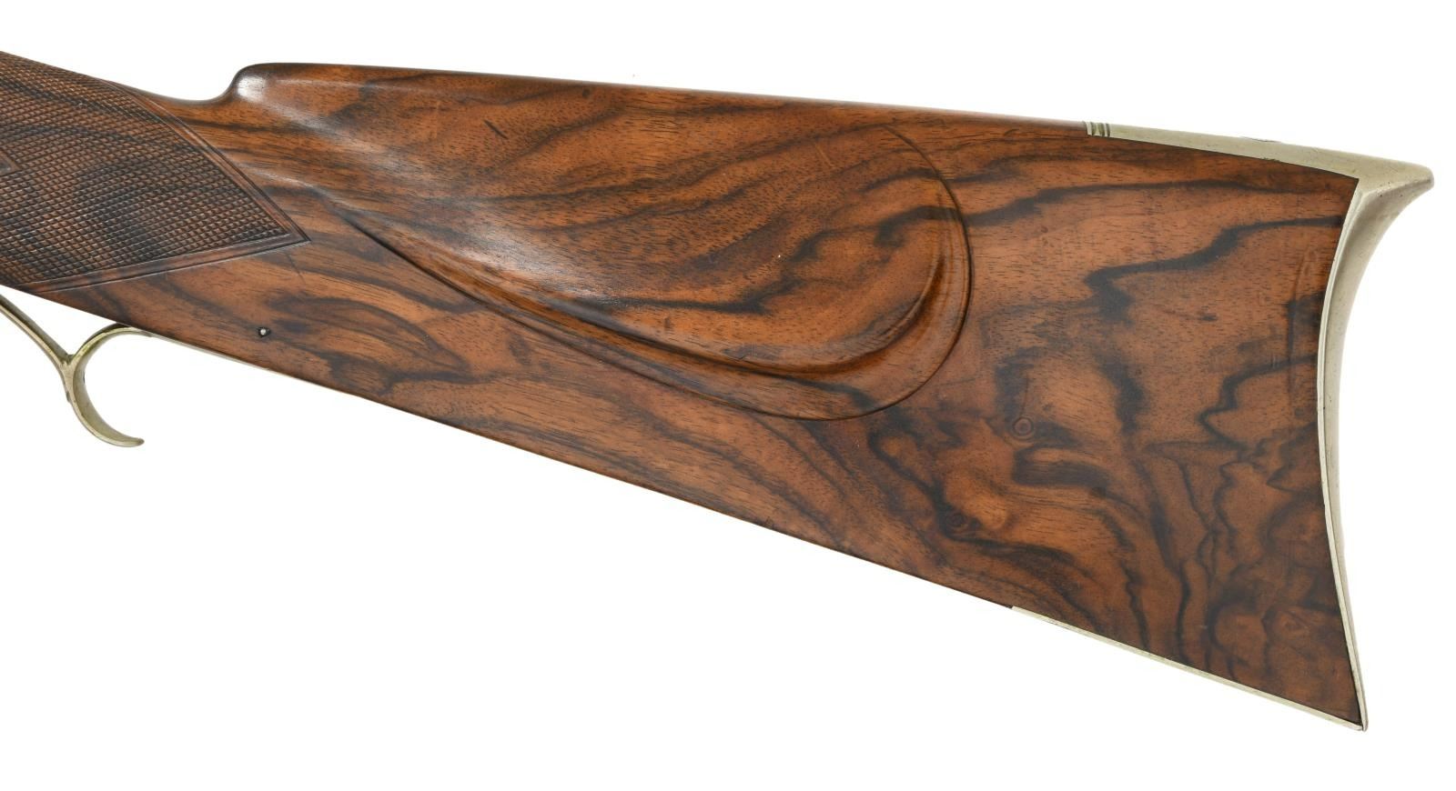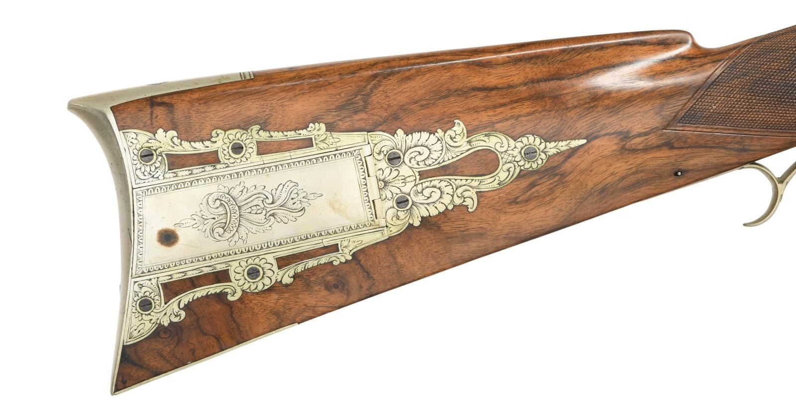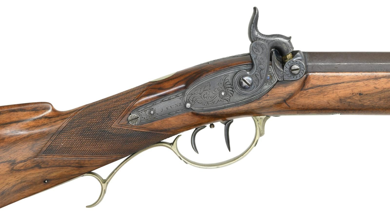 Cal. 50. NSN. Bbl. 34 1/2" heavy octagon measuring 15/16" across flats at muzzle. Brass blade front sight w/ fixed U notch rear sight. Top flat is engraved "J. KUNZ. PHIa C STl". American Gunsmiths by Frank Sellers details the following information, "KUNTZ, JACOB, (1780-1876). Whitehall, Pennsylvania, 1807-1810, Philadelphia, Pennsylvania, 1811-1875. Brother of Peter Kuntz. Air, flintlock and percussion guns. (Dyke)". Sculpted lock, hammer, top tang & patent breech have scroll engraving. Hammer has serpent head engraving. Double set triggers. Key fastened half length cheekpiece stock of fancy walnut w/ checkered wrist. Rectangular lid pierced segmented German silver patchbox w/ fancy finial & extensive engraving. Other German silver fittings include crescent buttplate, engraved toe plate, finger curl trigger guard, thimble, nose cap, side plate & wedge escutcheons. Artificially striped brass tipped ramrod held on iron underrib by 2 plain pipes. WEIGHT: 10 lbs, 1.4 oz. CONDITION: bbl. retains 80% lightly faded browned finish. Lock, tang & breech have 80% lightly faded blue. Original stock finish shows moderate wear w/ scattered scratches & marks. Bore is generally bright retaining sound rifling. (01-21898/DS). ANTIQUE. $3500-5000.