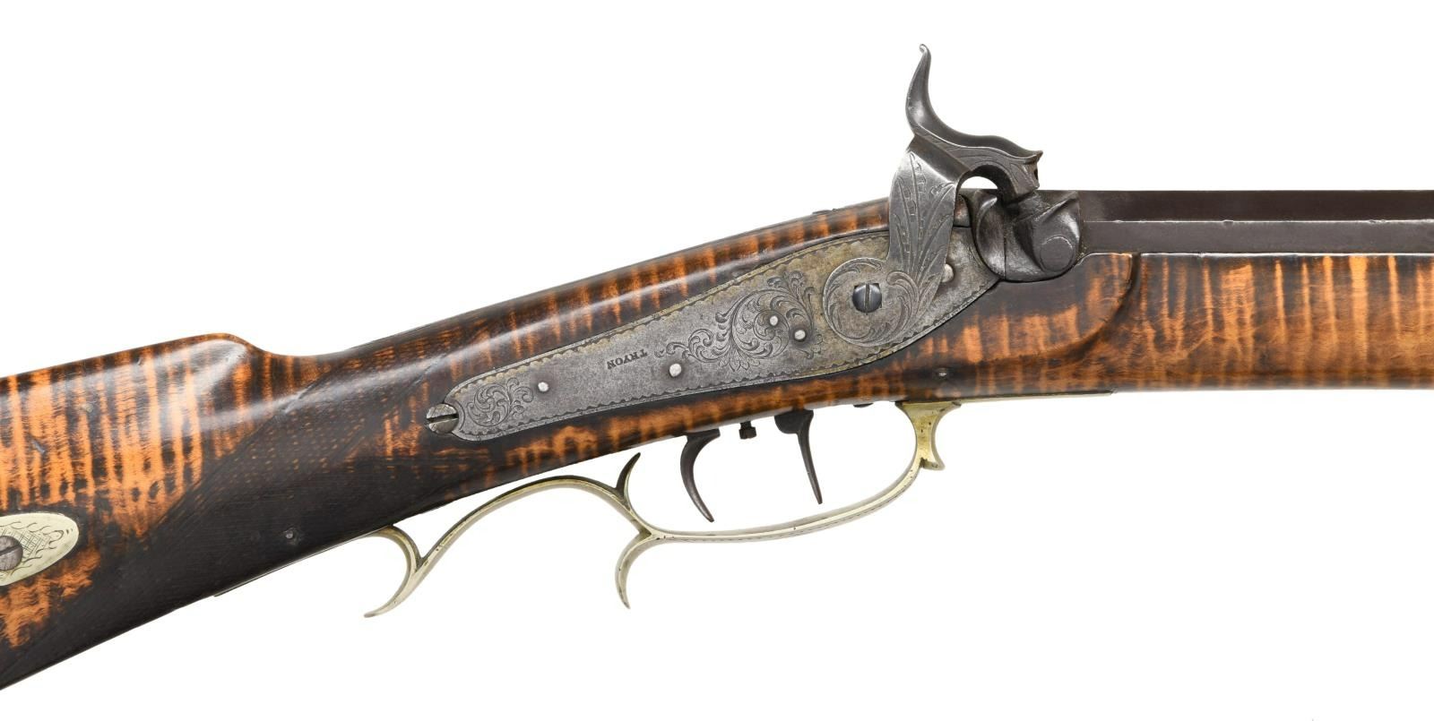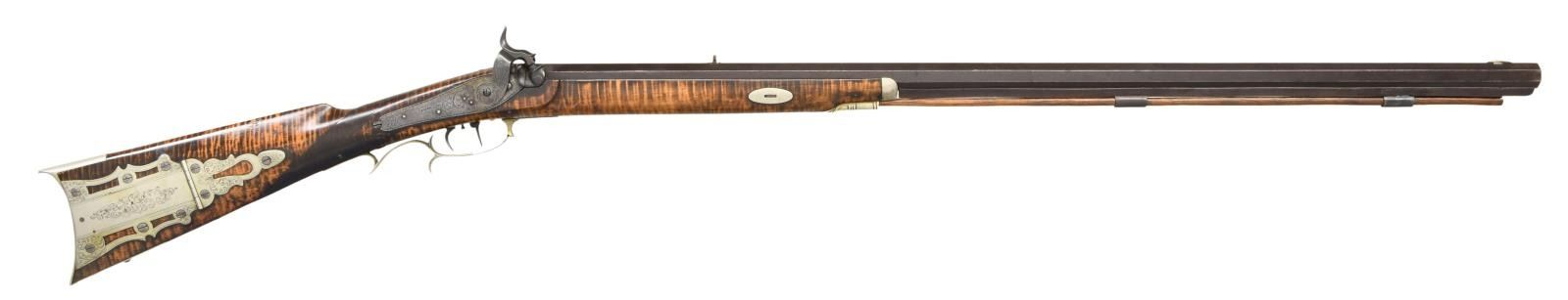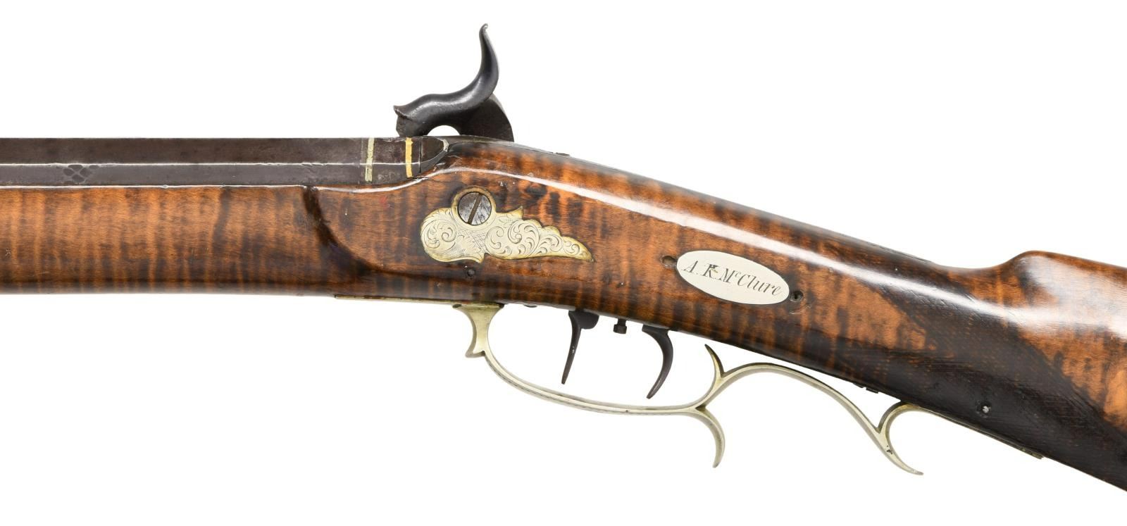 ALEXANDER MCCLURE. Cal. 36. NSN. Bbl. 32" oct. Silver blade front sight. Fixed V-notch rear sight. Rear bbl. flat marked "TRYON PHILADA". Back action lock marked w/ an upside down "TRYON". Double set triggers. Hammer screw appears to be a replacement. Left side of stock has silver disc marked "AK MCCLURE". The consignor states that this is for Alexander McClure, who was an abolitionist & supporter of President Lincoln. McClure was commissioned as an assistant adjutant general by Lincoln during the Civil War & helped raise several regiments into the Union Army. McClure would be captured & then released by J.E.B Stuarts forces in 1862 & later he met Robert E. Lee during his invasion of Pennsylvania in 1863. Lock, hammer, left rear stock escutcheon, patchbox & trigger guard have floral engraving. Nicely figured curly maple key fastened half-stock w/ checkering at wrist & left side cheekpiece. German silver thimble w/ two plain pipes & replacement hardwood ramrod. German silver fittings including finger curl trigger guard & crescent buttplate. Pierced segmented rectangular engraved patchbox. UNATTACHED ACCESORIES: framed reprint Tryon Gun Store advertisement that measures 14 1/2" high & 11" in width. CONDITION: stock has added finish w/ a couple small repaired cracks near upper tang, some dings & handling wear. Silver parts remain partially bright w/ some light oxidation & scratches. Balance of metal is a gray patina w/ some light pitting, light dings, old tool marks & scattered oxidation. Bore shows scattered oxidation & pitting but evident rifling. PROVENANCE: From the Collection of James B. Taylor. (01-23870/MJC). ANTIQUE. $1500-2250.