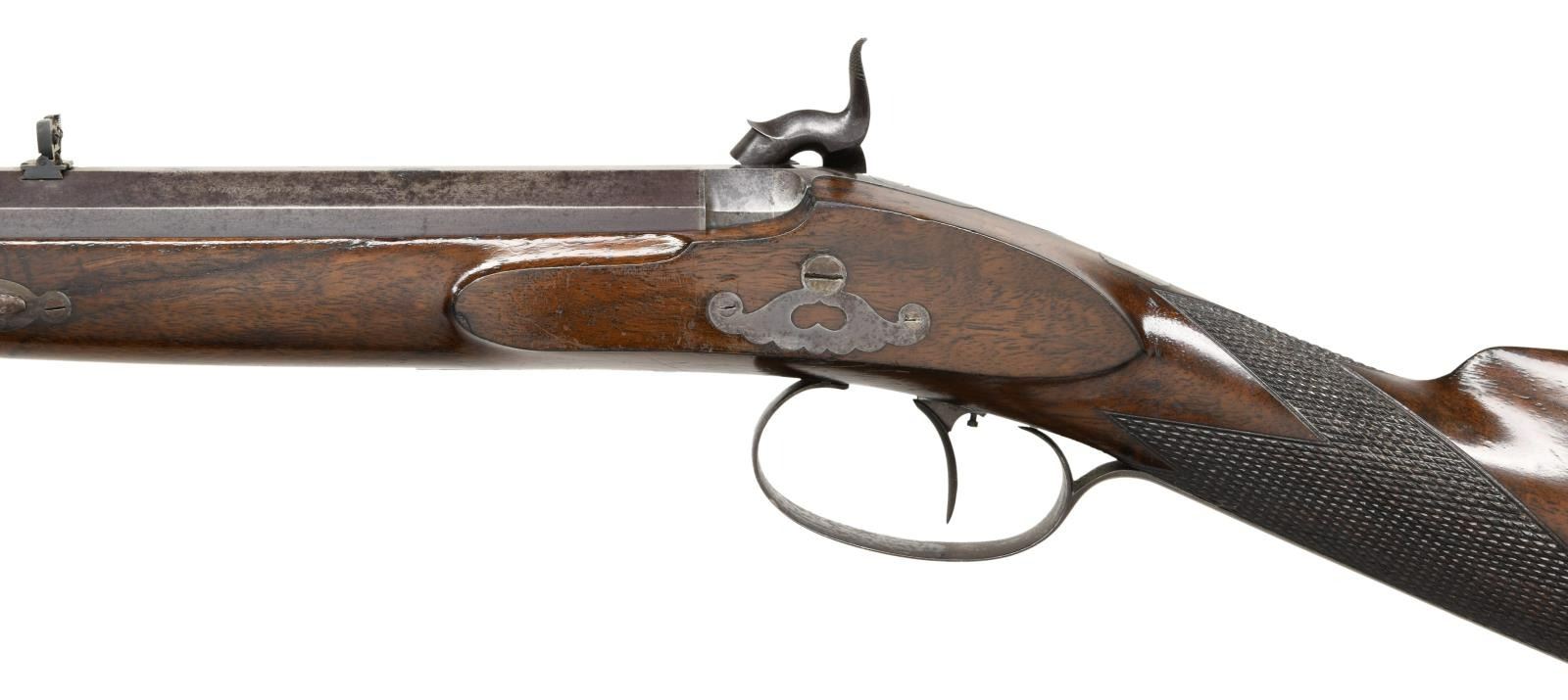 Cal. 45. NSN. Bbl. 34 1/2" oct. Globe style front sight w/ hood. Modern folding leaf rear sight. Hooked breech. Lock marked "JOHN P. LOVELL". Left bbl. flat marked "JOHN P. LOVELL BOSTON". Single set trigger. Checkered walnut stock w/ key escutcheon. Top of wrist has silver plate. CONDITION: stock has added varnish w/ notable repaired 6" crack on left side of forend, some chipping around bbl, scattered handling marks & dings. Metal is mostly a gray patina w/ a couple patches of pitting on bbl, scattered oxidation , some light dings & traces of finish. Bore has scattered pitting & oxidation but strong rifling. PROVENANCE: From the Harold Prucha Collection. (01-23256/MJC). ANTIQUE. $1400-1800.