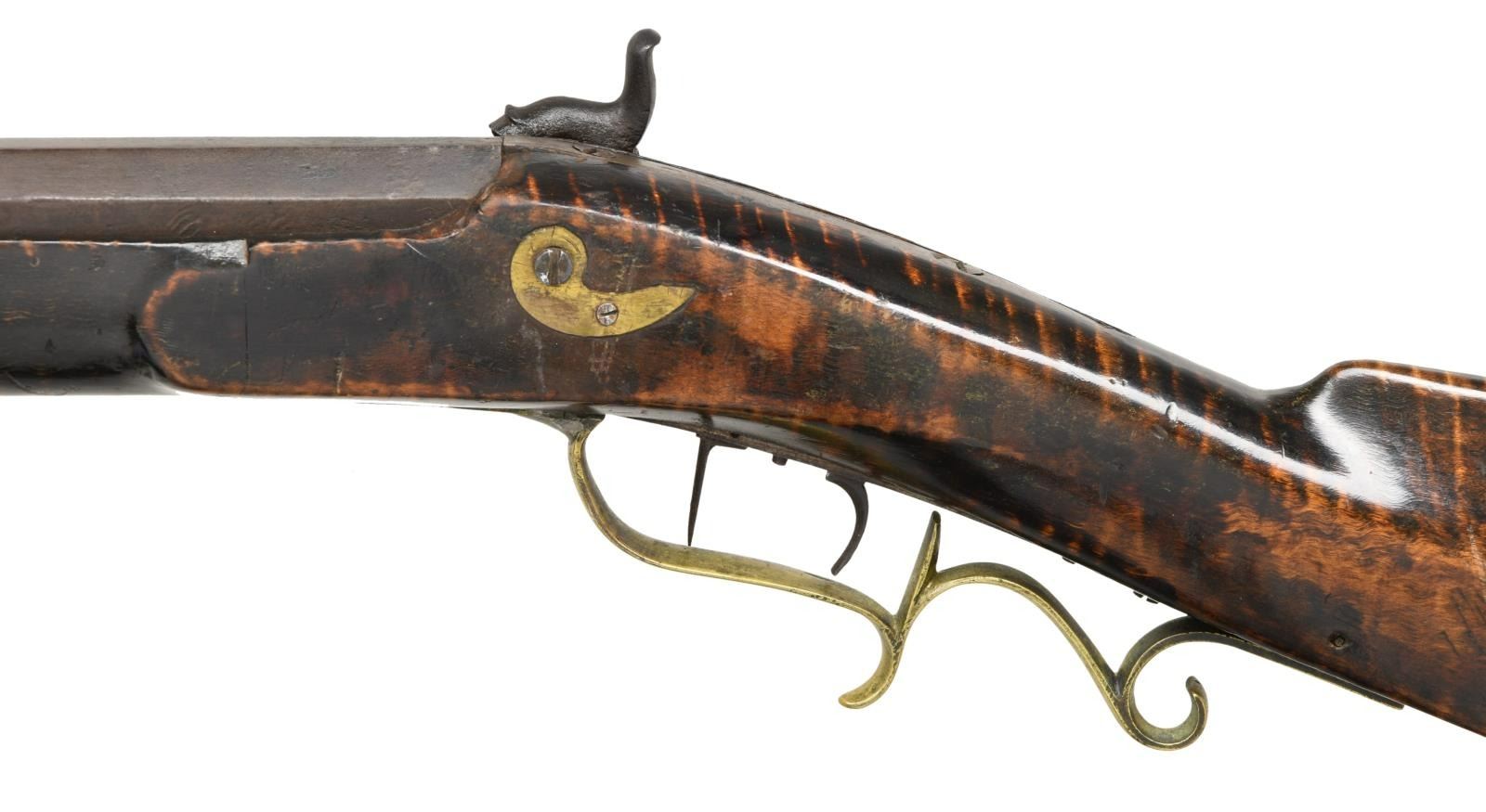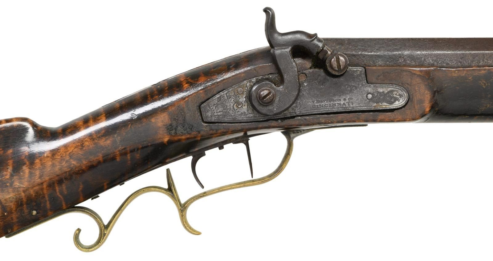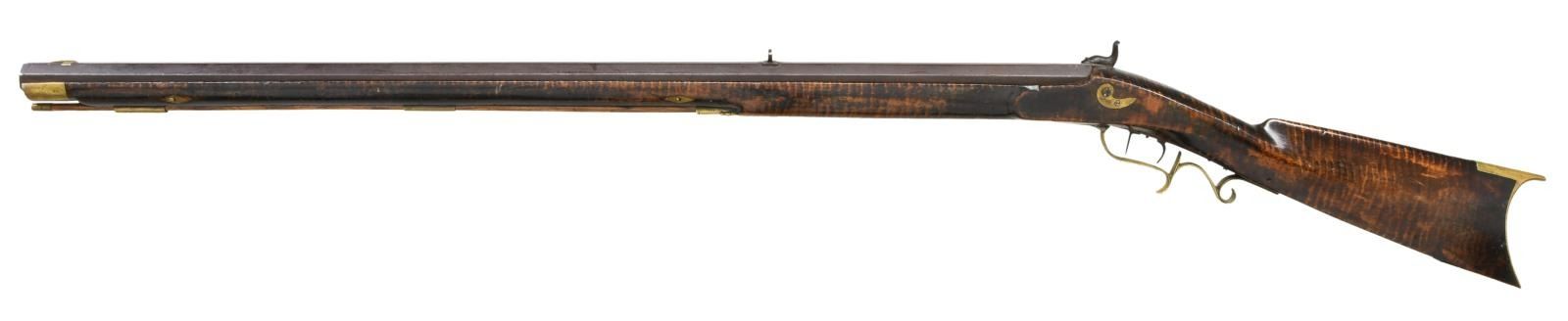 CINCINNATI, OHIO. Cal. 40. NSN. Bbl. 35 1/4". This rifle has an extremely heavy octagon barrel with a German silver, flat blade sight and a fixed sight 10 1/2" from the breech. The barrel is unmarked and has a replaced drum. The lock is signed "T. DAVIDSON & CO CINCINNATI". The lock retains its original hammer, decorated in a similar manner to the lock. Brass trigger guard with double set triggers. Brass butt plate, small side plate, barrel pin escutcheons, nose cap, entry thimble, and ramrod thimbles. Attractive tiger maple stock. Early wooden ramrod may be original to the gun. CONDITION: barrel has a dark overall patina with replaced drum. Lock shows significant wear and does not hold cock. Brass has a wonderful deep mustard patina. Stock has been refinished with a small bit of fill above the lock, near the barrel pins, and near the muzzle. Very good bore with strong rifling. (01-24039/BF).ANTIQUE. $800-1,400.