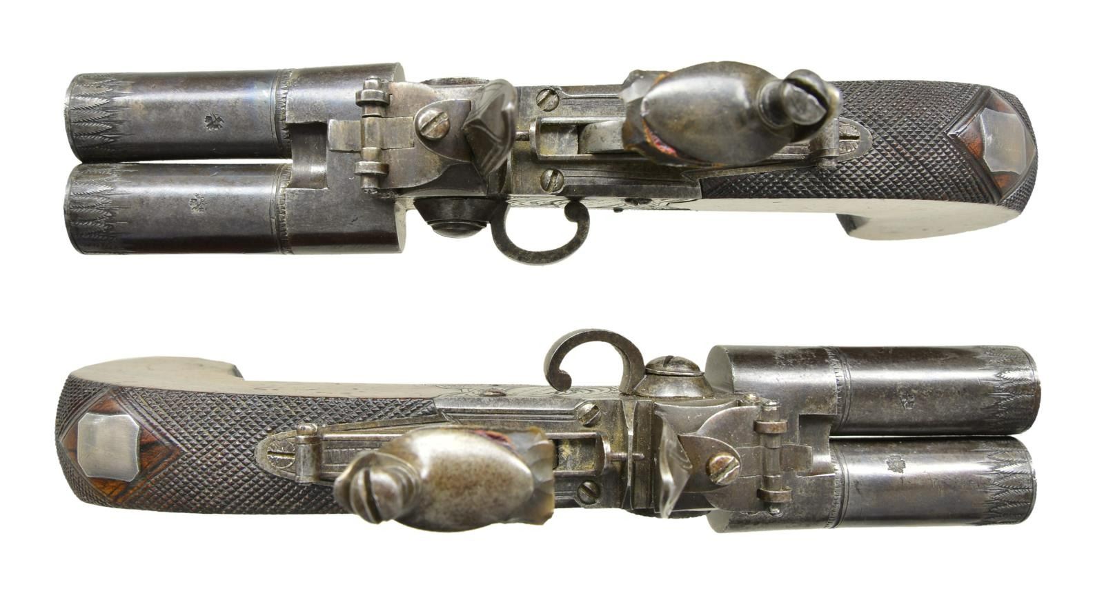 PISTOLS BY SMITH, LONDON. Cal. 36. S# NSN. The 1 3/8" turn off barrels with feather engraved muzzles and Birmingham proofs are engraved "1" "2" "3" & "4" on sides with matching numbers on sides of boxlock actions. Actions have rotating drums for two different priming charges. First charge fires left barrel while second charge fires right. Actions are fitted with reinforced flint cocks, frizzens with external springs, semi-waterproof pans and safetys which engage at half cock and lock frizzens in closed position. When brought to full cock a folding trigger extends. Actions are engraved with feather borders and scroll. "SMITH""LONDON" is in ovals on left sides. Flat sided walnut bag grips have closely spaced checkering on top and bottom straps. Rectangular crest plates with cut corners are at tops of grips and are unengraved. CONDITION: fine. Barrels and actions retaining a fair amount, perhaps 40%, original case hardening color. Stocks are fine with most of their original finish. Bores are dark and pitted, pistols are mechanically good. (01-21868/MGM). ANTIQUE. $2,000-4,000.