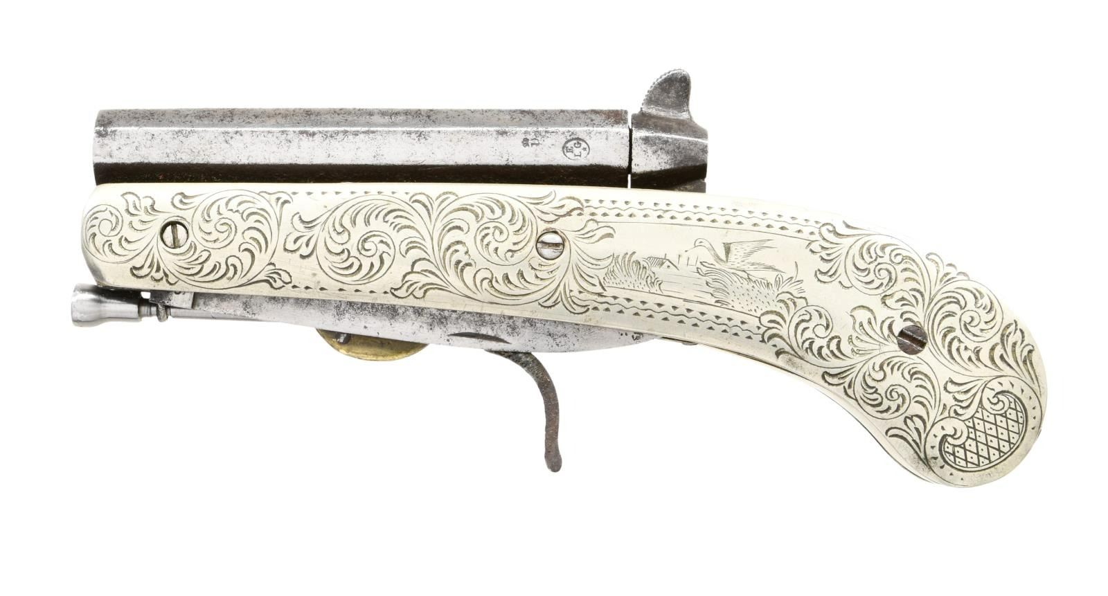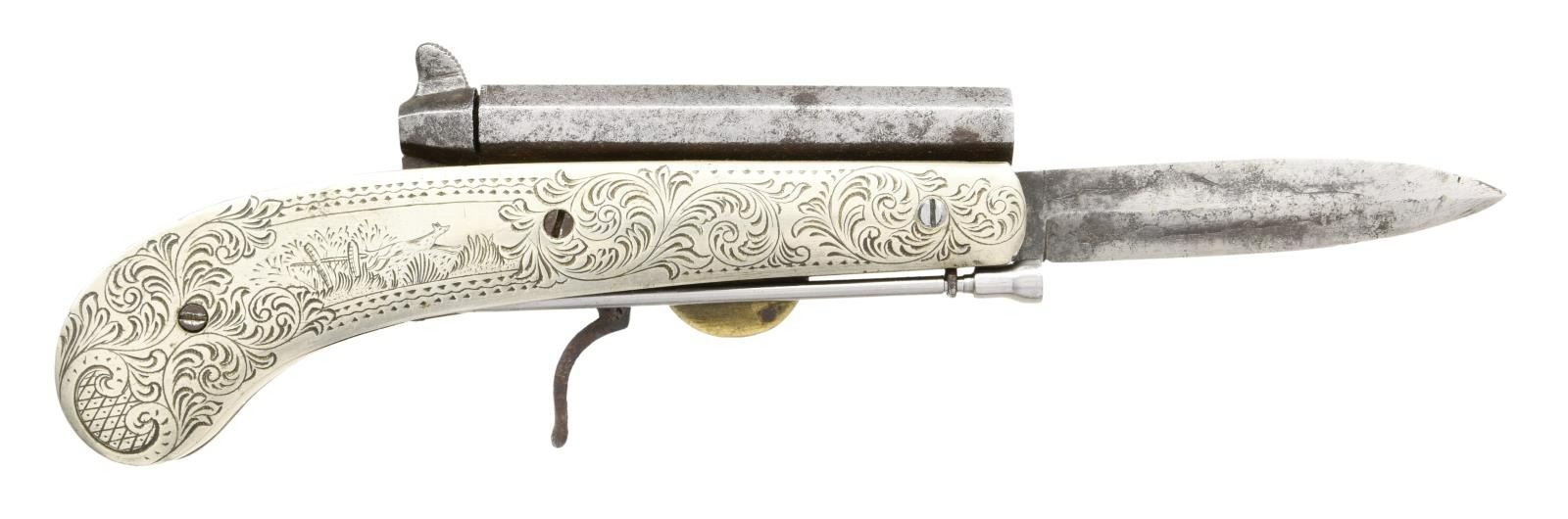 Cal. 36. NSN. Bbl. 3 1/2" octagon with Belgium "ELG" in oval proof mark on left side. 3 1/4" spear point knife blade appears to be marked "FERREES". Action has a cup shaped hammer & folding trigger. German silver scales have vine type scroll around scenes featuring a running hound on right and a duck on the left side. A steel ramrod is located left of the trigger housing. Weight 1 lbs. CONDITION: Iron parts have gray appearance showing scattered light pitting. Scales show light engraving wear. Deeply pitted bore. PROVENANCE: Marshall "Brook" Davis Collection. (01-23544/DS). ANTIQUE. $2500-3500.