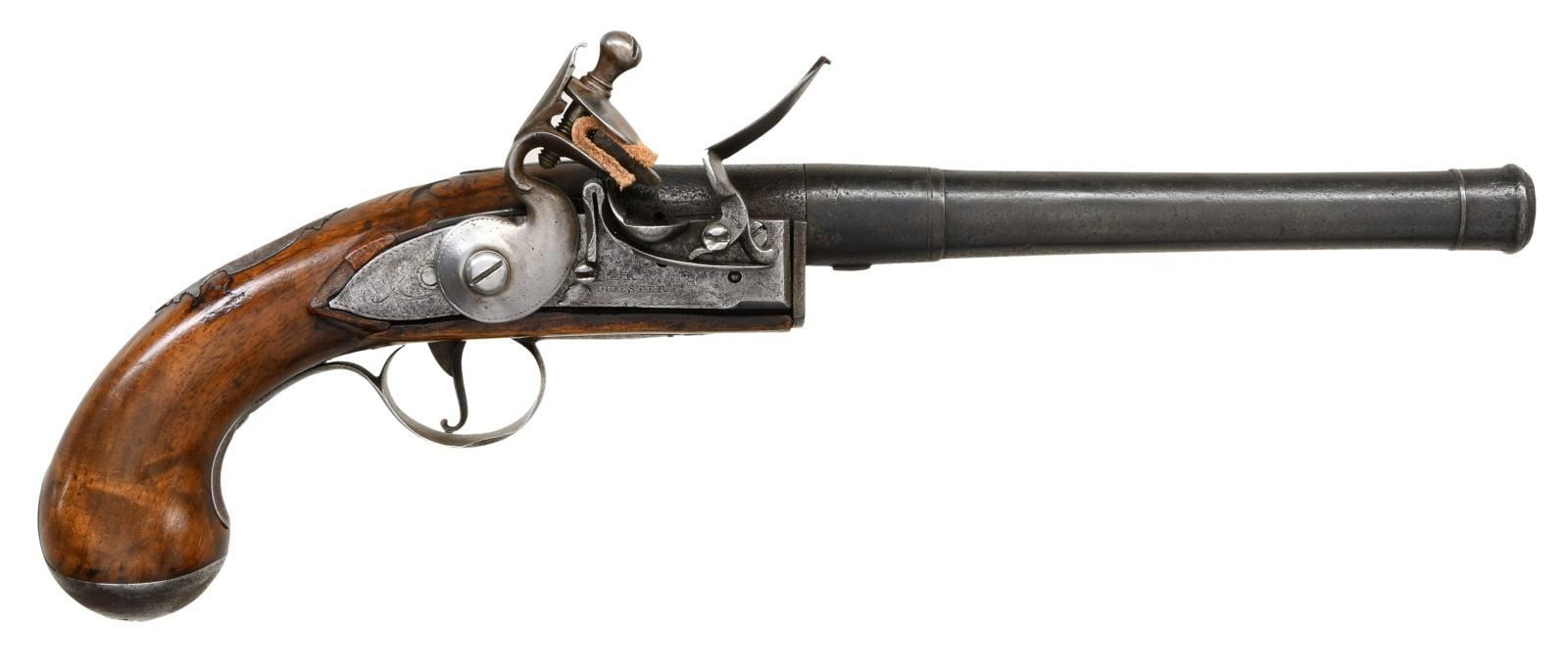 Cal. 62. NSN. Bbl. 8 1/4" rnd. Queen Style pistol w/ turn-off bbl but lock appears separate. Lock displays a loose fit to wood & is marked "R BOLSTER". Sideplate & trigger guard have floral decorations. Top of wrist has floral decoration. Hammer not cocking & may require attention to fix. Hardwood stock. CONDITION: stock appears refinished w/ chipping around lock, a couple filler repairs, scattered dings & handling wear. Lock & hammer were cleaned & show scattered oxidation & pitting. Bbl. is a dark patina w/ some tool marks, scattered oxidation, dings & pitting. Bottom metal is turning gray w/ scattered oxidation & pitting. Oxidized bore. (01-24086/MJC). ANTIQUE. $1200-1800.