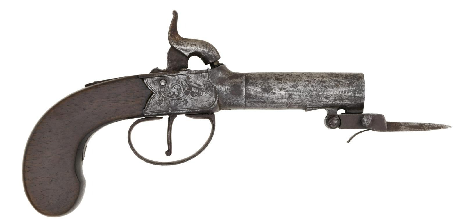 BAYONET. Cal. 45. NSN. Bbl 3". Single shot percussion pistol with an under-folding bayonet produced by E&W Bond of London, England. Sides of frame exhibit light scroll engraving, with "E&W BOND/ LONDON" engraved over the top, and English proofs stamped on the underside. Under-folding trigger is retained via the trigger guard. 1 piece smooth wood grip. CONDITION: metal components exhibit a mottled gray patina, with areas of mild surface oxidation overall. Wood grip shows scattered marks from handling and storage, with a mild crack to the rear of the upper tang. (01-24141/MLW). ANTIQUE. $700-1,000.