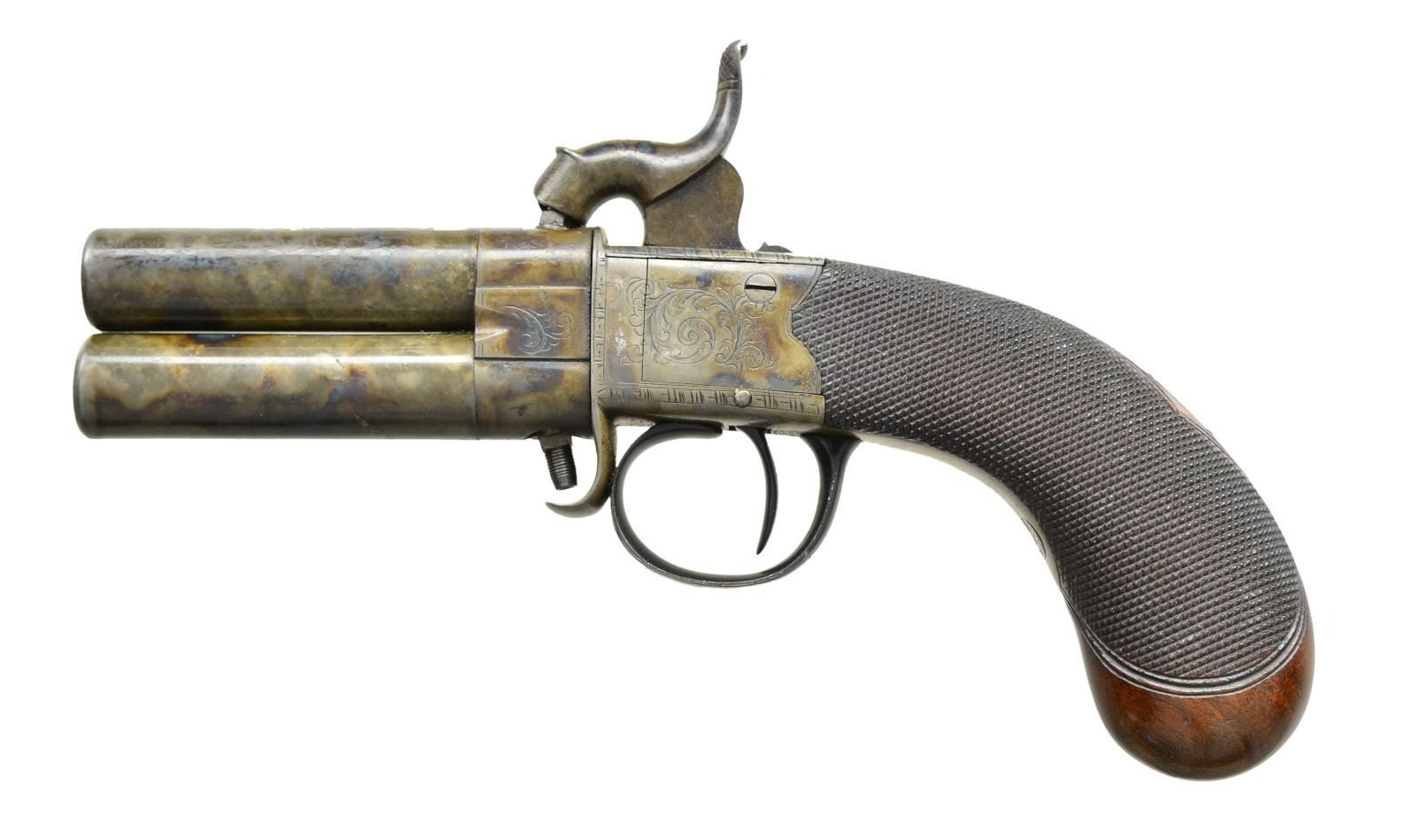 J. CALVERT OF LEEDS. Cal. 36. S# NSN. The 2 1/4" case hardened screw off barrels are unmarked. Rotating breech section has scroll engraving and London black powder proofs. Boxlock action with tall hammer and blued trigger guard is engraved with scroll on sides and maker's name and address on top tang. Walnut bag grip is about 80% checkered and a vacant German silver rectangle is at top of grip. CONDITION: very fine as refinished. Metal parts retaining nearly all a re-color and blue with losses only in chipped outer lacquer coat. Stock finish is good, checkering with very light wear. Dark bores are heavily pitted, mechanically good. (01-22098/MGM). ANTIQUE. $900-1,200.