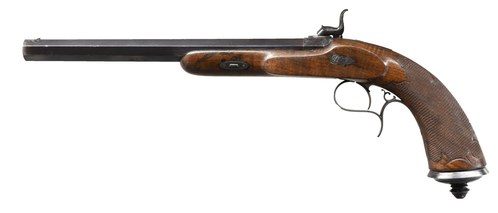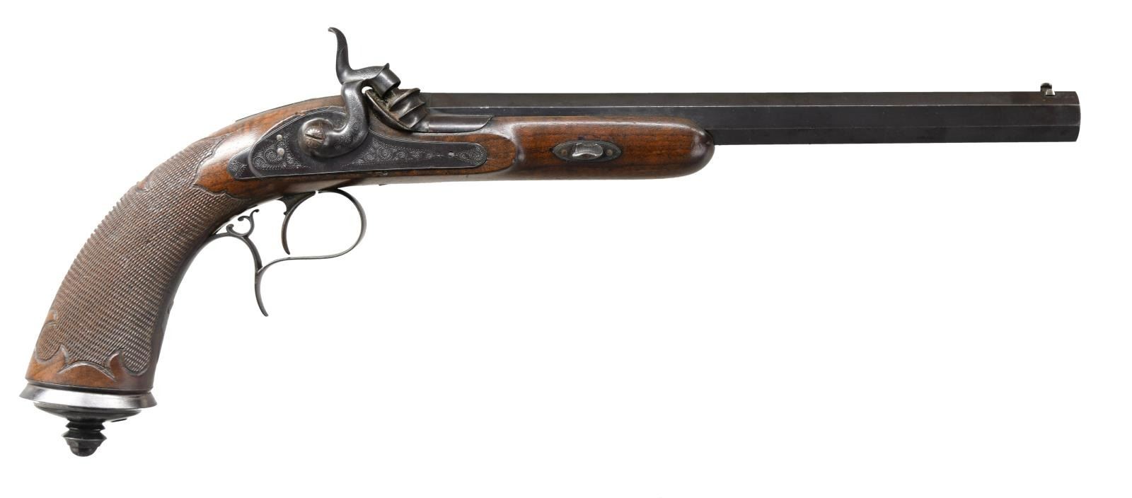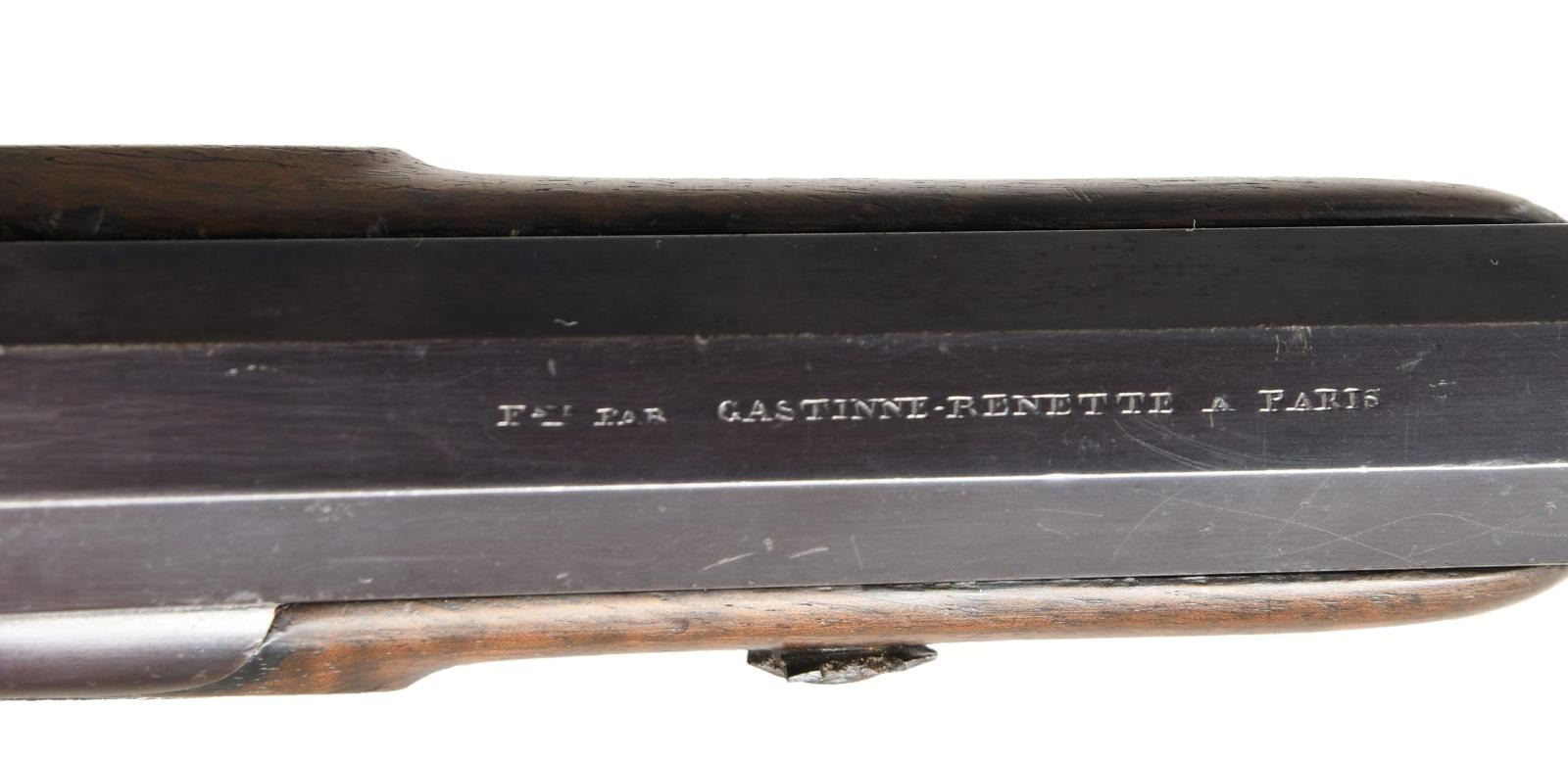 Cal. 45. S# NSN. Number "2" of a pair. This high quality pistol has 10 3/4" octagon barrel engraved "Fte. par GASTINE-RENETTE a PARIS" on top flat and has nicely filed percussion bolster and the number "2" in gold on engraved breech section. Breech iron also inlaid "2" has "U" notch rear sight and scroll engraving. Blued island front spring lock with rebated tail and round bodied serpentine hammer is also scroll engraved. Half stock with long flaired checkered grip has no provision for ramrod and is fitted with heavy steel grip cap, trigger guard with finger spur and single sideplate. Stock attaches to barrel with single captive side nail through oval steel escutcheons. CONDITION: fine to very fine. Metal parts retaining over 80% original blue with some scratches and spotting. Stock retains most of its original oil finish with some marks. There are some chips missing around lockplate. Head of side nail is also chipped. Bore is mostly shiny, possibly with some light pits (needs some cleaning). Mechanically good. (01-23469/MGM). ANTIQUE. $1,500-2,500.
