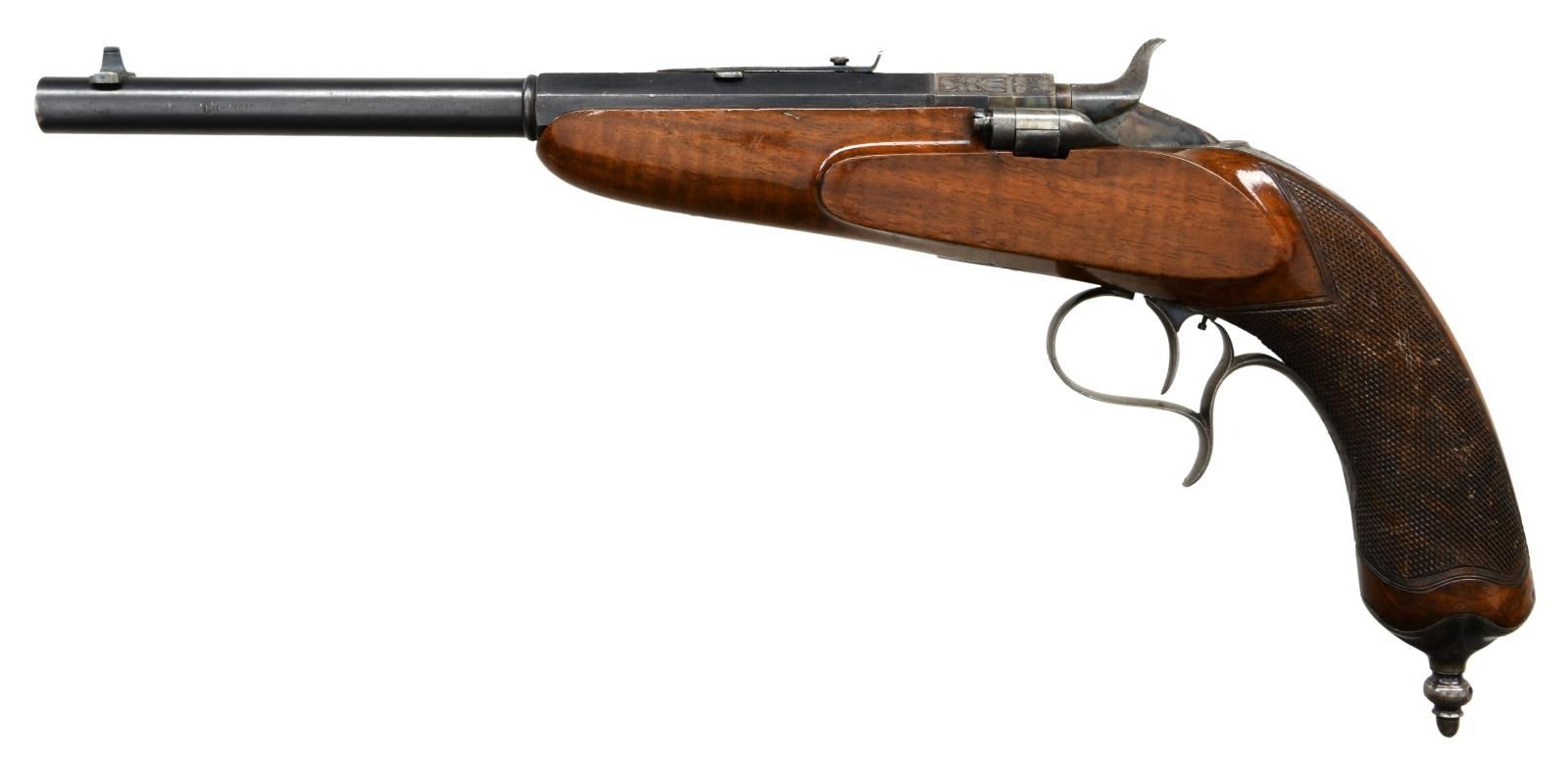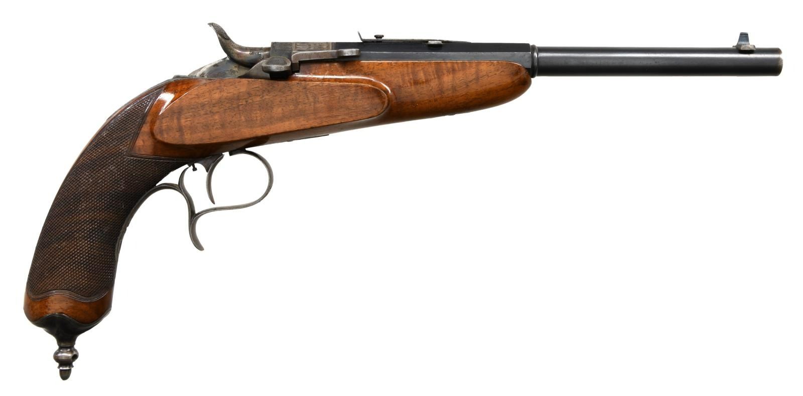 Cal. 25 CF. NSN. Bbl 10" half-rnd half-oct. Bead front sight. U-notch rear sight. Blued bbl. Case colored hammer & breechblock. Hammer will not always hold on full cock. Left side of bbl. marked "0.5gr N.G.P. M/71". Back of breechblock marked marked w/ Prussian eagle & "Crown U" proof. Trigger guard, hammer, upper tang & breechblock have floral engraving. Checkered walnut stock w/ grip cap. CONDITION: stock has added varnish w/ some flaking, handling wear & dings. Case colored & engraved parts are turning to a gray patina w/ some scattered oxidation. Blued bbl. retains 92% finish w/ a few light dings & some edge wear. Bore is mostly bright w/ a few scattered patches of pitting. PROVENANCE STATEMENT: From the Harold Prucha Collection". (01-23222/MJC). ANTIQUE. $700-1000.