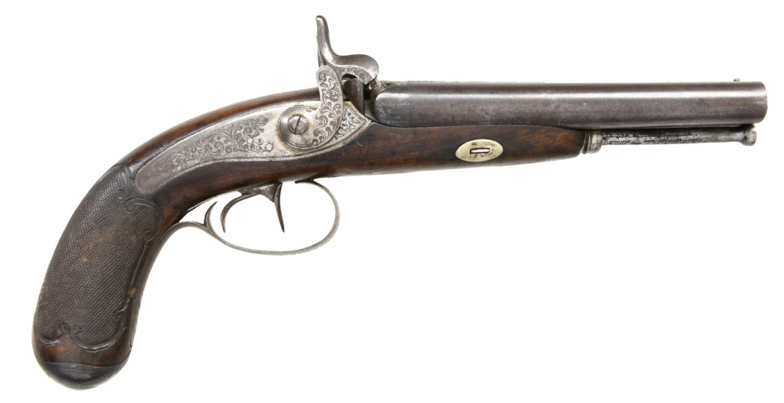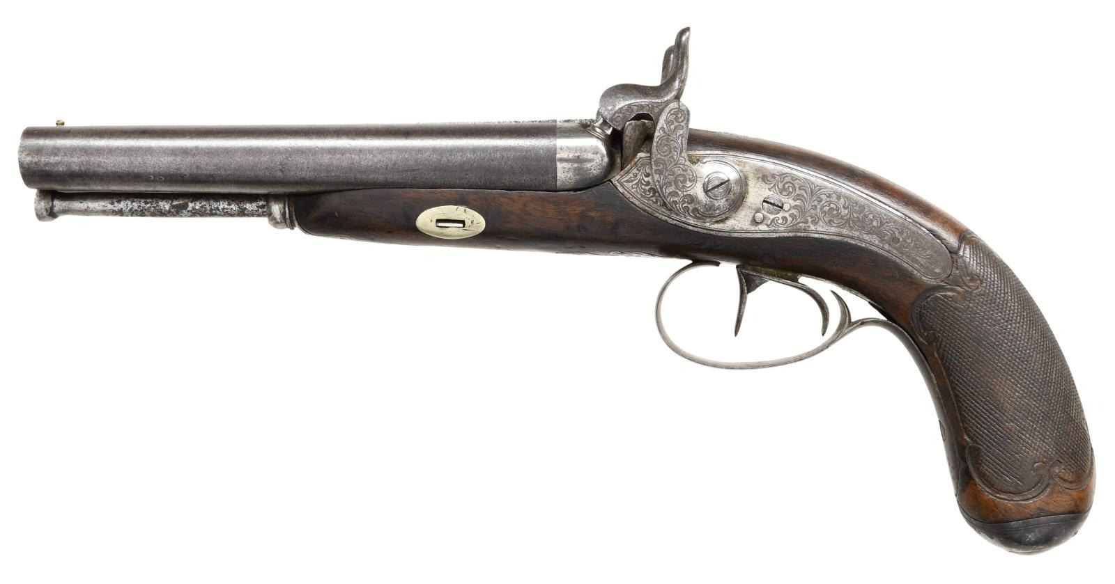 Cal. 20 Bore (.62). NSN. 12" overall, 6" Damascus barrels with central rib, engraved back action locks, engraved steel furniture including patent breech, checkered bag grip with trap door for caps, heavy iron loading rod. Double barrel holster pistols like these were popular among military officers prior to the development of revolvers. These pistols get their name from use on safaris, when carried in "howdahs" which were fancy canopied elephant mounted saddles, these could come in handy if a lion attacked. Jefferson Davis mentions carrying one in his early military campaigns of the 1830s and he quite fond of it when it was captured during Civil War. That similar howdah pistol was for many years on display at the Mississippi State Museum when returned from US Government. CONDITION: Very good overall, complete and original, no apparent restoration, good engraved panels, traces of damascene design on barrels, stock has hand worn patina, mechanically fine, clear smooth bores. (01-23152/JS). ANTIQUE. $1,000-1,500.