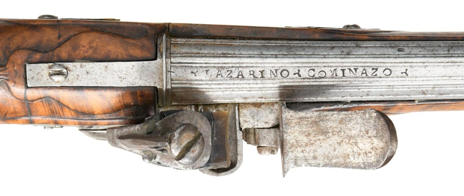 COMINAZO BARREL. Cal. 54. S# NSN. This pistol exhibits very early 18th Century styling with superbly filed 12" tapered multi fluted octagon to 24 sided barrel with ring transition. Top of barrel is marked "LAZARINO COMINAZO" (famed barrel making family in Brescia in the late 1600's to mid 1700's). Lock with rounded plate is fitted with serpentine reinforced cock with rounded base which attaches to tumbler with internal nut in very early style. Inset pan is very small and rounded. Unbridled friction frizzen is nicely file decorated on back and has grotesque head on stop. Feather spring with file decoration has foliate finial. Lock is unmarked inside and out. There is some scroll engraving on face of cock and tail of lock. Stock of burl figured olive wood (?) is iron mounted and extends to muzzle with horn tip and is pinned to barrel. Raised mouldings are around lock, two piece sideplate, ramrod channel and barrel tang which has a foliate finial. Flared knob grip cap is deep relief engraved with scroll and floral highlights. This treatment extends to trigger guard bow. Sideplates are engraved flat steel with piercings in the form of coiled dragons. Old replacement hickory ramrod mounts through single multi beaded pipe. CONDITION: good. All metal cleaned to silvery gray with some light pitting. Wood with old refinish shows sharp edge wear. There are repaired cracks through center of lock area and through barrel channel with evidence of some work being done toward muzzle. Bore is lightly pitted, but mostly shiny. Lock is operable. (01-23463/MGM). ANTIQUE. $1,500-2,500.