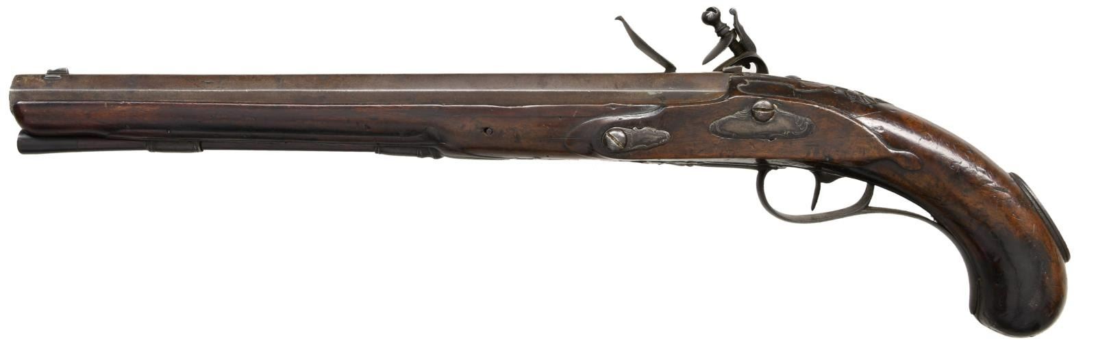 PISTOL CARBINE. Cal. 58. S# NSN. The rifled 13" tapered octagon barrel is fitted with "V" notch rear and blade front sights. Early style lock with slightly arched rounded plate has rounded serpentine cock, inset rounded pan, unbridled friction frizzen and nicely file decorated frizzen spring having large bulbous finial with teat. Lock is fitted with sliding safety at rear. European walnut full length stock is pinned to barrel and is iron mounted. There are raised mouldings around lock, two piece sideplate, barrel channel and trigger guard. There is stylized relief shell carving around barrel tang. There is no grip cap. Trigger guard with foliate finial has long transition into grip. Sideplates are nicely relief chased. There is a large iron boss at rear of grip with socket attachment for shoulder stock (not present). Rosewood ramrod with horn tip mounts through beaded iron pipe and matching thimble. CONDITION: good. Iron parts are a uniform dark brown lightly pitted patina. Wood presents good hand worn surfaces at butt and is sound through lock area and toward forend, however last 3" of fore piece and tops of barrel channels on both sides are replaced for another 3 to 4 inches. Repair is well done and fairly hard to spot. Straight rifled bore is lightly pitted. Lock will not hold at full cock and safety does not engage. Sear spring repaired with piece of coil spring. (01-23465/MGM). ANTIQUE. $2,000-3,000.