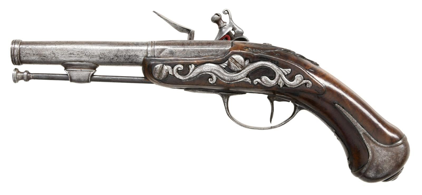 Cal. 50. S# NSN. The 5 3/4" shaped octagon to round barrel with cannon turned muzzle is unmarked. Early type lock with arched and rounded plate is fitted with serpentine cock, inset rounded pan, unbridled friction frizzen and feather spring with ball and spear finial. European walnut short stock has mouldings around lock, sideplate, trigger guard and barrel tang. Iron mounts include knob grip cap with central boss and side spurs, trigger guard with teardrop finial and early style relief filed serpentine scroll sideplate. Steel ramrod mounts through nicely shaped beaded pipe soldered to bottom of barrel. CONDITION: good. Metal parts cleaned to silver gray over considerable pitting. Wood with considerable hand wear to old finish is sound. Bore is pitted. Lock is fair will not cock correctly. (01-23476/MGM). ANTIQUE. $1,500-2,500.