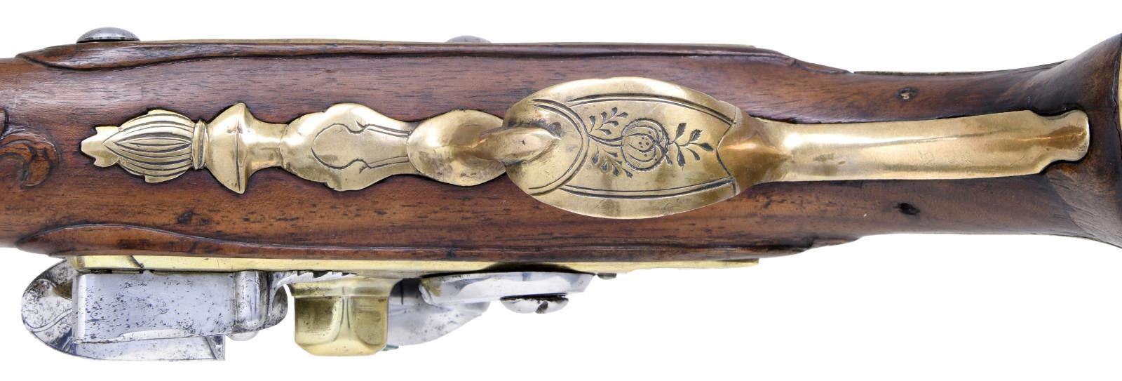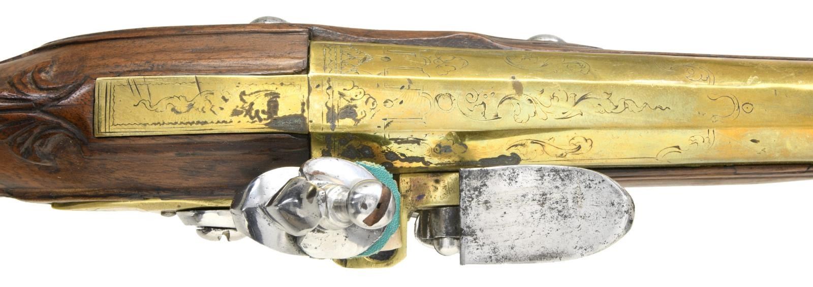 Cal. 60. NSN. Bbl. 9" brass. Brass flintlock pistol of unknown origin. Lock marked "V.F.P.". Brass lock & furniture. Iron hammer & frizzen. Bbl., sideplate & bottom metal have floral engraving. Lock appears sluggish but functional. Hardwood stock w/ floral carvings. Iron ramrod w/ brass tip. CONDITION: stock appears lightly sanded w/ a splice repair above grip cap, a couple other modern filler repairs on grip frame, another repair below bbl., a small crack above sideplate, scattered dings & handling wear. Iron parts were cleaned brightly & show oxidation & pitting. Brass also cleaned bright w/ scattered oxidation most notably at muzzle & some light dings. Oxidized bore. (01-24090/MJC). ANTIQUE. $1000-1800.