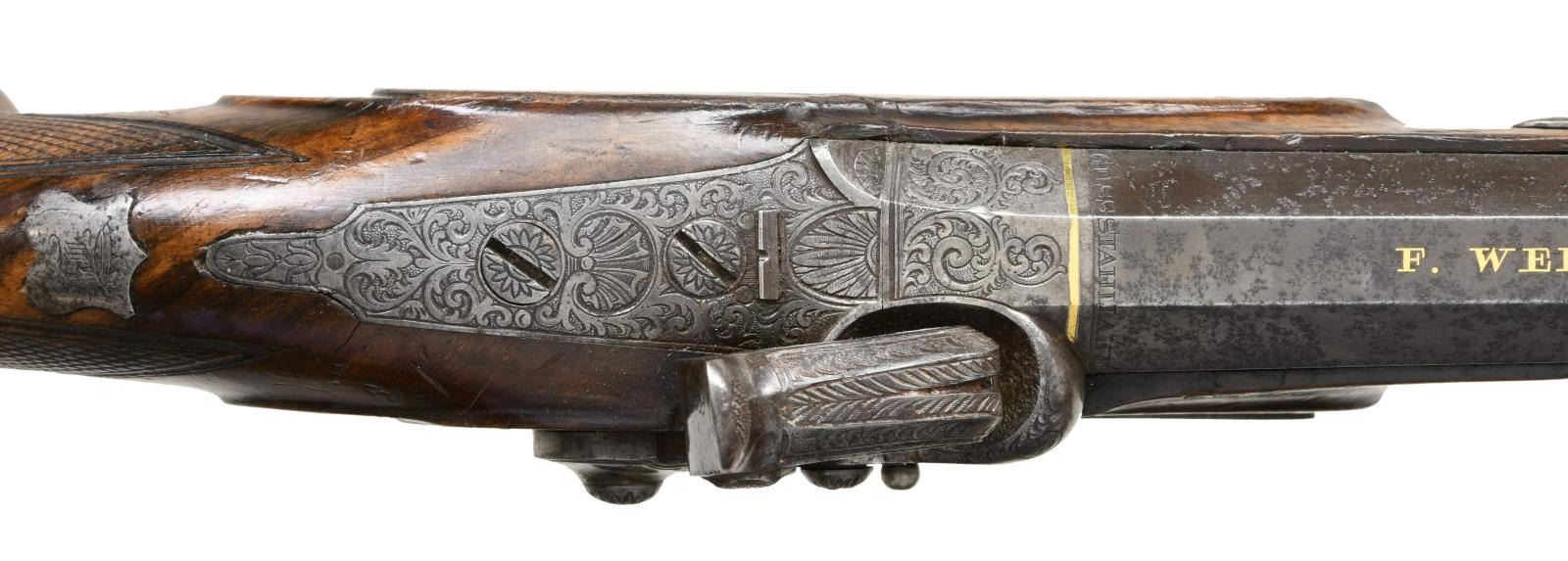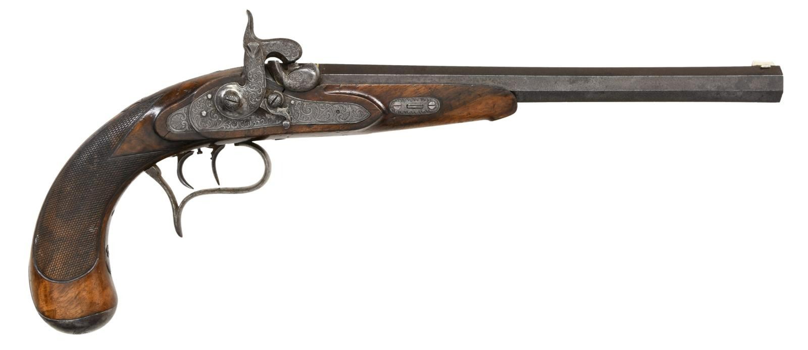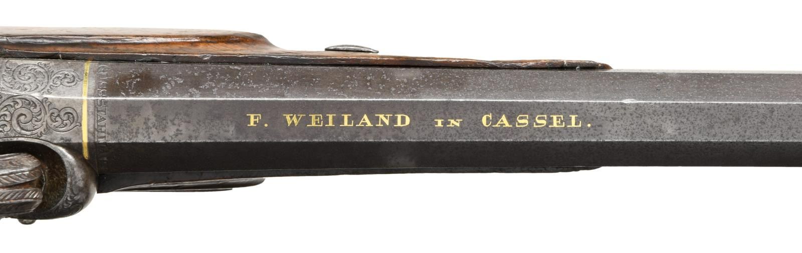 FRIEDRICH WEILAND. Cal. 41. NSN. Bbl 10 3/8". Produced by Friedrich Weiland (1828-1861) of Cassel, Germany. The full length browned octagonal barrel is marked "F. WEILAND IN CASSEL." in gold characters over the top flat, with a gold band at the breech below, "GUSS" (left flat), "STAHL" (top flat), and "LAUF" (right flat) (CAST STEEL BARREL) engraved at the breech. The lockplate, cock, breech, barrel tang, and the pommel cap all feature beautifully executed scroll engraving on a fine punch dot background, with the tail of the lockplate and the barrel tang both exhibiting a shell motif. Iron trigger guard is engraved a with panoply of arms, and terminates in a floral motif finial. Wood stock with checkering at wrist and an escutcheon engraved with a Crown/B that is inlaid to the rear of the barrel tang. German silver front sight, with integral frame U-notch rear sight, and double set triggers. CONDITION: metal components exhibit a gray patina, with spots of darker discoloration overall. Barrel retains much of its finish, with spots of oxidation overall. Stock exhibits scattered marks and impressions from storage and handling, with cracks present at the lockplate, right side of barrel tang, left side at breech, as well as on the left side of the forend. An extremely attractive German percussion pistol by Friedrich Weiland. (01-23937/MLW). ANTIQUE. $1,000-1,500.