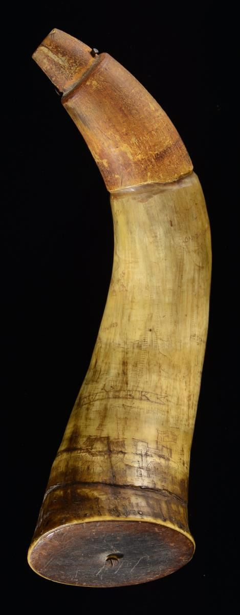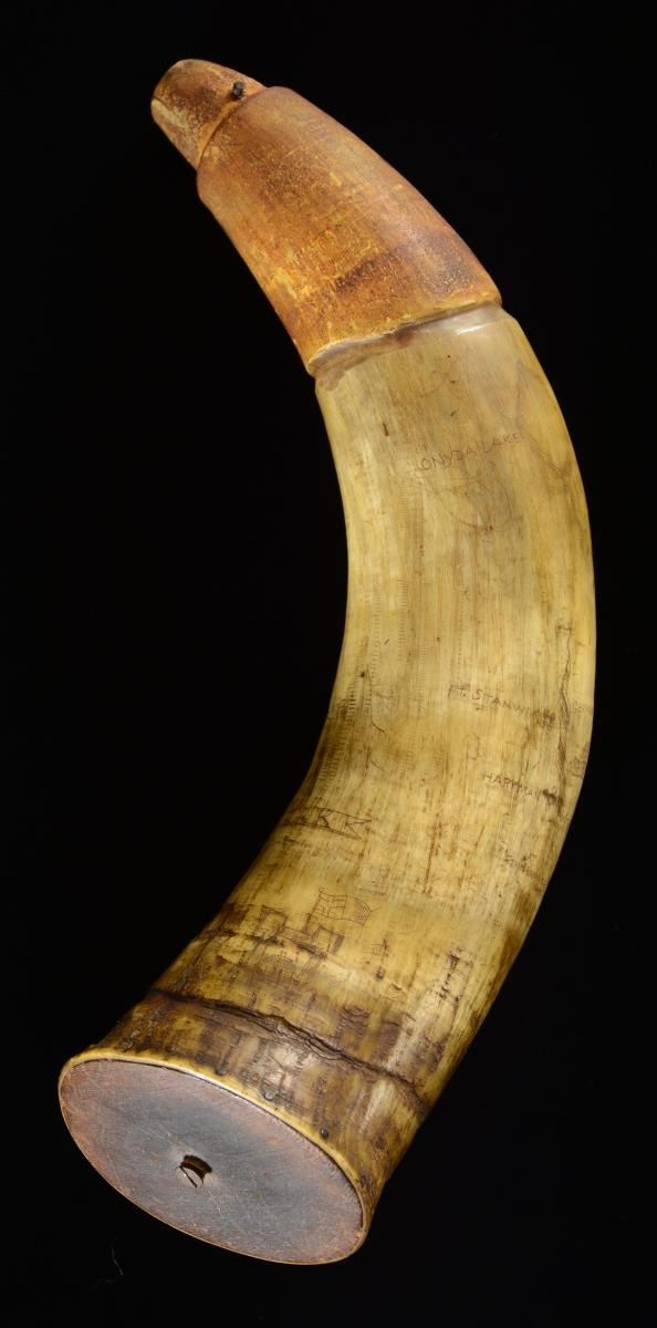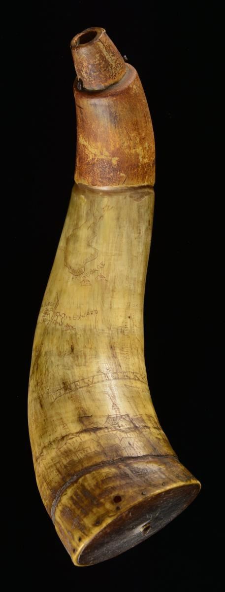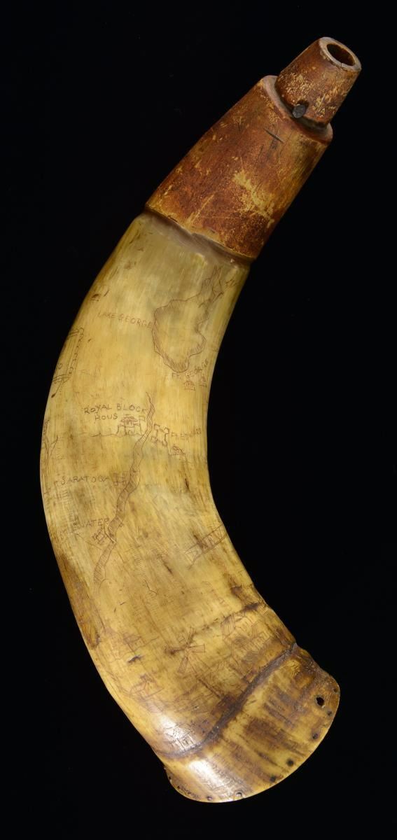 This powder horn measures approx. 11 1/2" in length and 3 1/3" across at the butt. This is an example of an old horn that has been engraved in modern times, likely by a reenactor to increase the aesthetic of the horn. The horn depicts a town near the butt that likely represent New York. There is a map over the body of the horn that shows various places, including Fort George, Lake George, Fort Edward, Fort Stanwicks, Fort Henry, and more. There is a panel above an Indian that reads "T.P. 1760". CONDITION: the horn shows both real & recreated age and remains quite solid. PROVENANCE: From the Collection of James B. Taylor. (02-19892/BF). $200-400.