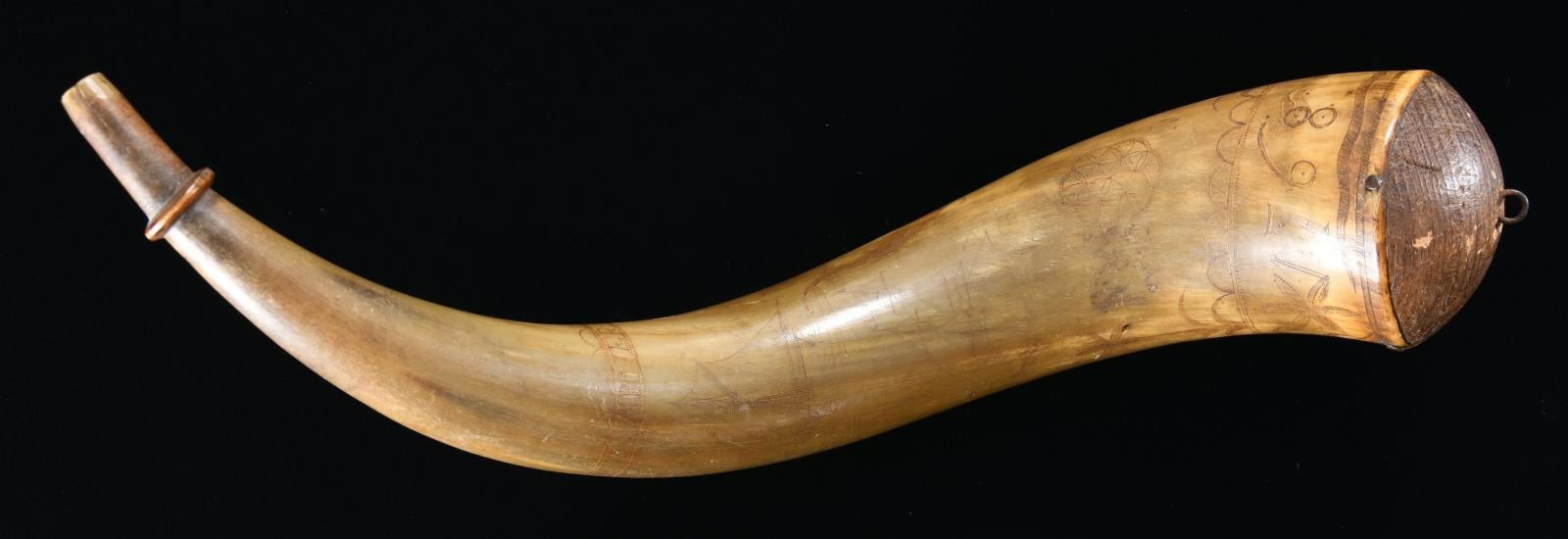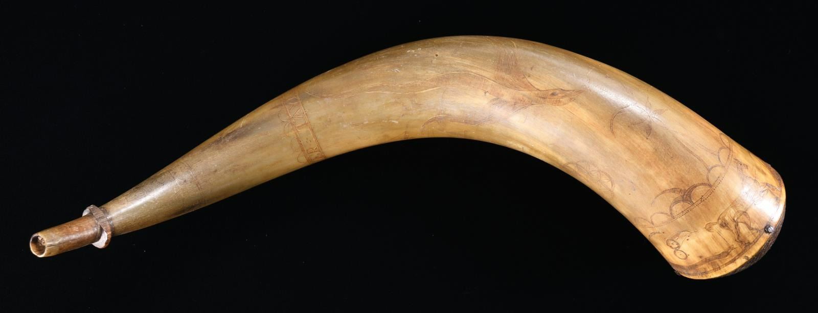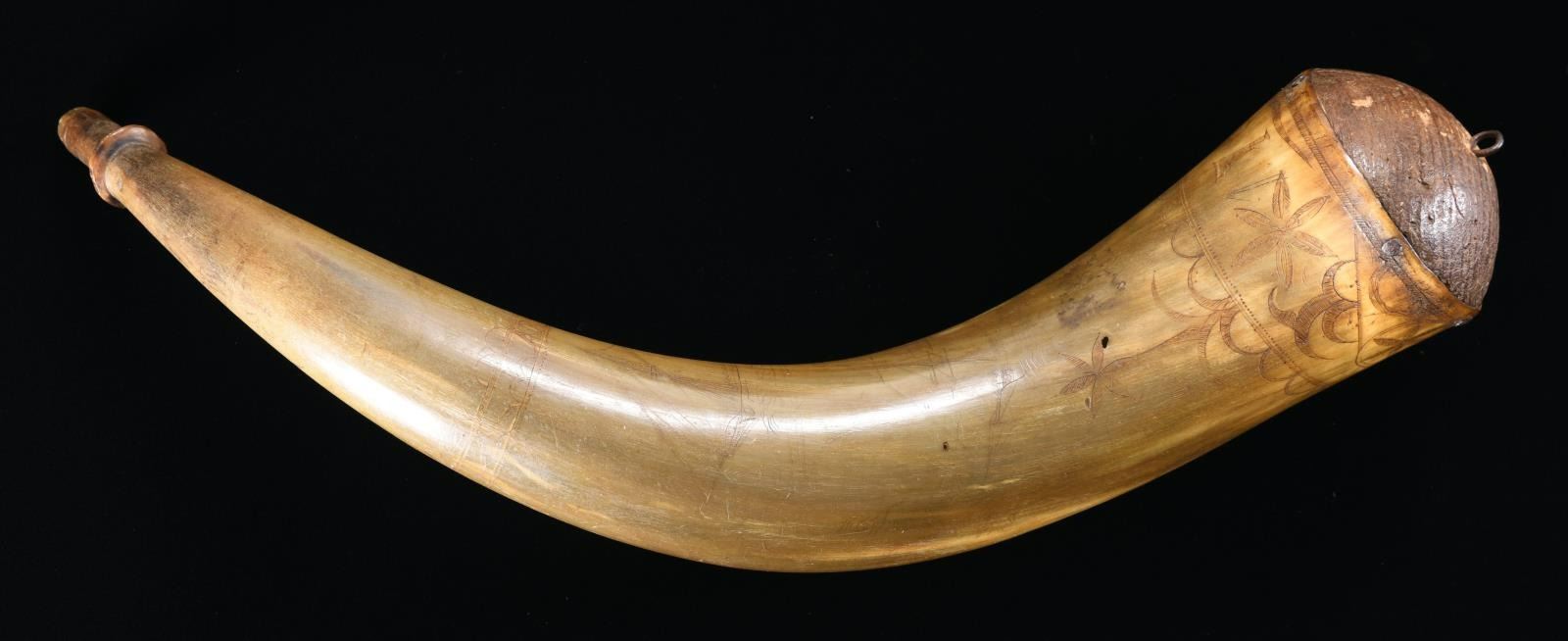 Lot 3664 EARLY AMERICAN CARVED POWDER HORN BELONGING TO