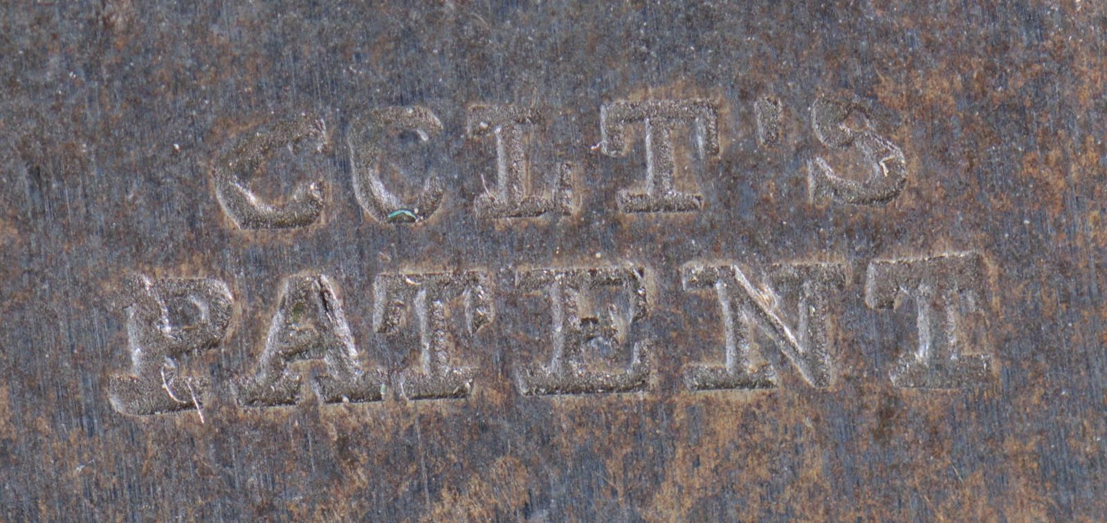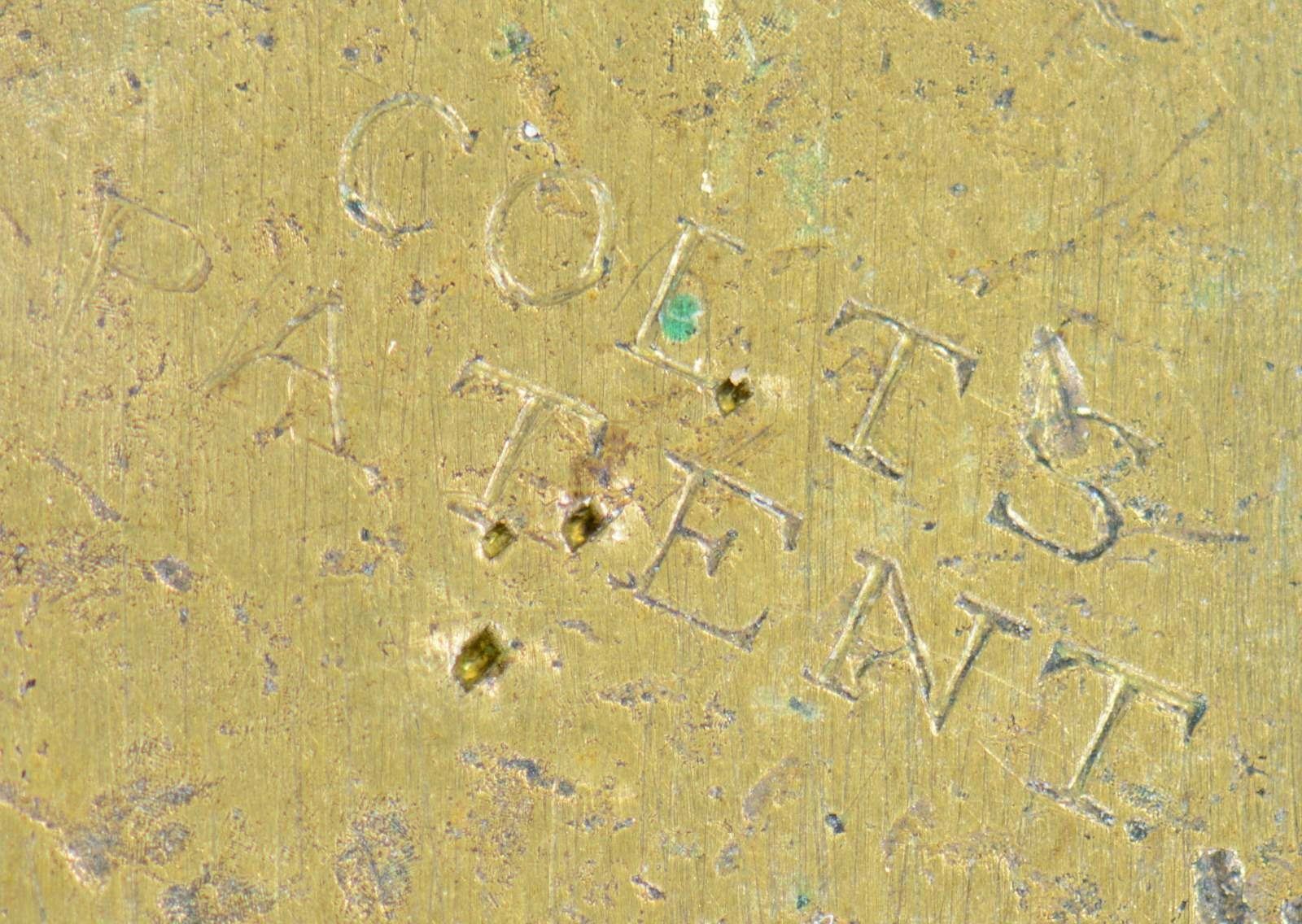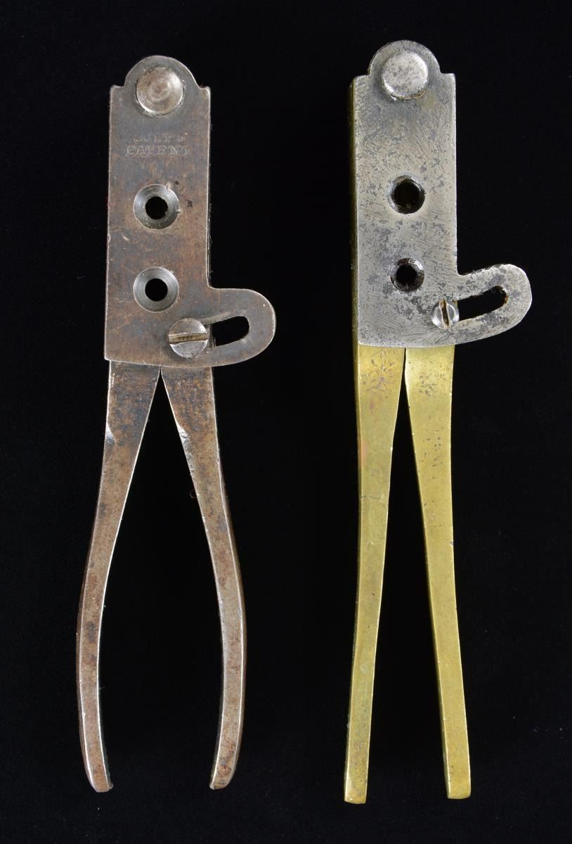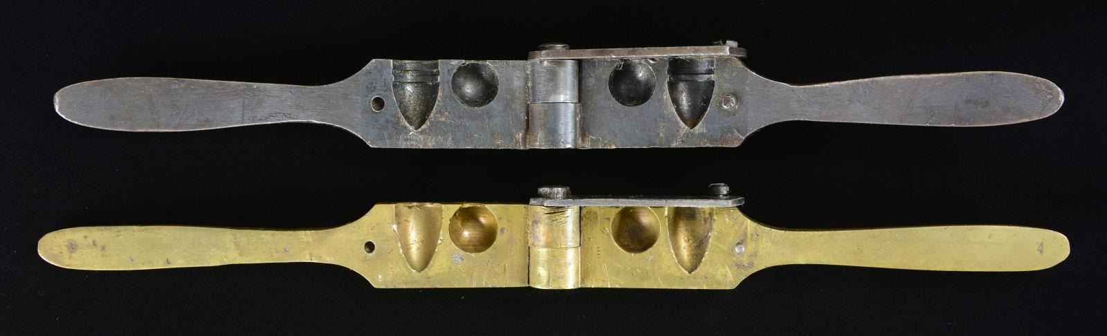 1. 1st model Colt dragoon mold (M6 in Rapley), brass 2-cavity mold for round ball & conical with no grease groove or heel. Stamped in brass at a slant "COLTS PATENT" & "WAT" inspection. Good overall, "319" inscribed on one handle, markings discernible, numerous small dings & scratches, iron sprue cutter has old filing marks. 2. 3rd model Colt dragoon mold (M10 in Rapley), steel 2-cavity mold for round ball & conical with grease groove & heel groove. "COLTS PATENT" stamped on sprue cutter, small "D" inspection stamp on side. Very good overall, retaining 20-30% thinning blue finish. (02-20971/JS). $600-800.