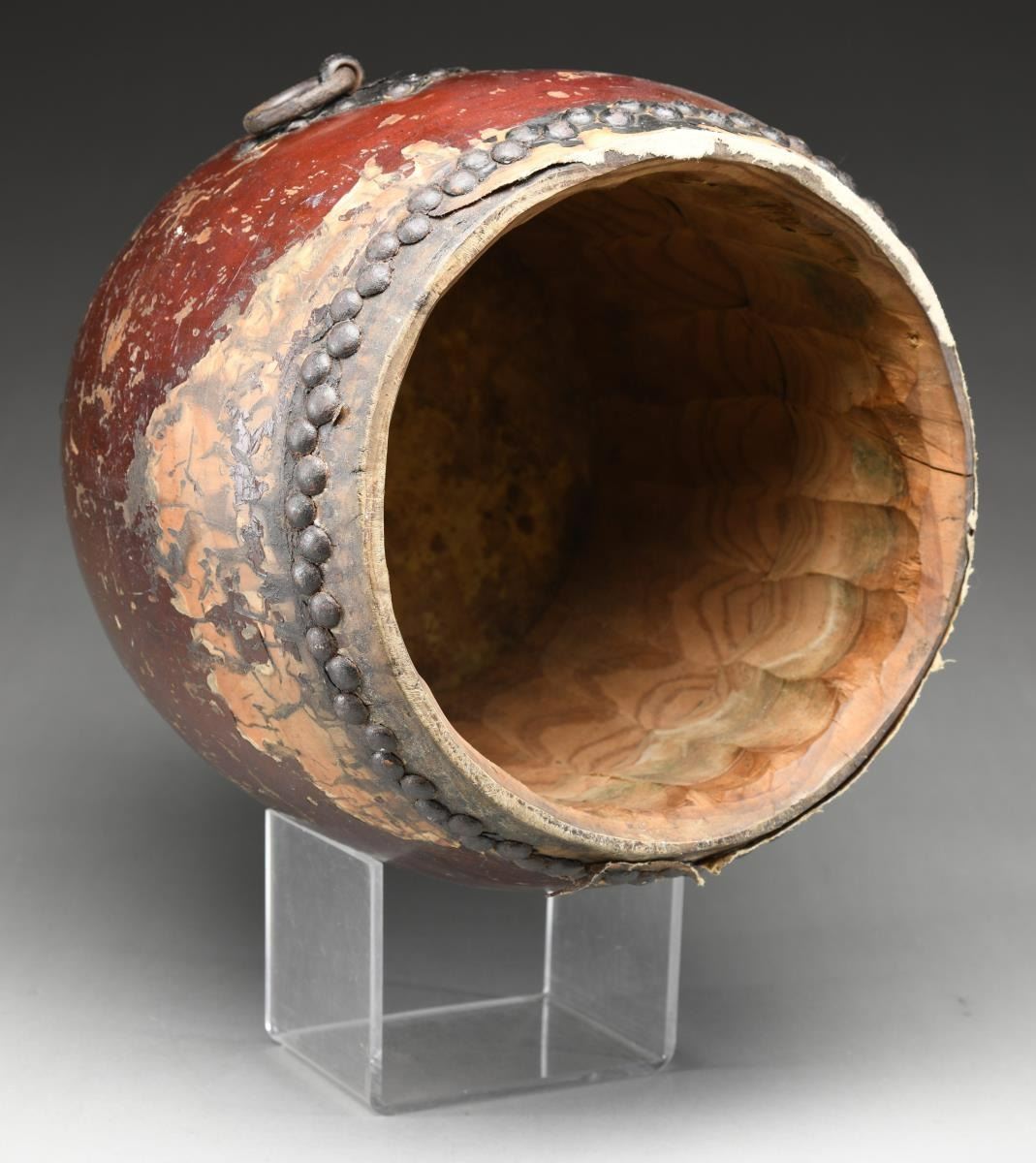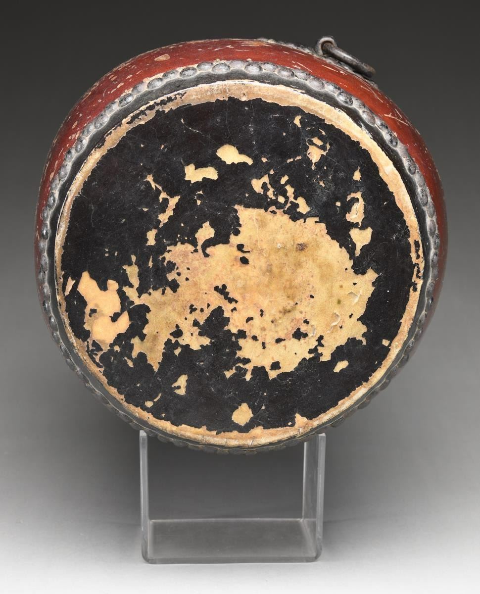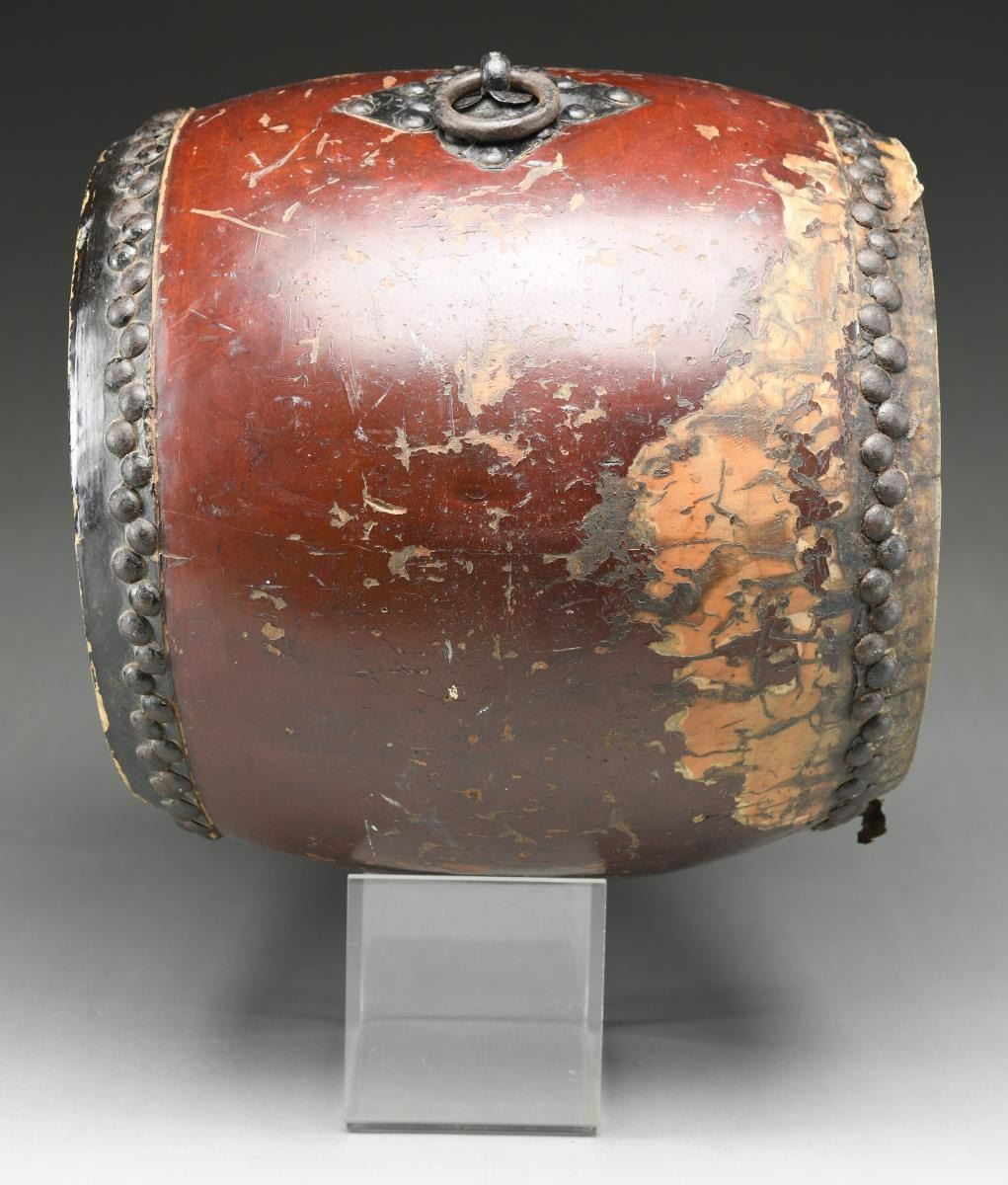The O-daiko is a traditional Japanese barrel drum played in temples and orchestras particularly during festivals. The O-daiko is thought to originate in Japan around the year 600. This example has a deep red & black painted keyaki wood body with a black lacquered cowhide top. The skin on the bottom is missing. Both skins are held on with iron tack decoration, as is the central square boss & ring. It is said that, originally, drums like this were placed near the village gate to sound alarms during emergency or attack. As many years passed without the drum being used, chickens began to live inside the drum, giving birth to the O-daiko as a symbol of contentment & peace. CONDITION: there are numerous scrapes & scratches to the body of the drum. The top skin has significant losses to the black enameled finish, and the bottom skin is missing. (02-19750/BF). $500-800.