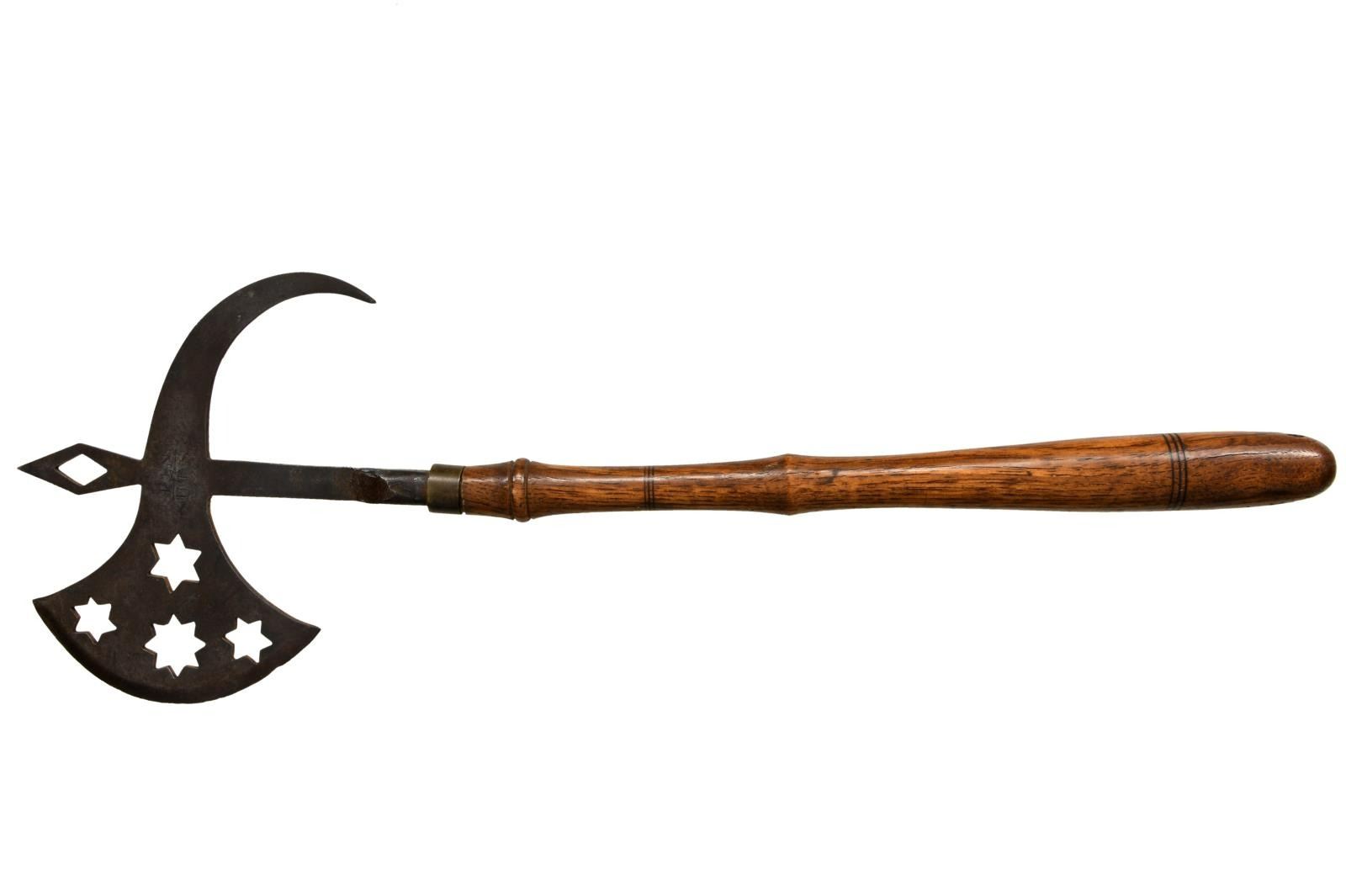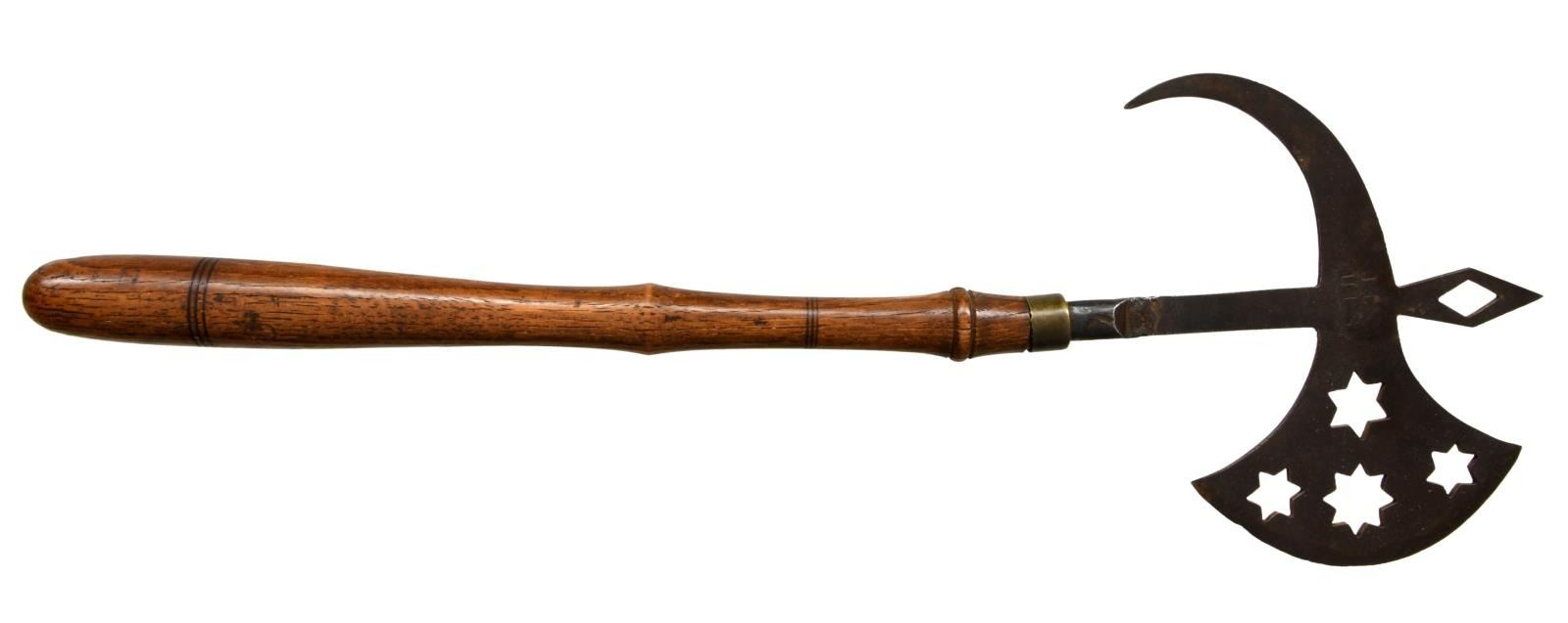 Overall length: 14 1/2", including a 9 3/4" haft. This superb halberd is actually stamped "JN" over "US" with an irregular border on both sides of the head. The 3 3/8" blade has three 6-pointed stars and one 8-pointed star cut out of the body. The beak is a downturned flattened spike, and the point has a diamond shaped cutout. It is impossible to know why this miniature halberd was produced. However, it may have been a presentation piece for John Newbury, who was a US inspector of arms starting in 1818. This halberd is exceptionally well-made and would likely benefit from some in-depth research. CONDITION: head has a dark, smooth patina overall. The haft is undamaged and has a wonderful mellow patina. (02-19793/BF). $600-800.