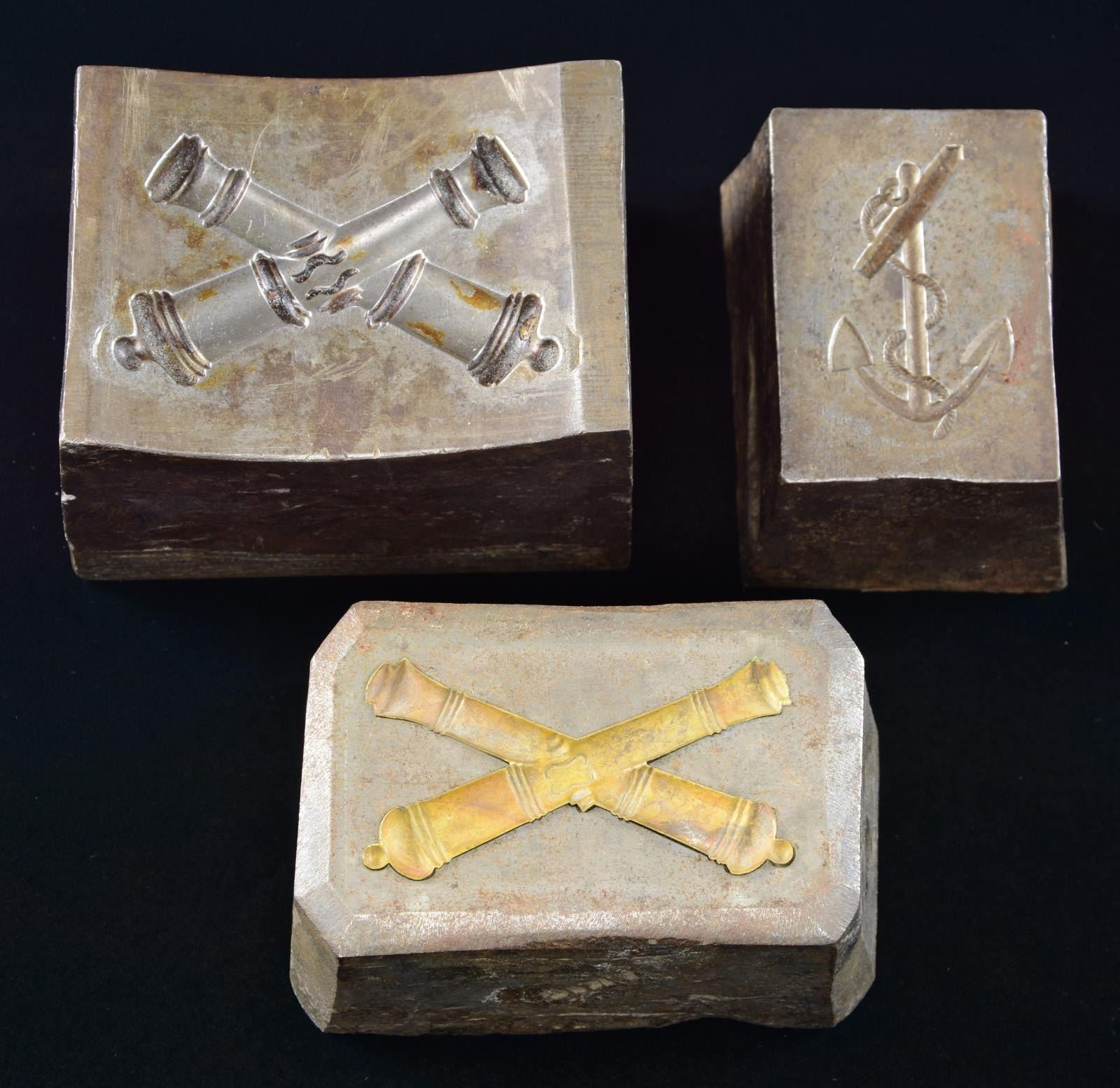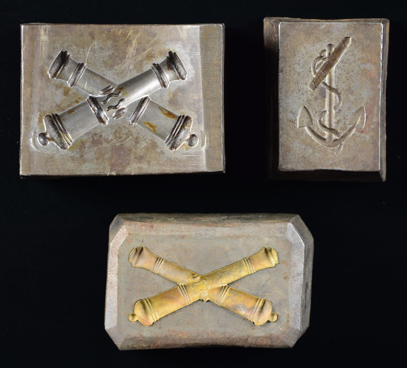 1) ARTILLERY. An 1834 to 1851 heavy iron die for an Artillery crossed cannons hat insignia. The die measures approx. 4 3/8" x 3 1/4" x 3" and is slightly trapezoidal in form. The top of the die is cupped in order to stamp a curved insignia to more neatly fit curved hats. CONDITION: light wear overall with superficial light oxidation. 2) ARTILLERY. An 1858 to 1872 heavy iron die for an enlisted Artillery crossed cannons hat insignia. This style of insignia was in use by all Union Artillery Forces during the Civil War. The die measures approx. 4 3/4" x 2 3/4" x 2 1/2" and is trapezoidal in form. The die is heavily stamped "A.McG" on the front & rear. The die comes with an original brass stamping of the insignia for display. CONDITION: die shows light wear with superficial light oxidation. 3) NAVY. A circa 1840 to 1865 US Navy fouled anchor insignia, as used on epaulets denoting the rank of Commander. The die measures approx. 3 1/4" x 2 1/4" x 2" and is trapezoidal in form. The anchor itself has an angled stock with a coiled rope extending past the arms & flukes. CONDITION: die shows light wear with superficial light oxidation. (02-19947-2/BF). $1,500-2,500.