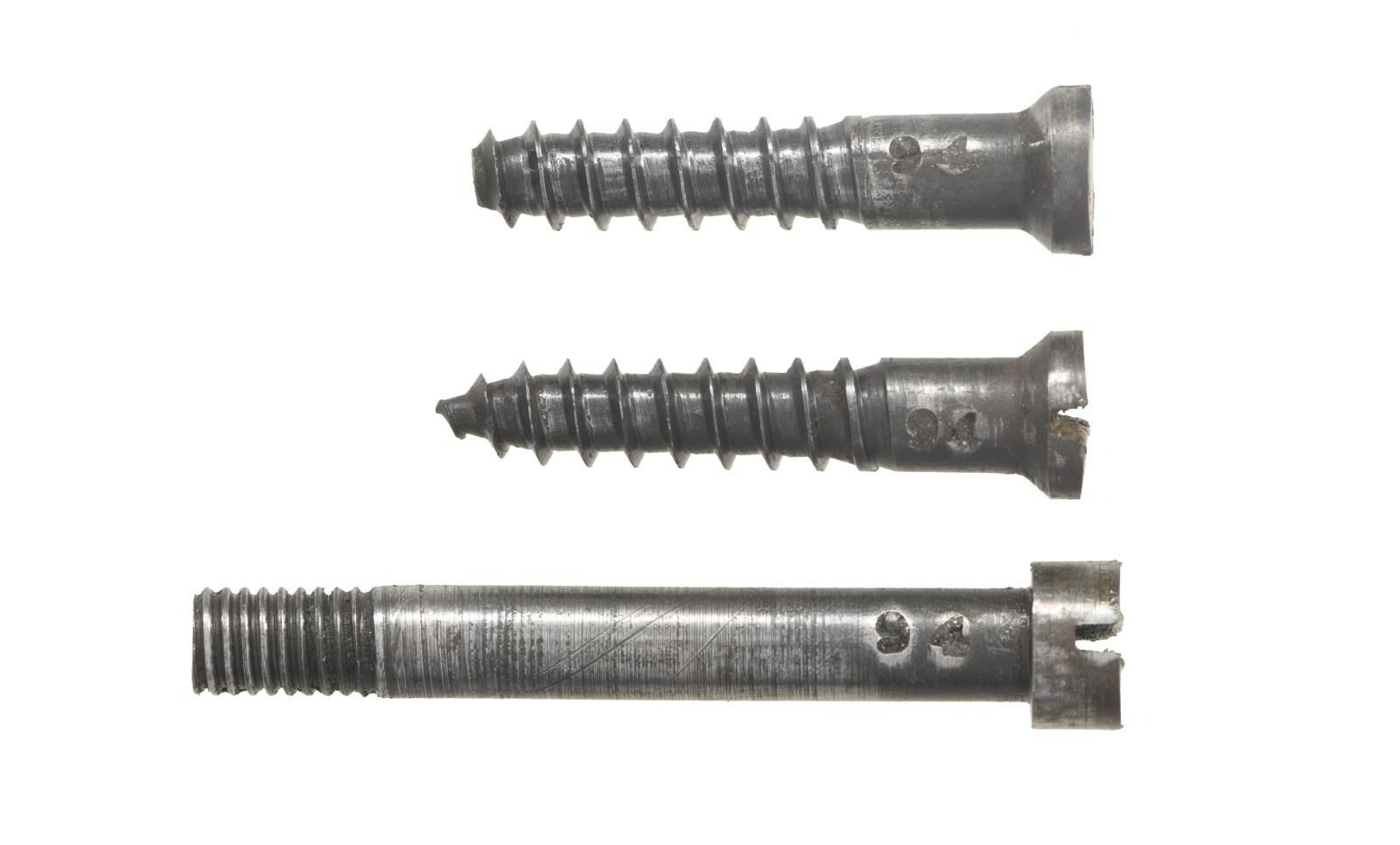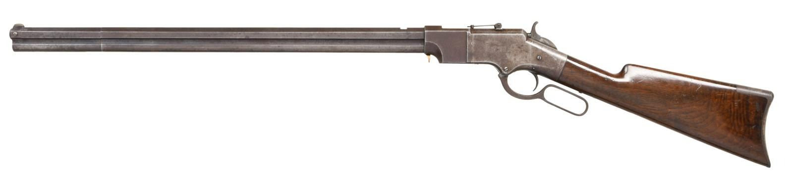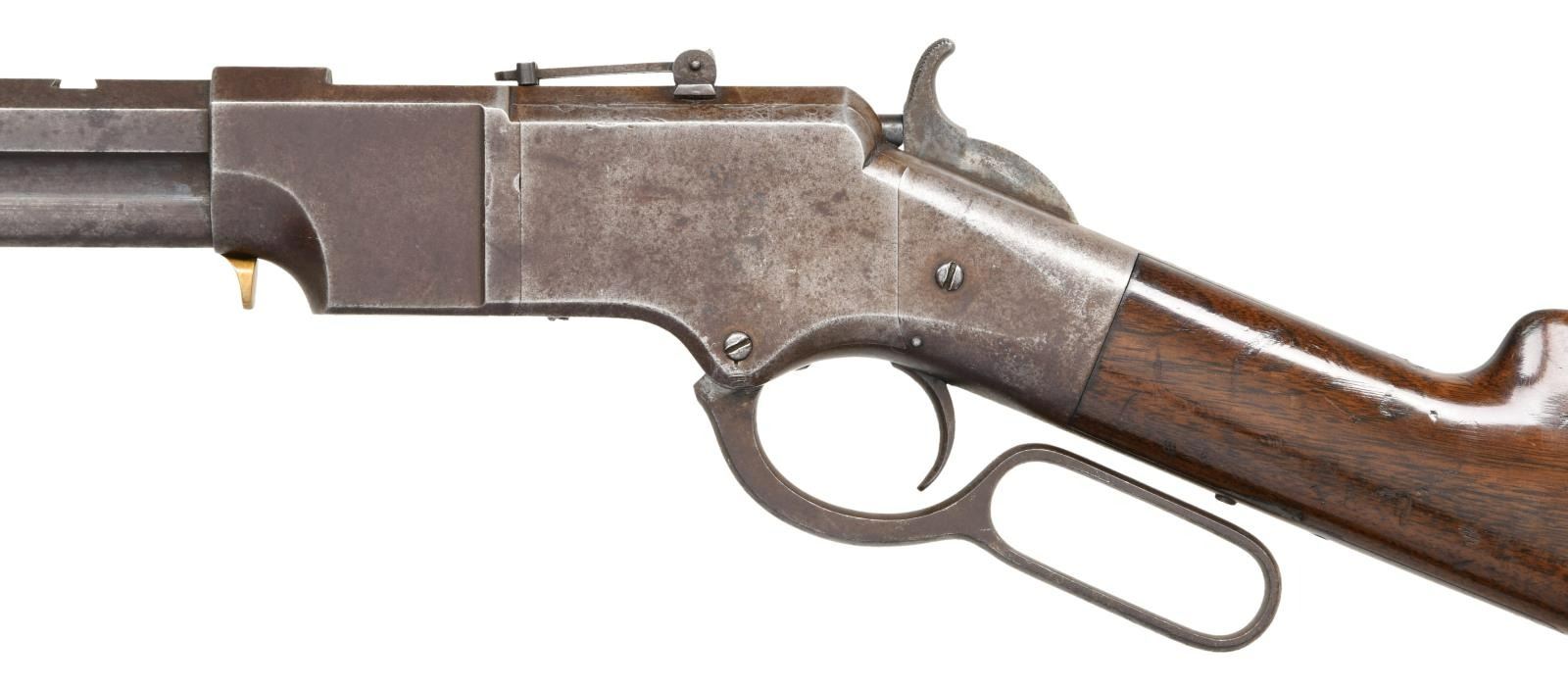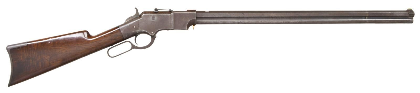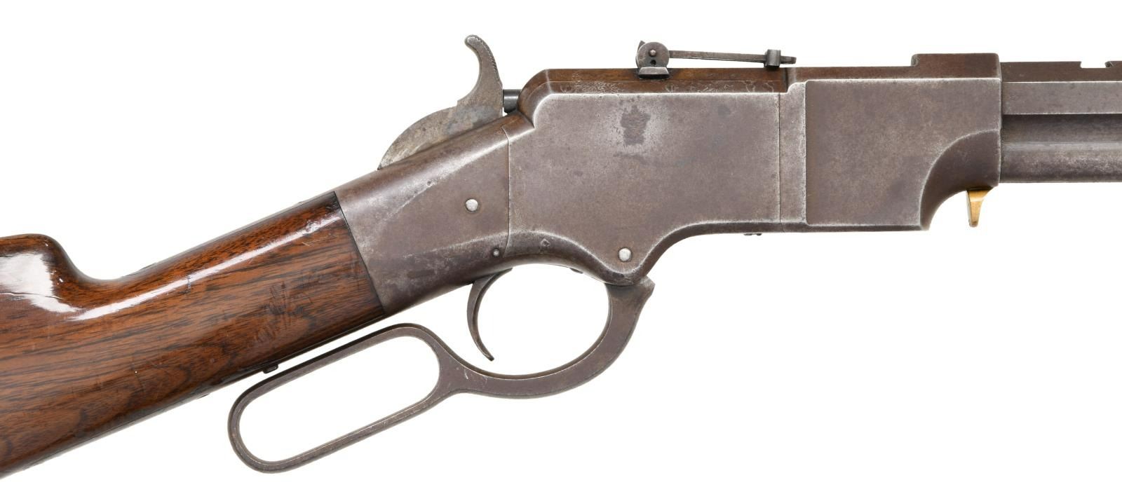 RIFLE. Cal. 44 HRF. S# 94. The Henry was a revolutionary repeating rifle introduced at the time of the US Civil War. The Iron Frame Henry is the scarcest & most desirable variation. Estimated quantity of 275 were produced in S# range 1-400. Bbl. 24" octagon w/ integral mag. tube. Shroud at front of bbl. rotates for loading. Brass blade front sight, open dovetail on bbl. w/ sporting leaf rear sight mounted on receiver dovetail. Straight grip stock of nicely grained walnut is fitted w/ the early style rounded toe iron trapdoor buttplate. Left inside of lower tang & top tang channel of stock have matching S# 94. All stock & buttplate screws have matching numbers. UNATTACHED ACCESSORIES: 4 piece cleaning rod held in stock compartment. CONDITION: metal has a heavy brown patina showing spots of corrosion & handling marks w/ series of dents around the top edges of both side plates. Stock has mildly worn finish showing numerous scratches, & marks. Small chips are found around both sides of lower tang. Smooth mechanics. Bore retains largely intact rifling showing scattered pitting. (01-24170/DS). ANTIQUE. $80000-100000.