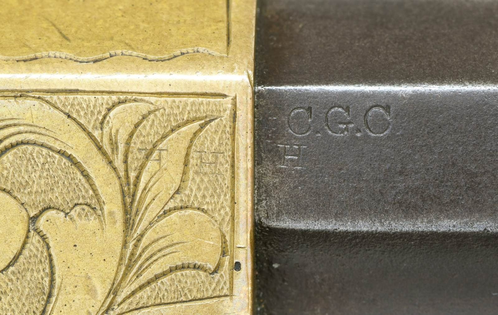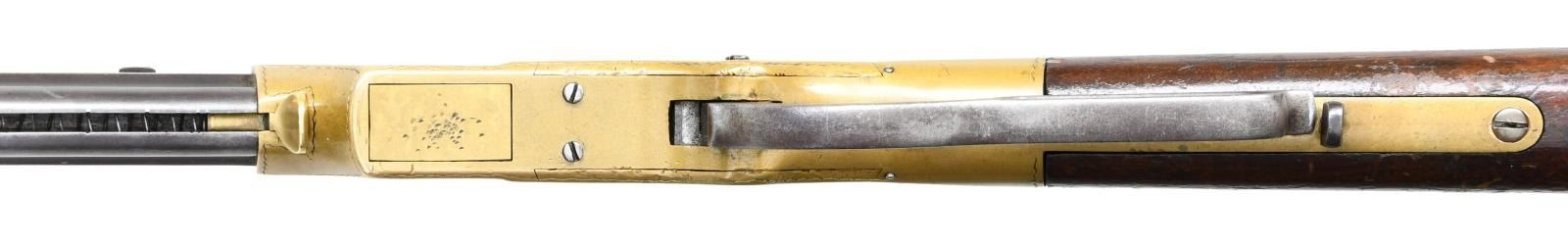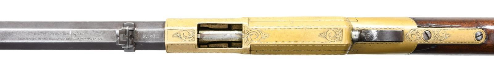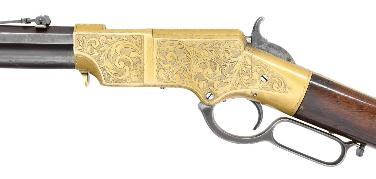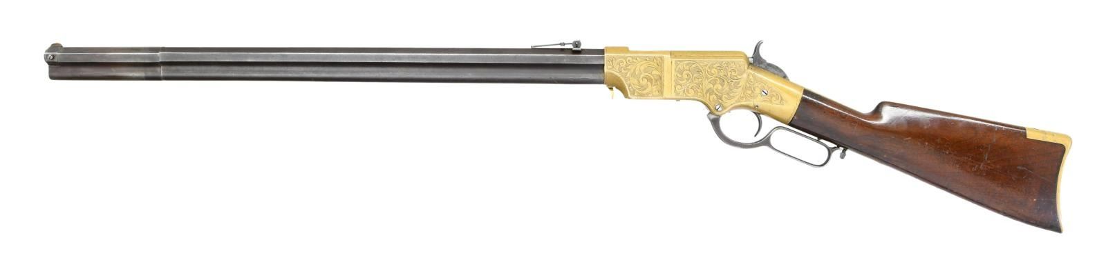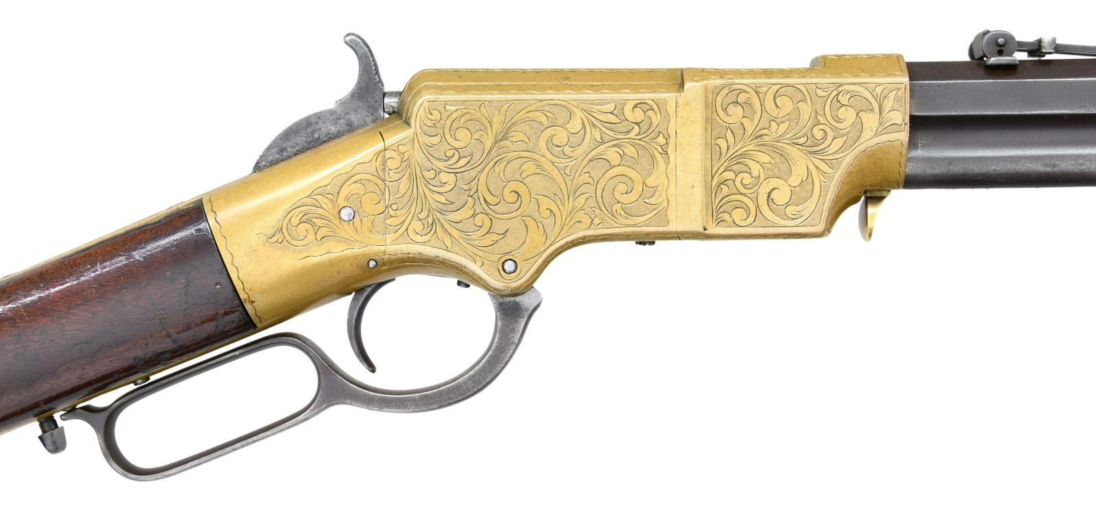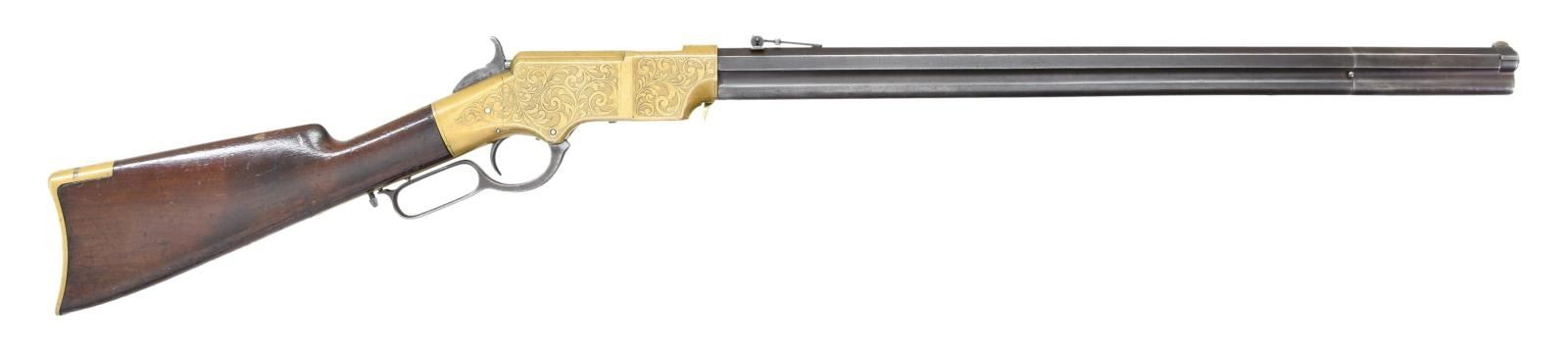 ENGRAVED REPEATING RIFLE. Cal. 44 Henry Rimfire. S# 3056. Bbl. 24" octagon with integral mag. tube. Bbl shroud rotates for loading. Brass blade front sight with graduated leaf rear sight. Left bbl. flat has U.S. sub inspectors Charles G. Chapman initials "C.G.C." over "H". Most of the 1731 rifles acquired by the government between 1862 and 1865 were in the S# range 3000-4200. Many were issued to the 1st Maine & 1st District of Columbia cavalry regiments. Brass action has generous coverage of custom added vine type foliate scroll with stippled backgrounds having straight line & wavy borders. Early style brass trapdoor buttplate has complimenting engraving at the heel. The straight grip walnut stock without swivel has a slight perch belly. UNATTACHED ACCESSORIES: binder containing 16 pages of photos & descriptions of this rifle as well as reprinted material pertaining to martially marked Henry rifles. CONDITION: very nice Civil War rifle. Barrel & mag. tube have an attractive patina appearance with small dents & marks. The brass exhibits a very pleasing mild patina. The stock finish appears to be original showing scratches, marks and small dents with spots of finish wear. Action functions smoothly. Dark bore retains partially visible rifling. (01-23329/DS). ANTIQUE. $30,000-40,000.