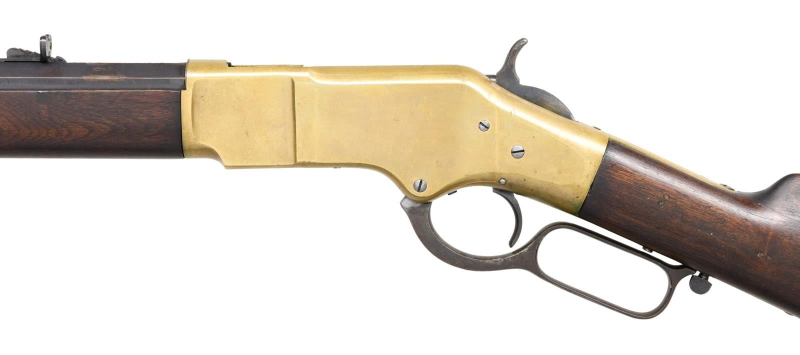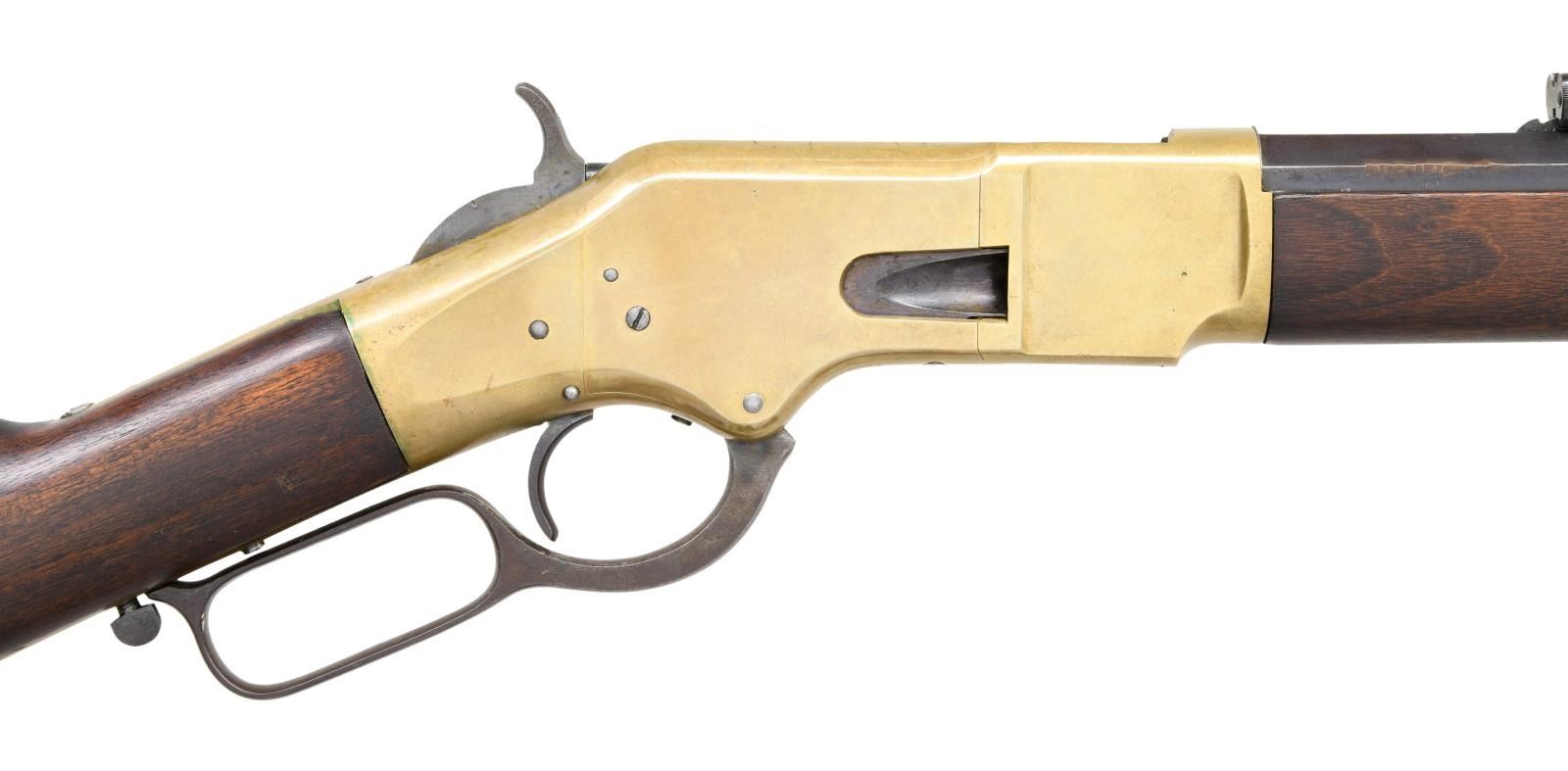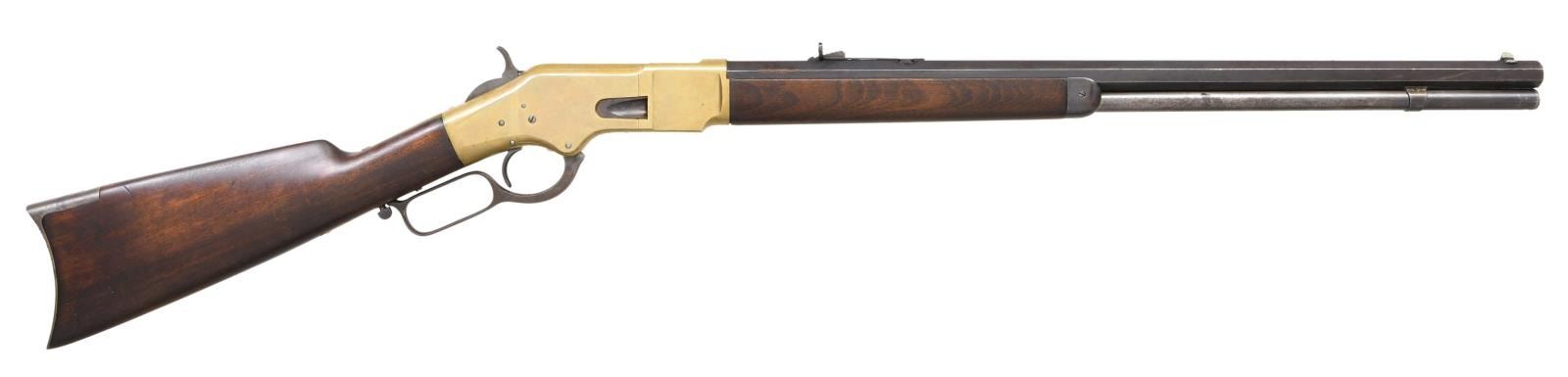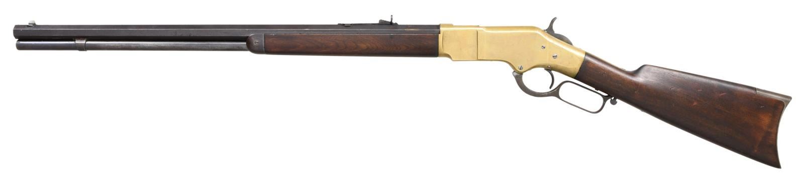 LEVER ACTION RIFLE. Cal. 44 WRF. S# 170079. Bbl 24 3/8". Model 1866 lever action rifle manufactured by Winchester in 1898. The top of the barrel is stamped with Winchester's 2 line address, with "44 R.F." stamped over the top at the breech. Brass frame with full length blued octagonal barrel and magazine tube. Magazine tube appears to have been reattached at one time and barrel retains a thin washer at the breech. Crescent iron buttplate and iron forend cap. Smooth plain wood straight grip buttstock, with smooth wood forend. Stock exhibits a matching assembly number "2709" to the frame on the interior of the upper tang channel. Wood furniture appears to have been lightly sanded and revarnished at one time. Dovetailed German silver blade front sight with dovetailed semi-buckhorn V-notch rear sight. UNATTACHED ACCESSORIES: original "1-19-95" dated invoice from David's Firearms, Ltd. of Gray, ME. CONDITION: brass frame retains a pleasing mellow patina overall, exhibiting some scattered marks from handling and storage. Barrel exhibits wear and thinning overall that shows through to a pleasing brown patina, with some marring on the edges around the breech, seemingly from disassembly. Magazine tube retains a mostly gray patina, with areas of darker discoloration overall. Very bright bore, exhibiting some scattered areas of pitting and retaining strong rifling throughout. Wood furniture shows some scattered marks and minor impressions from storage and handling, but is otherwise very good overall. Stock exhibits a repair on the interior of the tang channel, with a section having been replaced and attached via an adhesive, with only the top half of the matching assembly number remaining. With standard production serialization ending at 170,100, this rifle makes for a very nice example of one of the last Model 1866 rifles that Winchester produced. PROVENANCE: Collection of Horst Kreiner. (01-24028/MLW). ANTIQUE. $3,000-5,000.