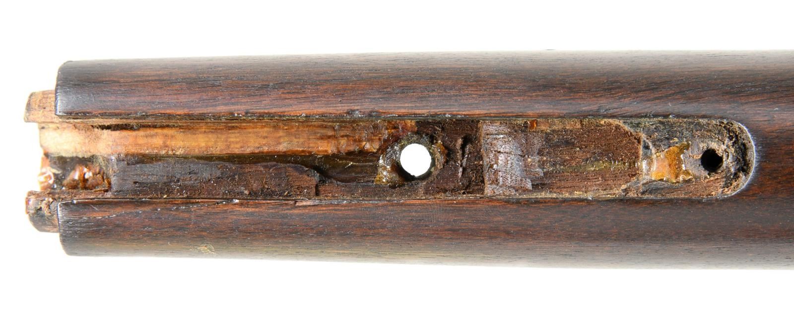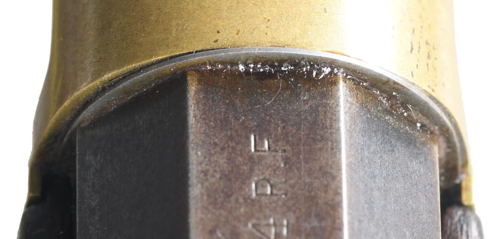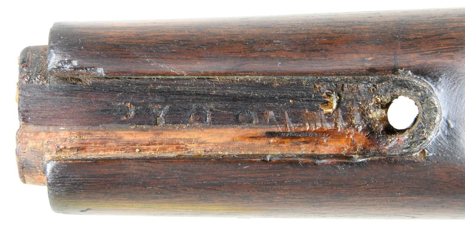 LEVER ACTION RIFLE. Cal. 44 WRF. S# 170079. Bbl 24 3/8". Model 1866 lever action rifle manufactured by Winchester in 1898. The top of the barrel is stamped with Winchester's 2 line address, with "44 R.F." stamped over the top at the breech. Brass frame with full length blued octagonal barrel and magazine tube. Magazine tube appears to have been reattached at one time and barrel retains a thin washer at the breech. Crescent iron buttplate and iron forend cap. Smooth plain wood straight grip buttstock, with smooth wood forend. Stock exhibits a matching assembly number "2709" to the frame on the interior of the upper tang channel. Wood furniture appears to have been lightly sanded and revarnished at one time. Dovetailed German silver blade front sight with dovetailed semi-buckhorn V-notch rear sight. UNATTACHED ACCESSORIES: original "1-19-95" dated invoice from David's Firearms, Ltd. of Gray, ME. CONDITION: brass frame retains a pleasing mellow patina overall, exhibiting some scattered marks from handling and storage. Barrel exhibits wear and thinning overall that shows through to a pleasing brown patina, with some marring on the edges around the breech, seemingly from disassembly. Magazine tube retains a mostly gray patina, with areas of darker discoloration overall. Very bright bore, exhibiting some scattered areas of pitting and retaining strong rifling throughout. Wood furniture shows some scattered marks and minor impressions from storage and handling, but is otherwise very good overall. Stock exhibits a repair on the interior of the tang channel, with a section having been replaced and attached via an adhesive, with only the top half of the matching assembly number remaining. With standard production serialization ending at 170,100, this rifle makes for a very nice example of one of the last Model 1866 rifles that Winchester produced. PROVENANCE: Collection of Horst Kreiner. (01-24028/MLW). ANTIQUE. $3,000-5,000.