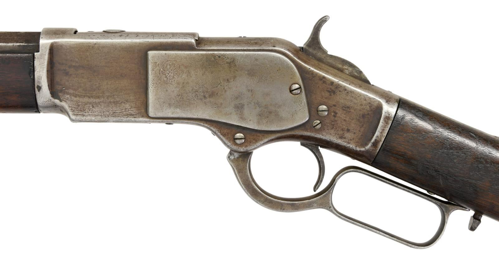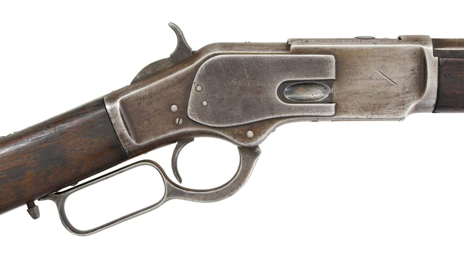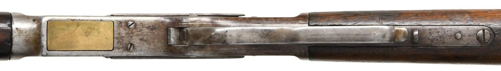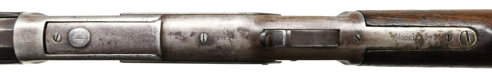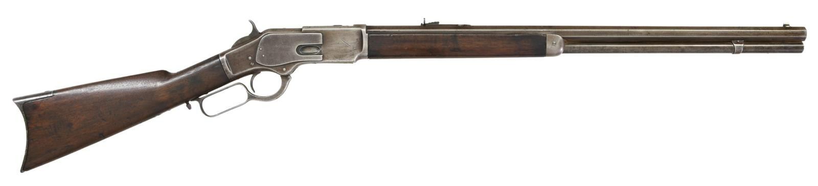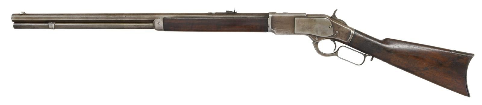 Cal. 44 WCF, (44-40). S# 4439. Bbl. 24" octagon w/ sporting sights. Full length mag. 1st model action w/ raised thumb print mortised dust cover. Walnut forearm & straight grip stock w/ crescent steel trapdoor buttplate. Mfg. 1875. UNATTCHED ACCESSORIES: Cody Firearms record check confirms configuration and list a ship date of June 22, 1875 to order number 3447. CONDITION: metal has a light gray brown appearance w/ areas of light pitting & handling marks. Dust cover thumb print shows checkering wear w/ 3 added cut lines. Wood shows heavy wear w/ dents, scratches & marks. Forearm has small chips around receiver & forearm cap. Functioning action. Bore has dark lightly pitted appearance over intact rifling. (01-23406/DS). ANTIQUE. $2000-3000.