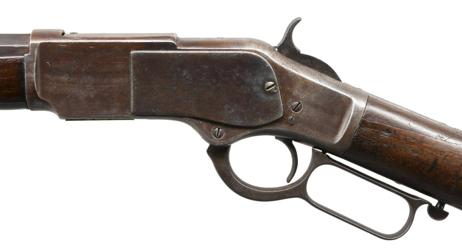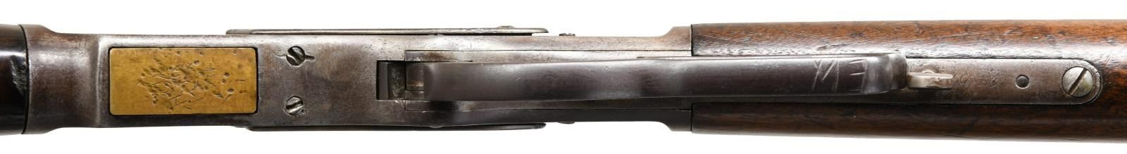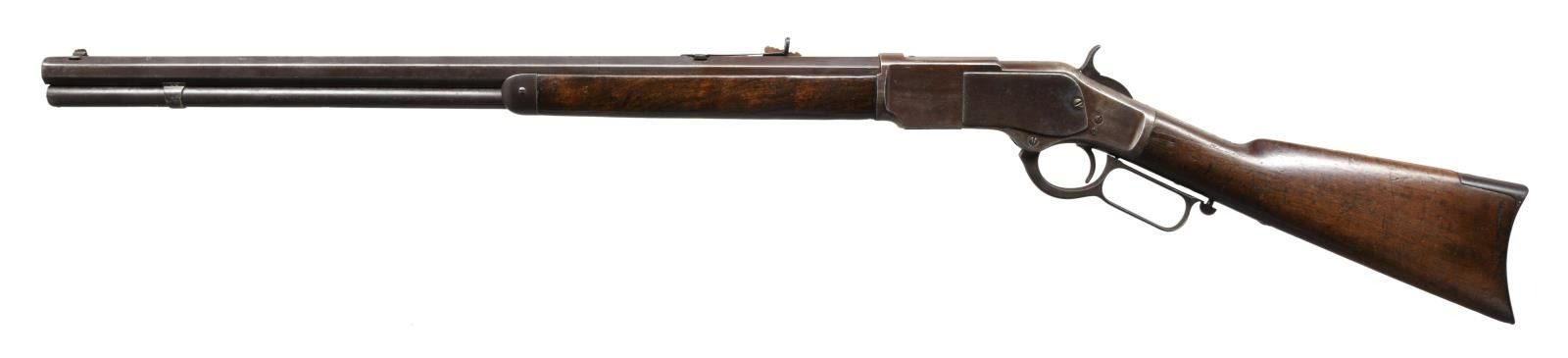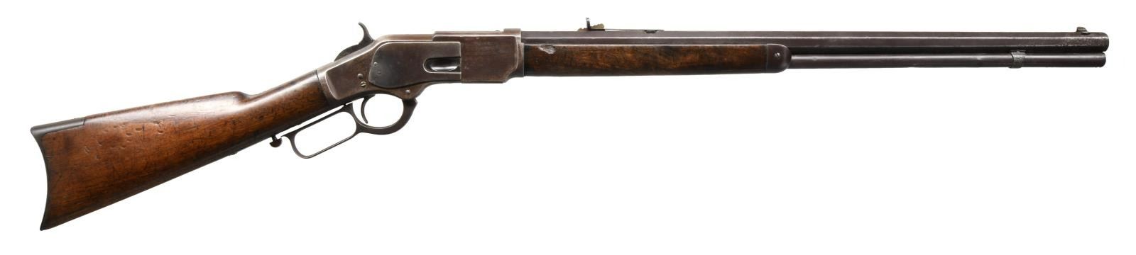 Cal. 44 WCF, (44-40). S# 19710. Bbl. 24" octagon. Sporting front sight w/ sporting rear sight having a replacement elevator. Full length mag. 1st model action w/ replacement thumb print mortised dust cover. Walnut forearm & straight grip stock w/ crescent steel buttplate. Mfg. 1876. CONDITION: metal finish has faded to brown showing scattered pitting & marks. Mag. tube shows dents. Wood has worn appearance w/ added finish showing numerous dents, scratches & marks. Forearm is missing a large chip on right side w/ smaller chips at action. Stock has an added wood repair at left of top tang w/ a small crack at the toe. Functioning action. Pitted bore has largely intact worn rifling. (01-24127/DS). ANTIQUE. $2000-3000.