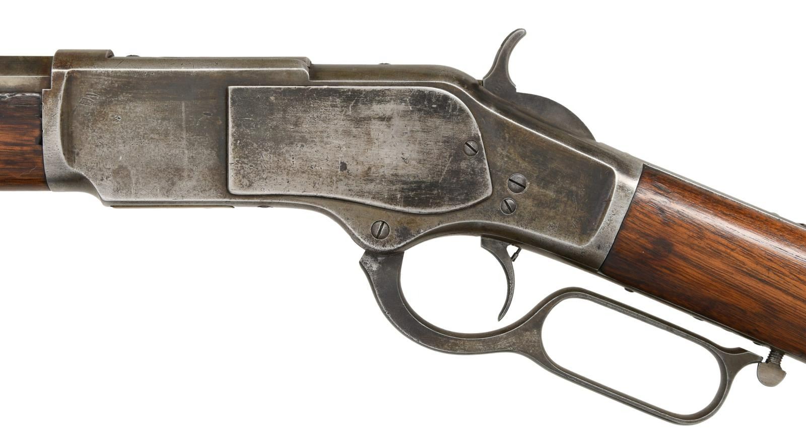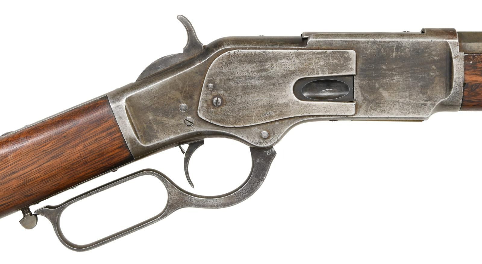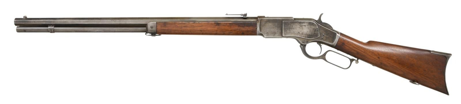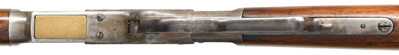 Cal. 44 WCF, (44-40). S# 25127. Bbl. 24" octagon. Sporting front sight w/ sporting leaf rear sight. Full length mag. Action features a mortised thumb print dust cover. Other features include desirable single set trigger & sling swivel. Walnut forearm & straight grip stock w/ crescent steel buttplate. Left side of stock near the buttplate is stamped "J F/O". Mfg. 1878. CONDITION: metal finish is fading to gray w/ some evidence of touch up. Sanded & refinished wood shows dents & handling marks. Forearm has a long crack on right side w/ small chips at action. Functioning action & set trigger. Lightly pitted bore retains sound rifling. (01-23412/DS). ANTIQUE. $2000-3000.