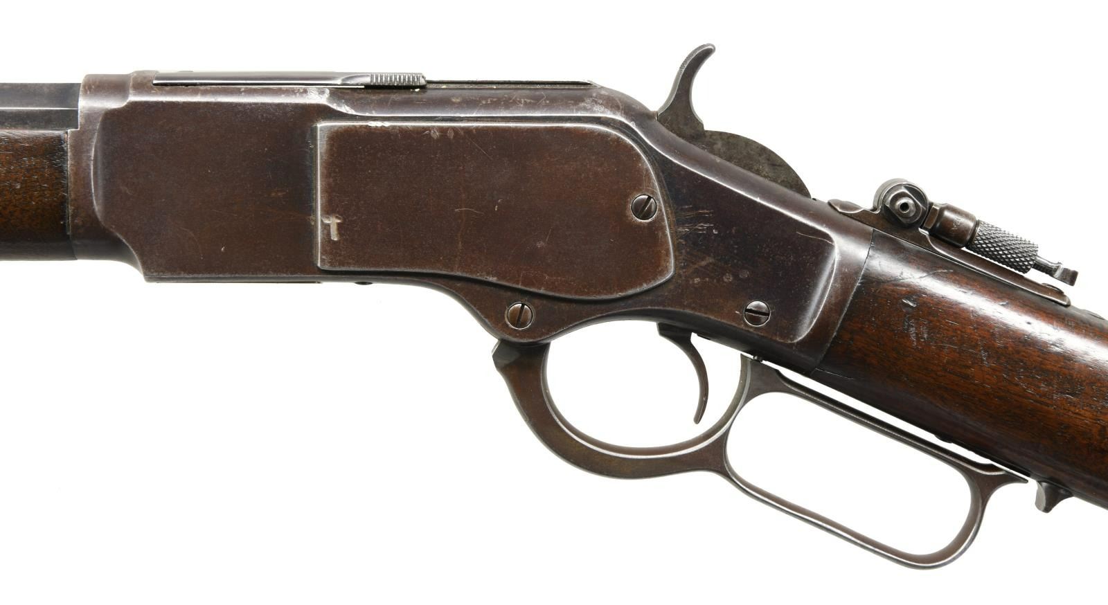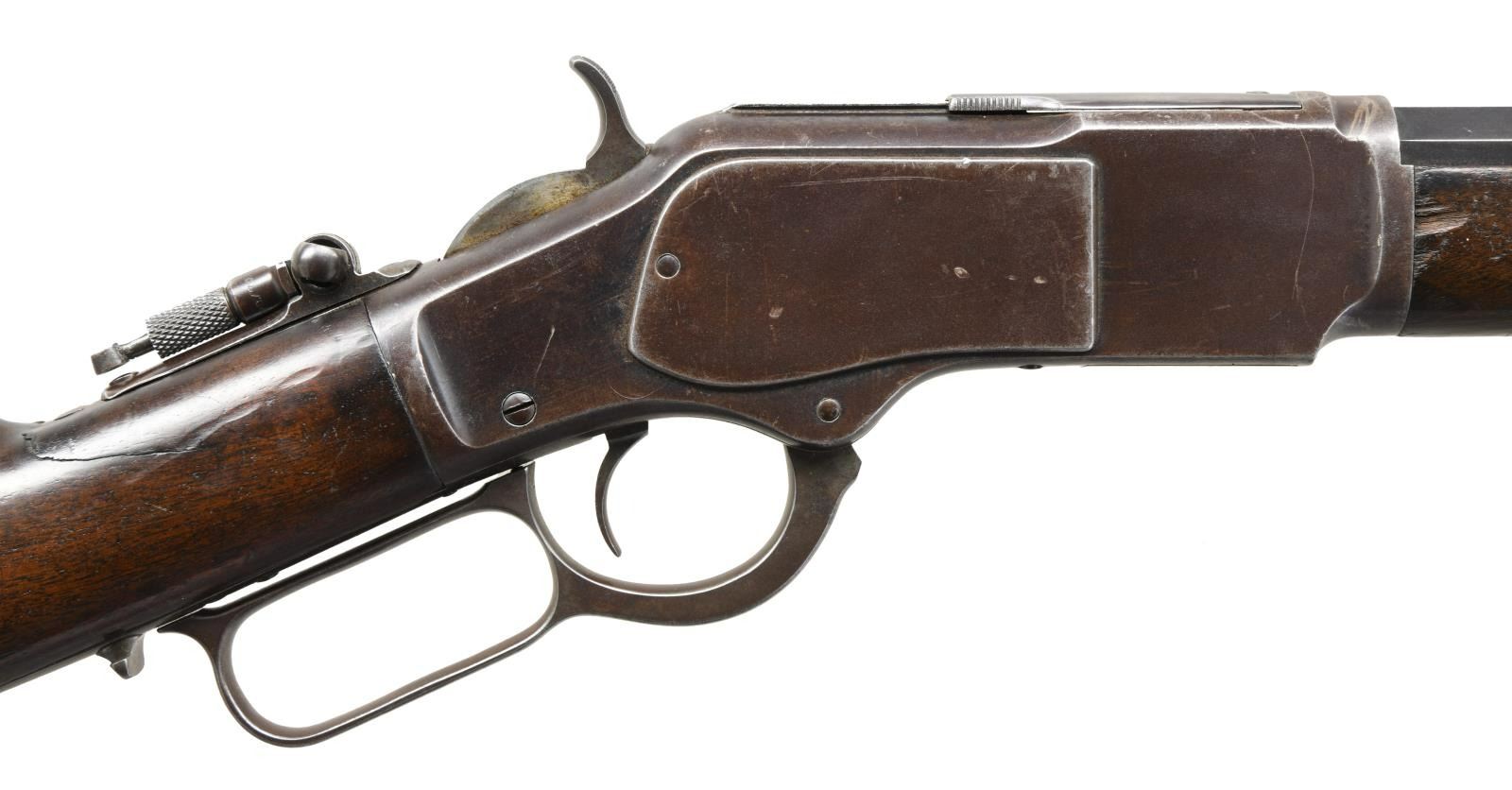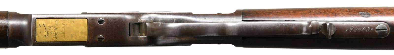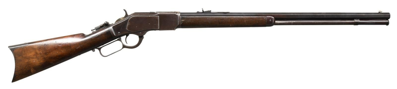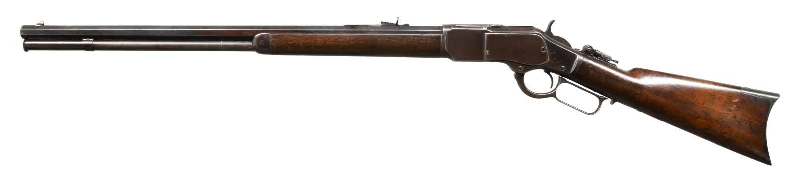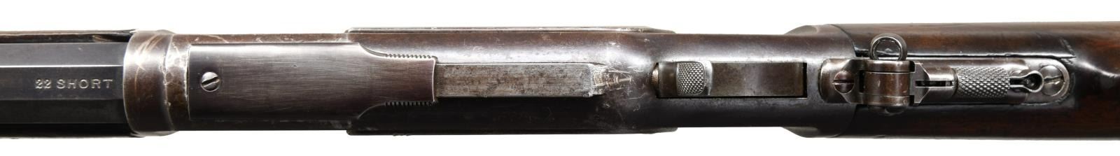 RIFLE. Cal. 22 Short. S# 178423B. Bbl. 24" octagon. Sporting front sight, sporting rear sight having replacement elevator & combination tang sight. Full length mag. Walnut forearm & straight grip stock over crescent steel buttplate. Mfg. 1885. CONDITION: metal finish is fading to brown w/ series of small dents around front action ring. Mag. tube has small dents. Sound mechanics, inside mag. tube is intact. Wood has worn original finish showing dents, scratches & marks. Right side of forearm has large chips at action. Right side of stock has a crack in wrist area. Functioning action. Pitted bore retaining partially intact rifling. (01-23415/DS). ANTIQUE. $1750-2750.