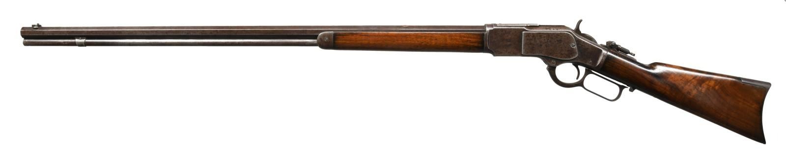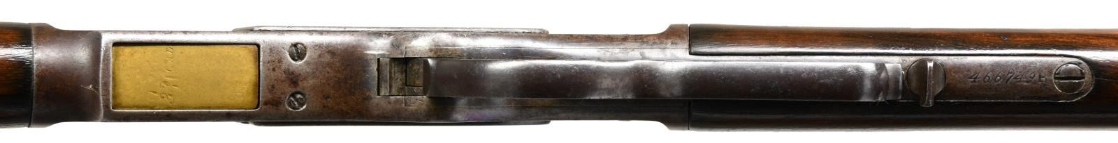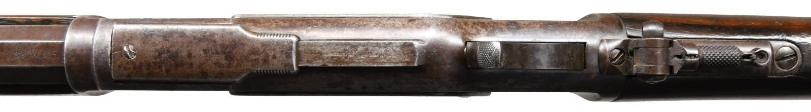 RIFLE. Cal. 32 WCF. S# 466749B. Bbl. scarce 30" octagon w/ full length mag. Combination front sight, polymer filler in rear dovetail w/ combination tang sight. Walnut forearm & nicely grained straight gripped buttstock w/ crescent steel buttplate. Mfg. 1894. UNATTACHED ACCESSORIES: Cody Firearms Museum records check detailing the following information, "Type: Rifle. Caliber: 32. Barrel Type: Octagon. Barrel Length: 30 inches. Trigger: Plain. Received in warehouse on February 15, 1894. Shipped from warehouse on September 10, 1894, Order number 21004". CONDITION: metal has faded to a light brown appearance showing scattered spots of pitting. Sanded & refinished wood shows handling marks & small dents. Stock has a crack extending from left side of top tang. Good mechanics. Bore has a dark frosted appearance over worn rifling. (01-23416/DS). ANTIQUE. $2500-3500.