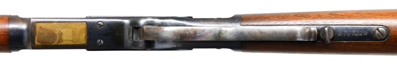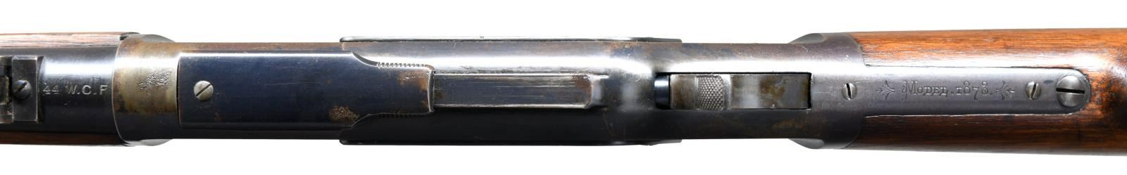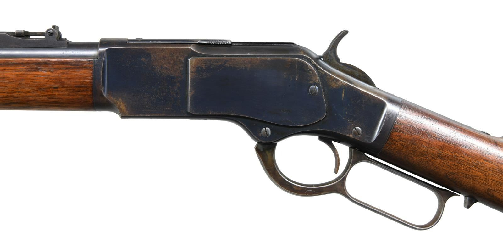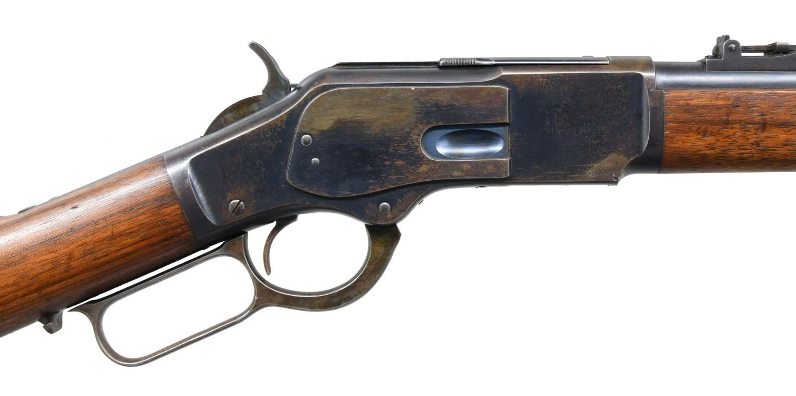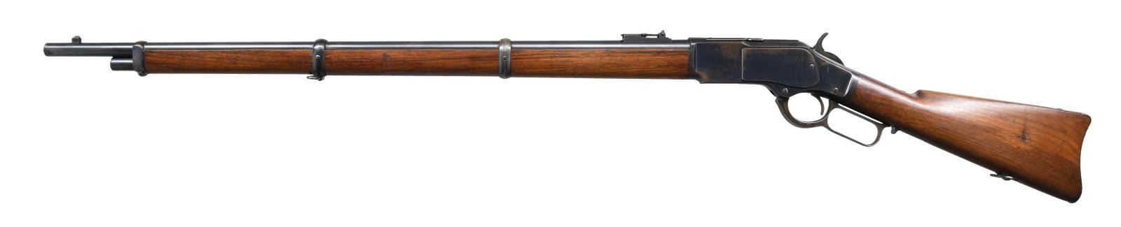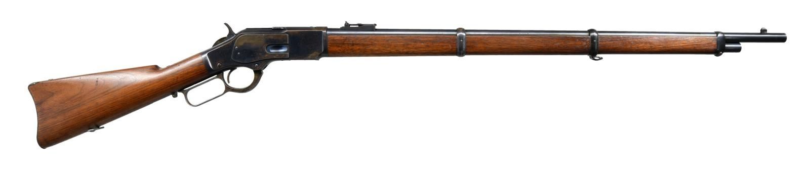 Cal. 44 WCF. S#. 570732B. Bbl. 30" round with barley corn front & 800 yard folding leaf rear sight. Blue finish. 3 band forend & straight grip stock with steel trap door buttplate and sling swivels. Only 5% of 1873 production were muskets and most were for foreign contracts. This musket is typical of those shipped to Nicaragua. UNATTACHED ACCESORIES: Cody Firearms Museum records check list the following: "Serial number applied on August 04, 1903 / Type: Musket / Caliber: 44 / Received in warehouse on august 25, 1903 / Shipped from warehouse on September 18, 1903, Order number 13880". CONDITION: Fine, all original. Over 75% dull blue blending with spots that have flaked to brown. Original wood finish shows some wear with scattered small dents & marks. Crisp action. Bright near excellent bore. (23-1404/DS). CURIO. $3000-5000.
