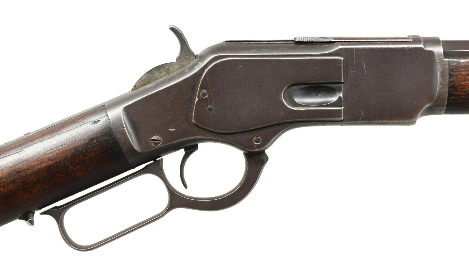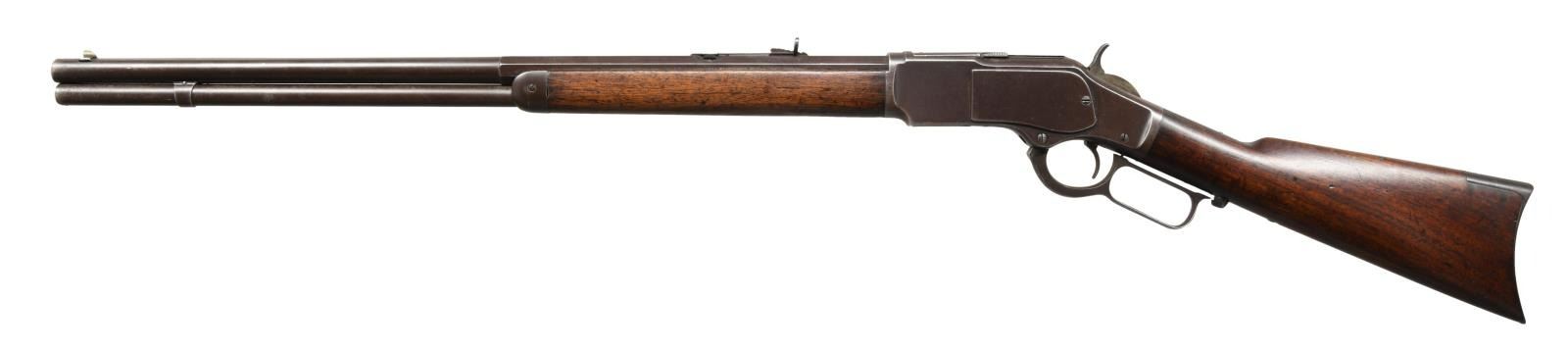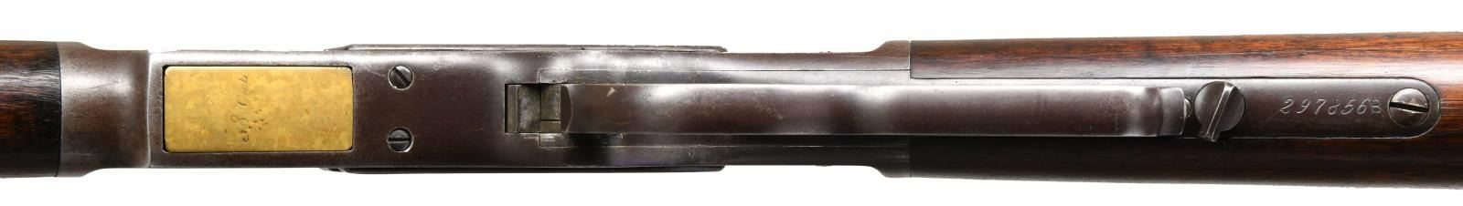 Cal. 38 WCF. S# 297856B. Bbl. 24" octagon to round w/ sporting sights. Full length mag. Walnut forearm & straight grip stock w/ crescent steel trapdoor buttplate. Mfg. 1889. CONDITION: metal has faded to a pleasing brown patina appearance w/ small spots of pitting. Refinished wood shows small dents & handling marks. Right side of stock has a long crack extending from the action. Good mechanics. Lightly pitted bore retains intact rifling. (01-23419/DS). ANTIQUE. $1500-2000.