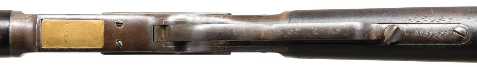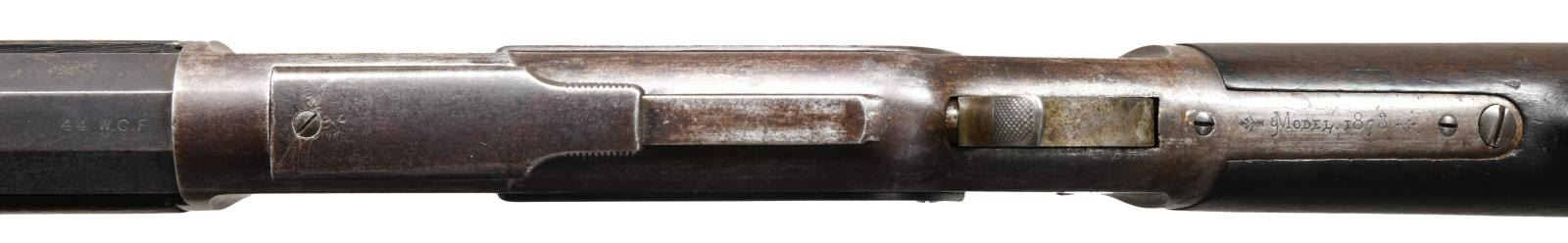 ACTION RIFLE. Cal. 44 WCF. S# 335791B. Bbl. 2" longer than standard, 26" of heavy octagon measuring 1 inch across the flats at muzzle. Sporting front sight w/ replacement elevator adj. full buckhorn rear sight. Full length mag. Action features scarce single set trigger. Walnut forearm & straight grip stock of crescent steel trapdoor buttplate. UNATTACHED ACCESSORIES: 2 sections of original style 4 piece cleaning rod. Cody Firearms Museum records check detailing the following information, "Type: Rifle. Caliber: 44. Barrel Type: Octagon. Barrel Length: 26 inches Extra Heavy. Trigger: Set. Received in warehouse on April 10, 1890. Shipped from warehouse on April 10, 1890. Order number 10211". Mfg. 1896. CONDITION: metal finish has a mottled gray brown appearance w/ spots of light pitting & handling marks. Refinished wood has dark appearance. Forearm has a long crack along left side of bbl. Action & set trigger function properly. Lightly pitted bore retains intact rifling. (1-23421/DS). ANTIQUE. $2000-2750.