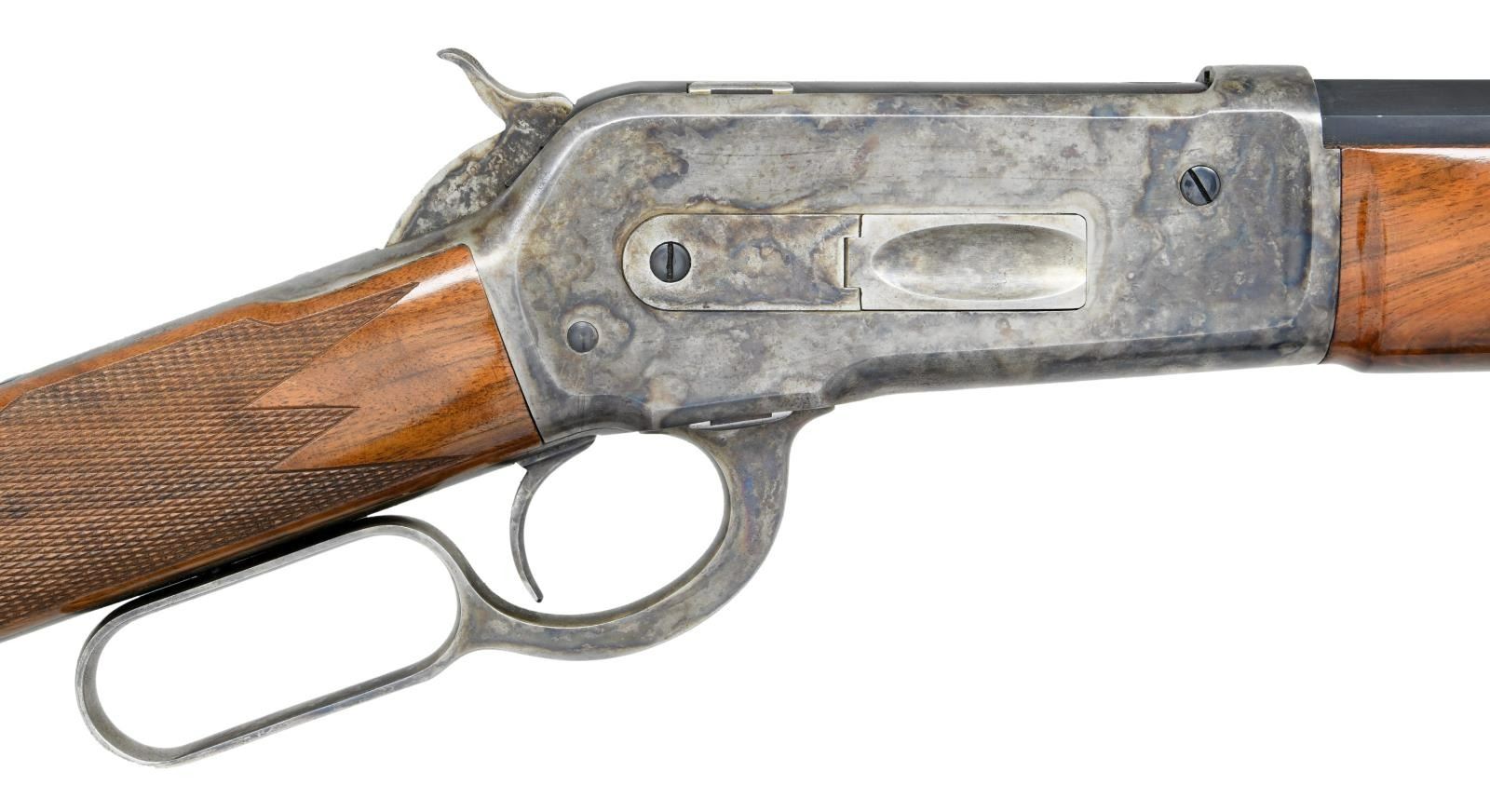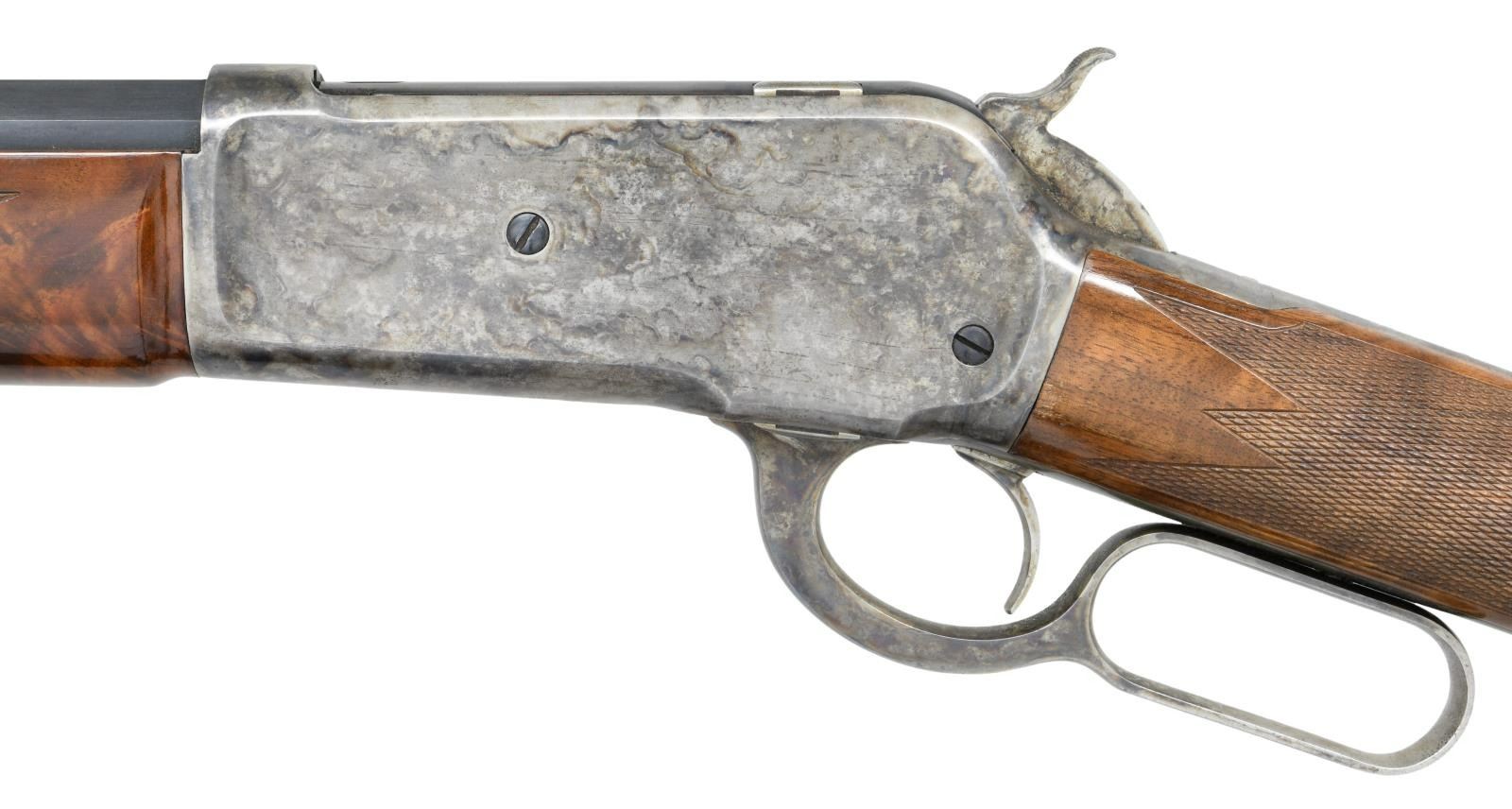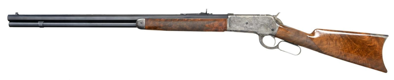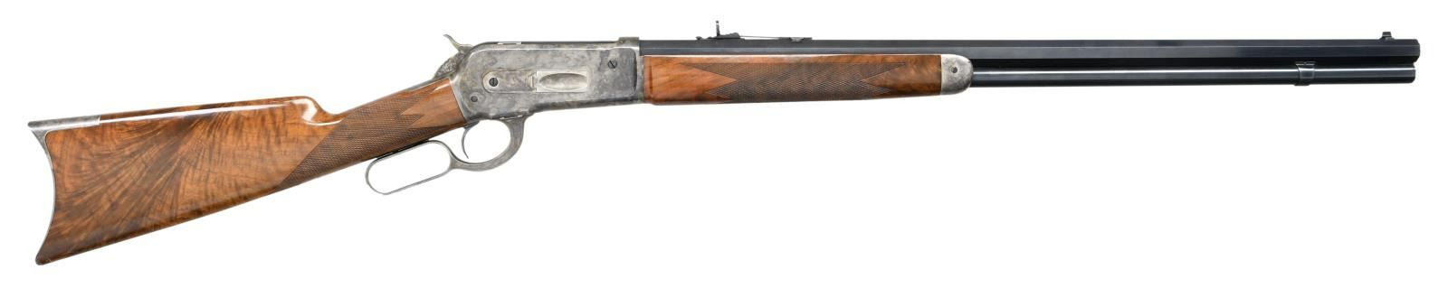 RIFLE. Cal. 40-65 WCF. S# 20372. Bbl. 26" octagon. Replacement bead front sight w/ Marble full buckhorn sporting rear sight. Full length mag. Custom heavier than standard rifle forearm & straight grip stock w/ crescent steel buttplate of gloss finished fancy black walnut. Custom borderless hand checkering is wraparound style. Mfg. 1888. WEIGHT: 9 lbs, 1 oz. CONDITION: bbl. & mag. tube retain nearly all finely polished custom blue finish. Action, buttplate & forearm cap have a custom colored finish that has strikingly unusual gray tones. Wood finish shows handling marks w/ small finish chips at toe. Mechanics are fine. Bright bore has sound rifling. (01-23908/DS). ANTIQUE. $1,500-2,250.