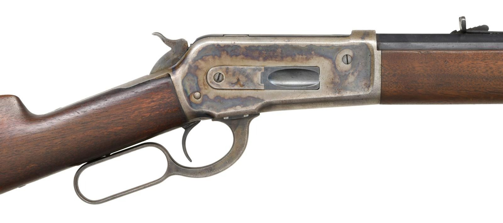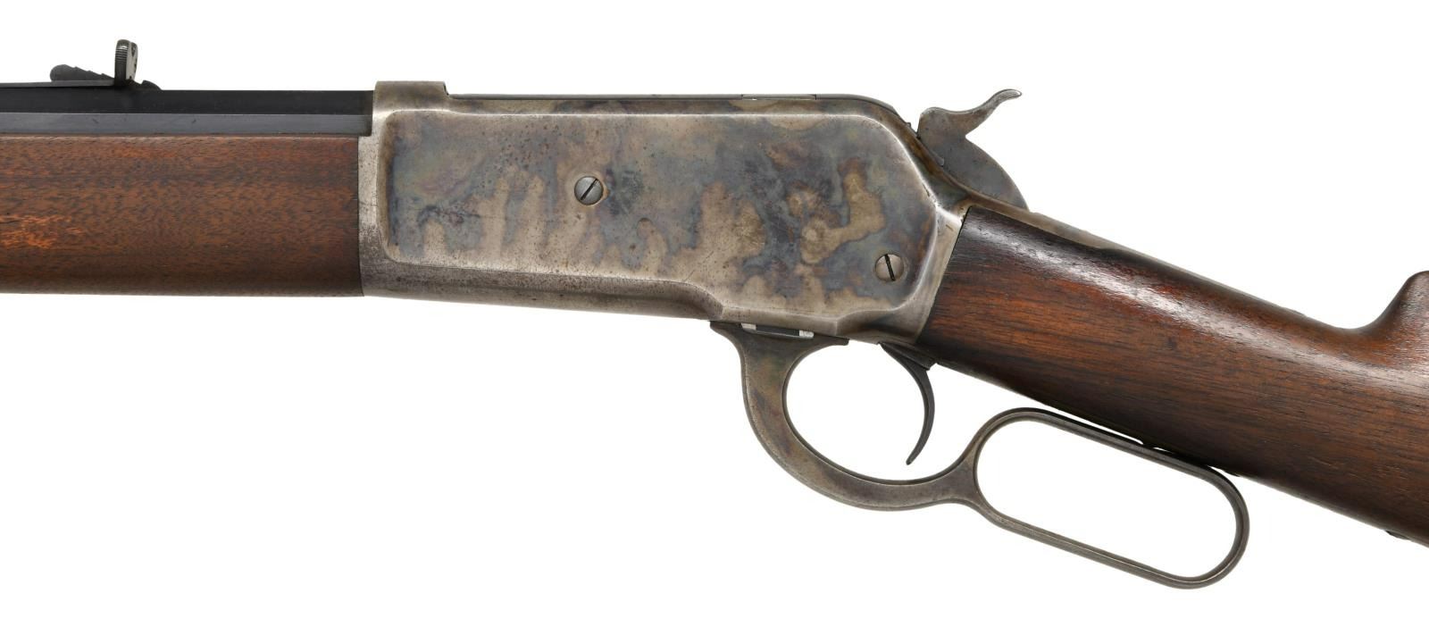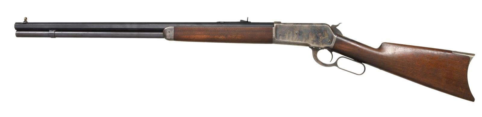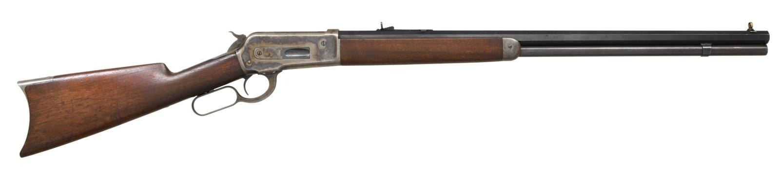 Cal. 45-90 WCF. S# 35918. Bbl. 26" octagon. Gold finished combination front sight w/ sporting rear sight. Full length mag. Blue finish w/ case colored action, forearm cap & crescent steel buttplate. Walnut forearm & straight grip stock. Mfg. 1889. UNATTACHED ACCESSORIES: 14 Rds. of 45-90 ammunition on Remington UMC Kleanbore box. CONDITION: bbl. & mag. tube retain over 90% lightly faded blue showing small spots. Action retains over 70% case colored finish showing spots of freckling. Wood has worn original finish showing numerous scratches & light marks. Bore is generally bright retaining strong rifling. (01-23966/DS). ANTIQUE. $4000-6000.