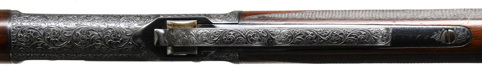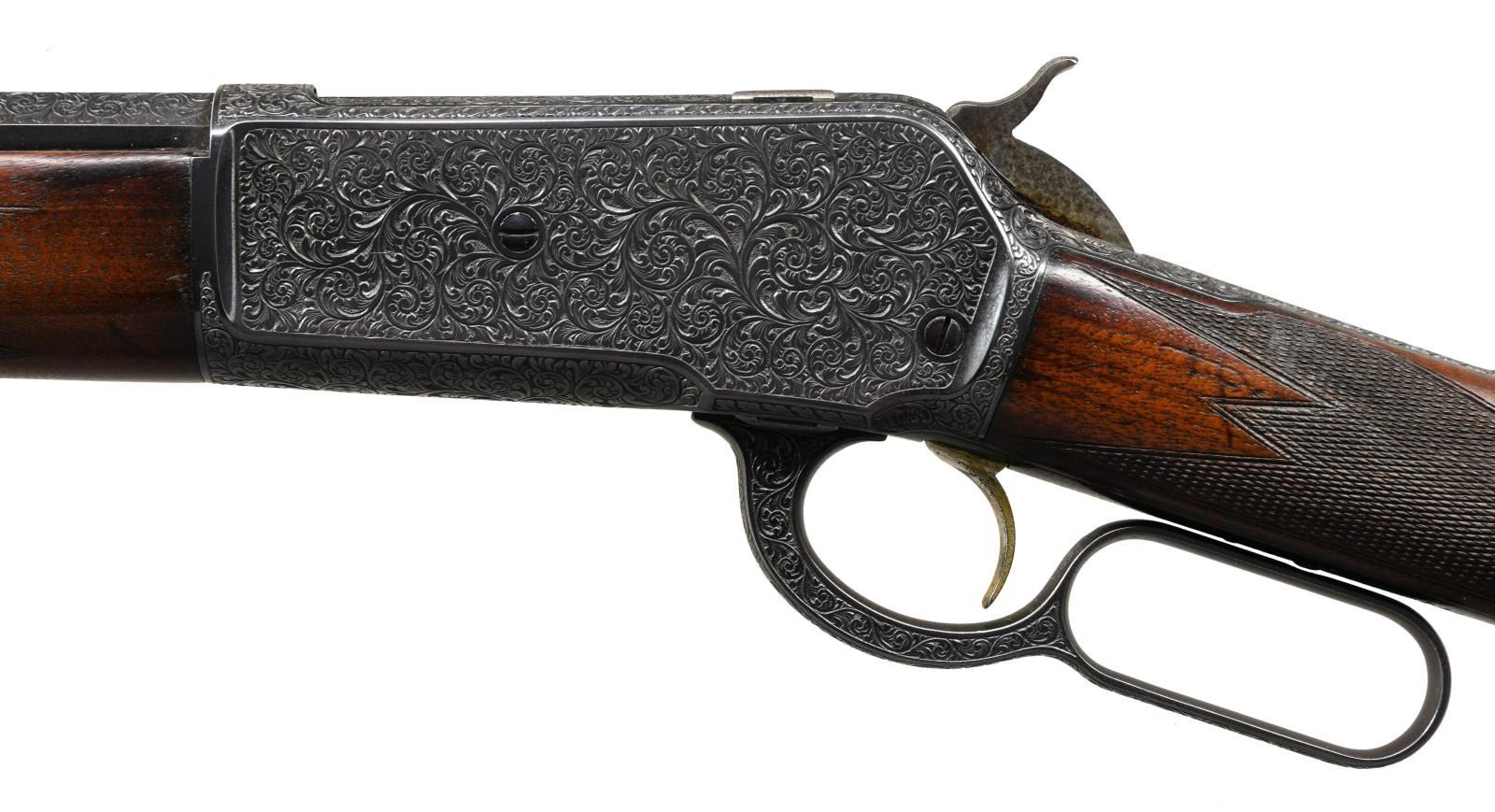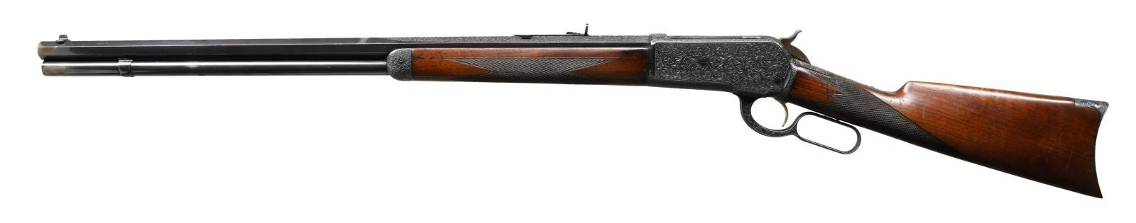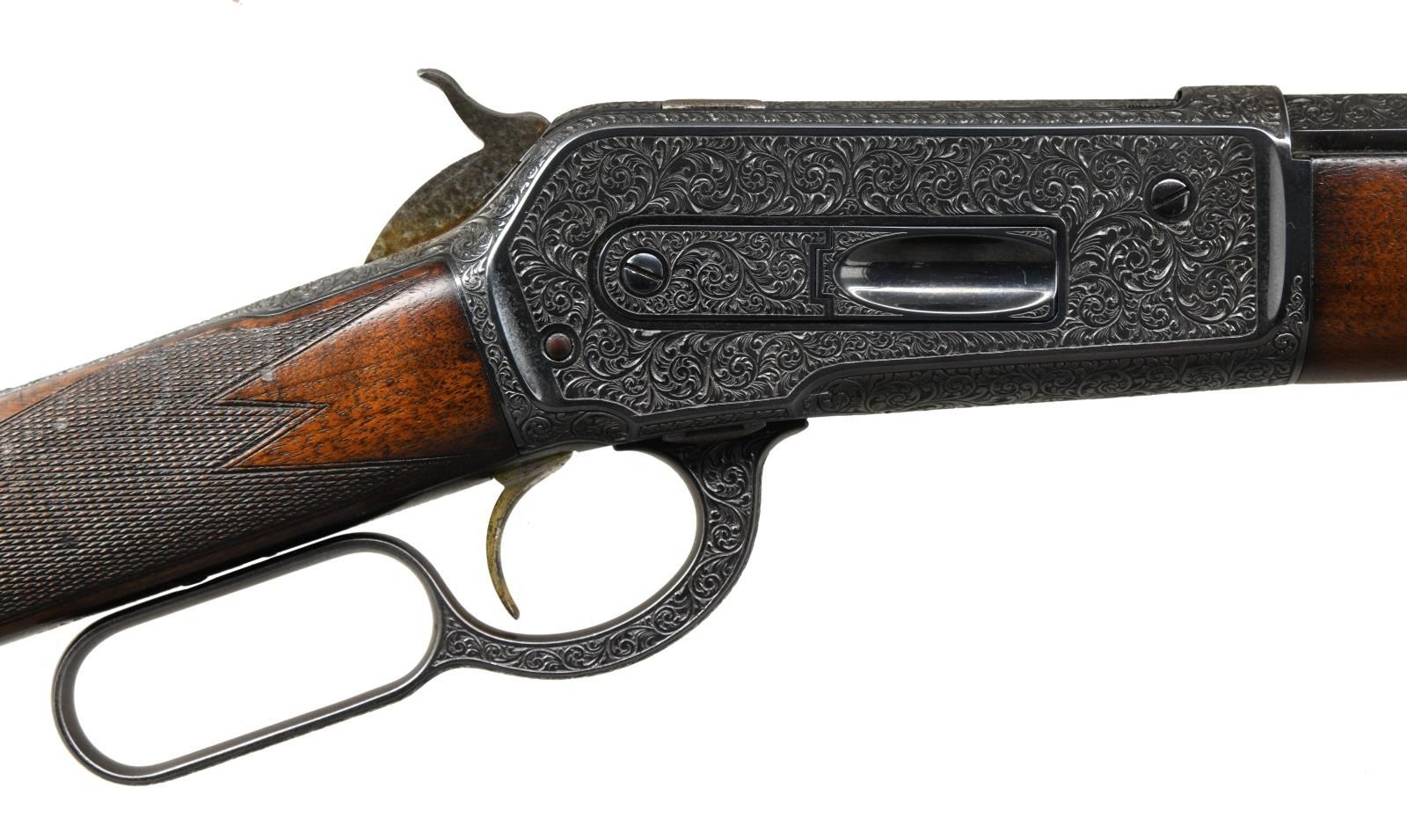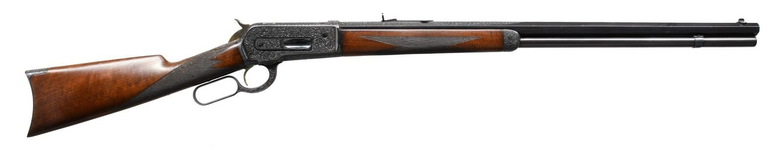 ACTION RIFLE. Cal. 40-82. S# 98804. Bbl. 26" octagon w/ replacement front sight missing bead & sporting style rear sight. Full length mag. Receiver has full coverage of deep finely executed arabesque scroll hand engraving. Complimenting scroll work extends to the bolt, lever, tangs, crescent steel buttplate & breech section of the bbl. Gold finished trigger. Hammer has machine jeweled sides. Custom high polish caustic blue finish. Original walnut forearm & straight grip stock have added point pattern hand checkering similar to the factory style H. Mfg. 1895. CONDITION: action & bbl. retain over 97% blue showing wear spots, small scratches w/ 1 spot of pitting near mid point on bbl. Wood finish shows light wear w/ scattered marks & small dents. Bore is generally bright showing some very light pitting w/ strong rifling. (01-24243/DS). ANTIQUE. $4,500-6,500.