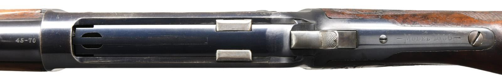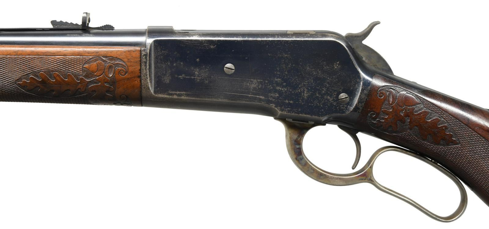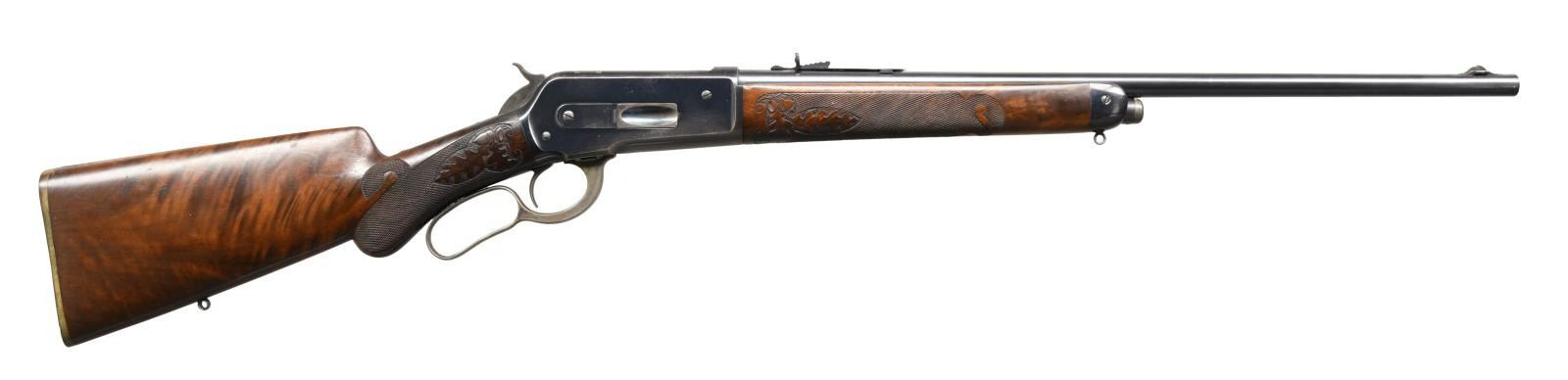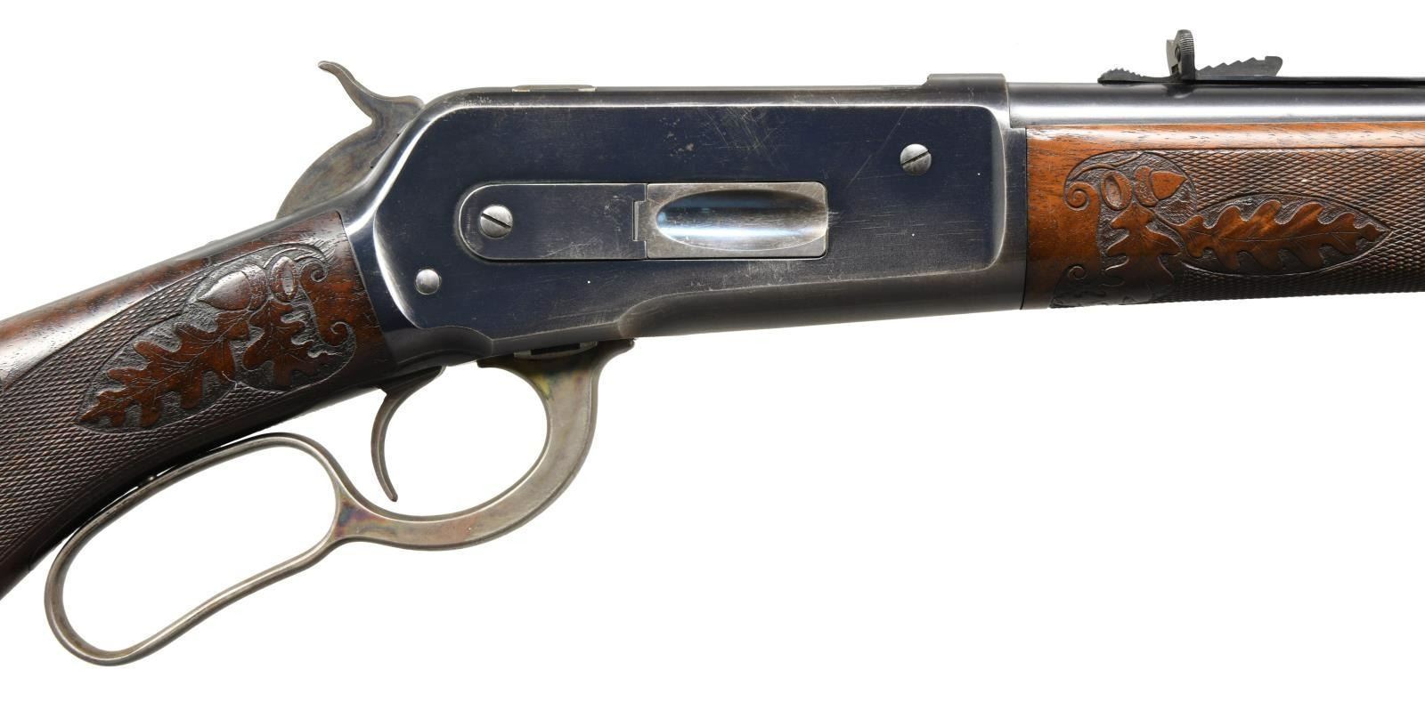 LIGHTWEIGHT LEVER ACTION TAKEDOWN RIFLE. Cal. 45-70. S# 125420. Bbl. 22" tapered round. Ramp mounted Lyman No. 4 hunting bead front sight w/ original sporting rear sight. Button mag. Blue finish w/ case colored hammer & lever. Special order forearm & cheek piece round knob stock of XX grade black walnut. Style D factory checkering & carving feature oak leaves & acorns. Other features include hard rubber shotgun buttplate & Winchester sling eyes. Left inside of lower tang is marked w/ assembly no. "40" followed by wood grade "XX" followed by "R". Top tang channel has matching assembly & wood grade markings. Factory carving is seldom seen on non engraved motifs. Mfg. 1901. UNATTACHED ACCESSORIES: Cody Firearms record check confirming specifications. Received in warehouse on March 13, 1902. shipped from warehouse on March 14,1902, order number 132516. Return and repair on March 31, 1902, order number 136921. CONDITION: bbl. retains over 97% blue showing wear & spots of corrosion near muzzle. Action retains 80% original blue showing carry wear w/ scattered corrosion. Hammer & lever have strong case coloring on their sides. Original wood finish shows light wear w/ a few handling marks. Checkering & carving remains strong. Bright near excellent bore. (23-2548/DS). CURIO. $4500-6500.