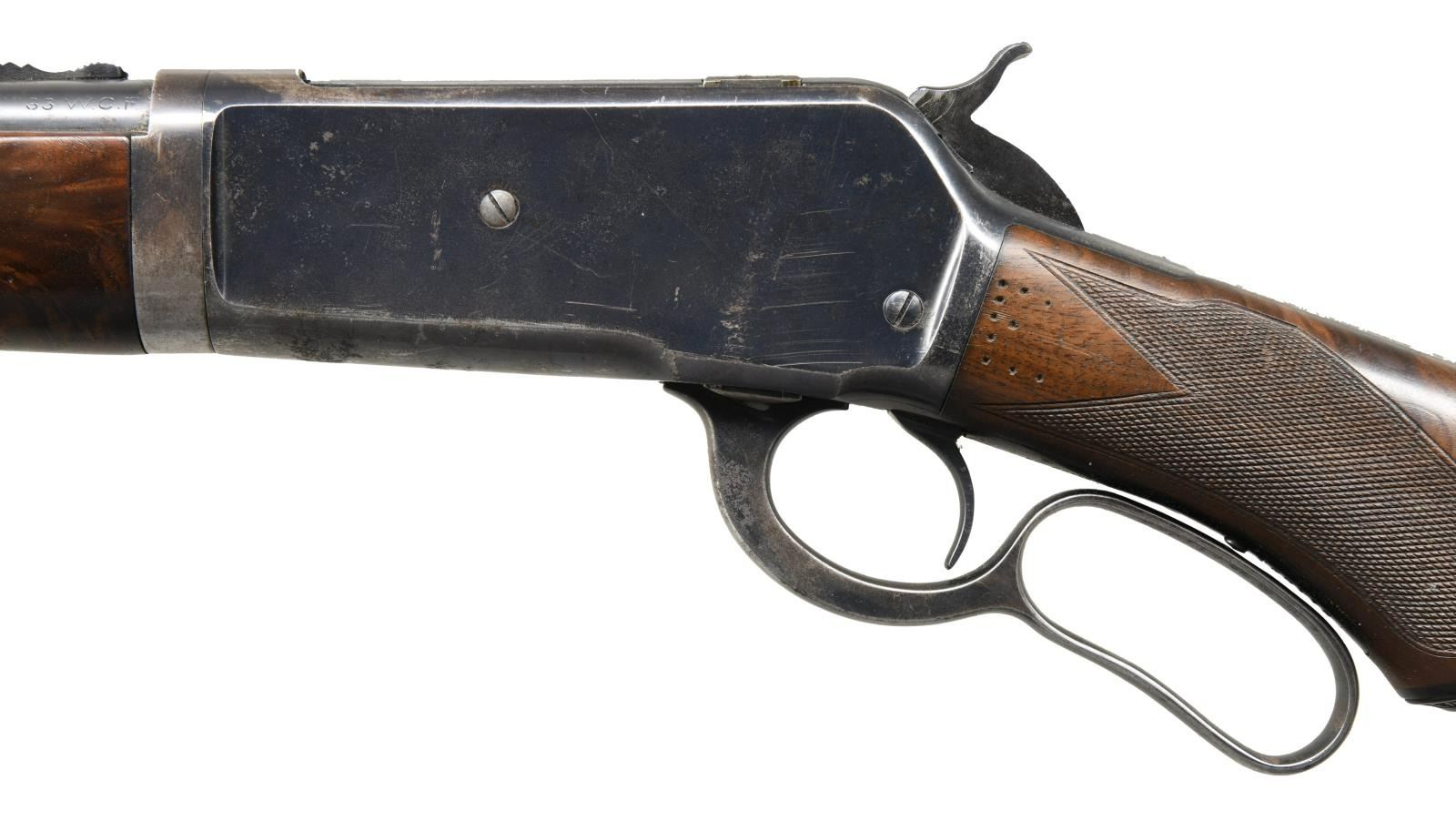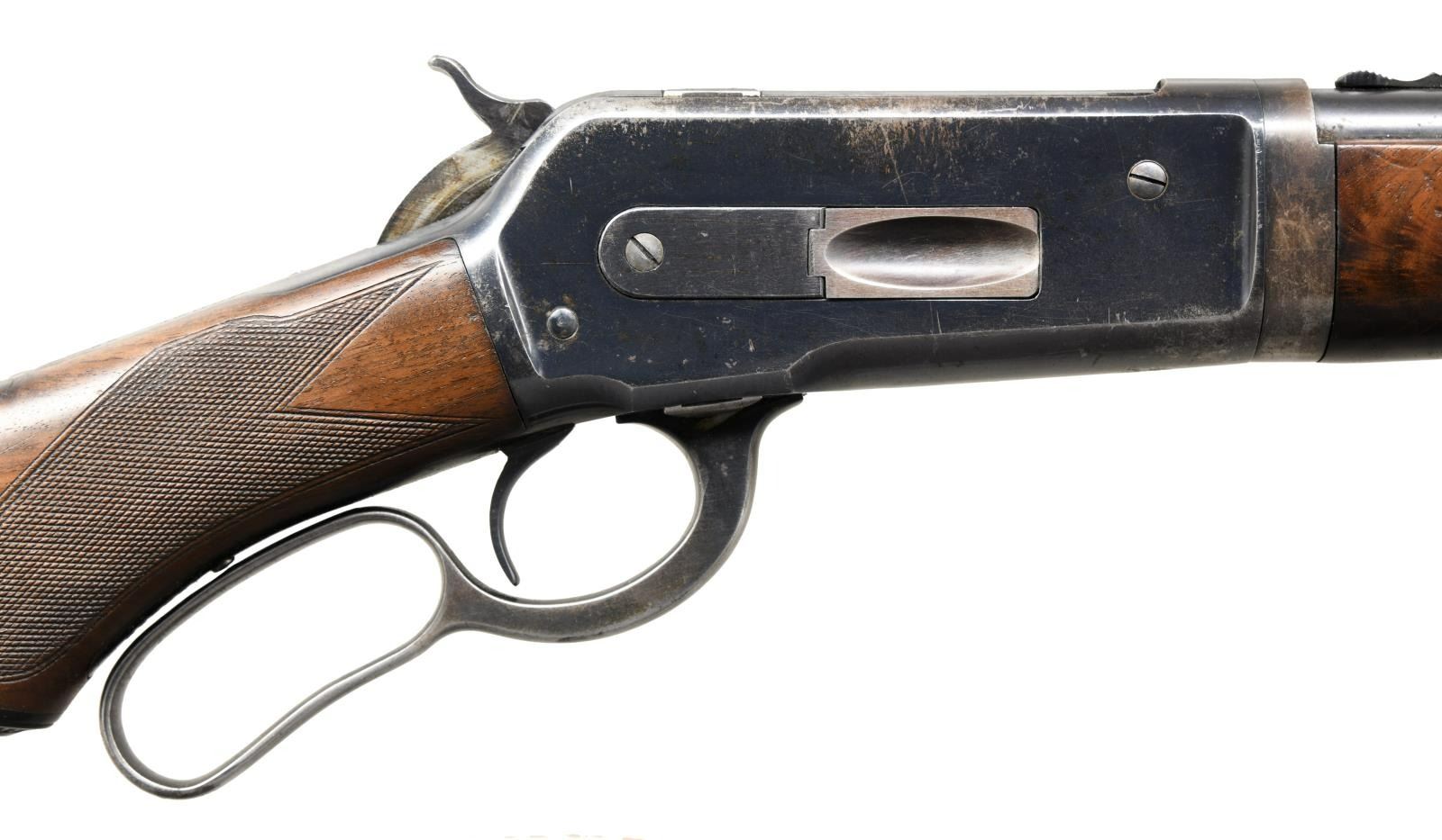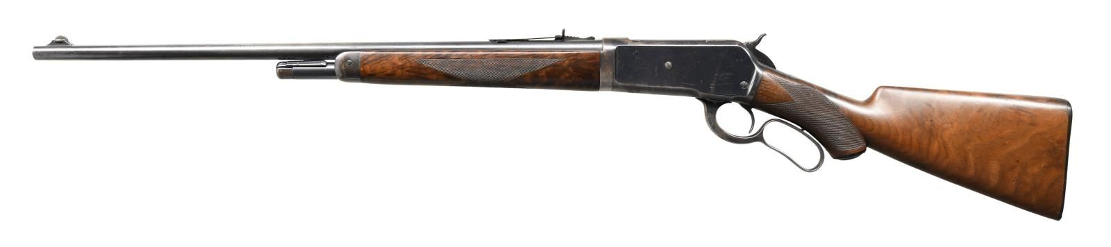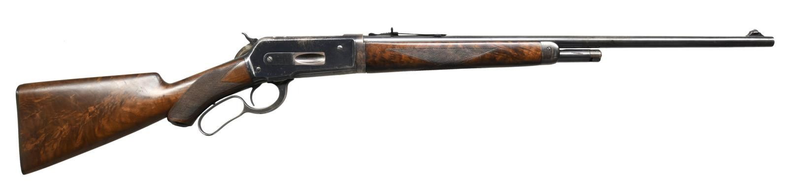 LIGHTWEIGHT LEVER ACTION RIFLE. Cal. 33 WCF. S# 158115. Bbl. 24" tapered round. Ramp mounted Lyman No. 4 bead front sight w/ original flat top sporting rear sight. Half length takedown mag. Blue finish. Forearm & hard rubber capped pistol grip stock of fancy walnut w/ hard rubber shotgun butt & style H factory checkering. Inside of tang in stock lacks wood grade & assembly markings. Left ear of stock has a series of 10 circular punch marks in the shape of the letter "E". Toeline of stock behind grip has a series of 6 hand-cut notches. Mfg. 1920. CONDITION: over 70% lightly faded blue showing carry & edge wear w/ scattered spots of light pitting or corrosion. Stock retains lightly worn finish & checkering showing scattered scratches & marks. Bore is bright retaining strong rifling. (23-2539/DS). CURIO. $3000-4500.