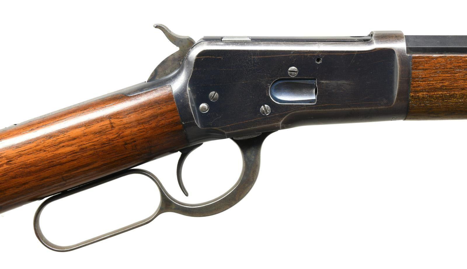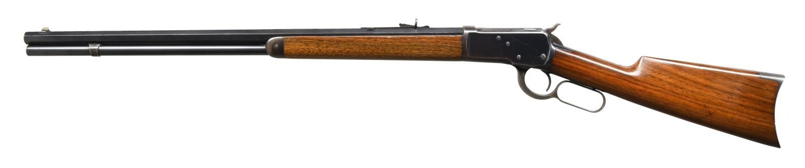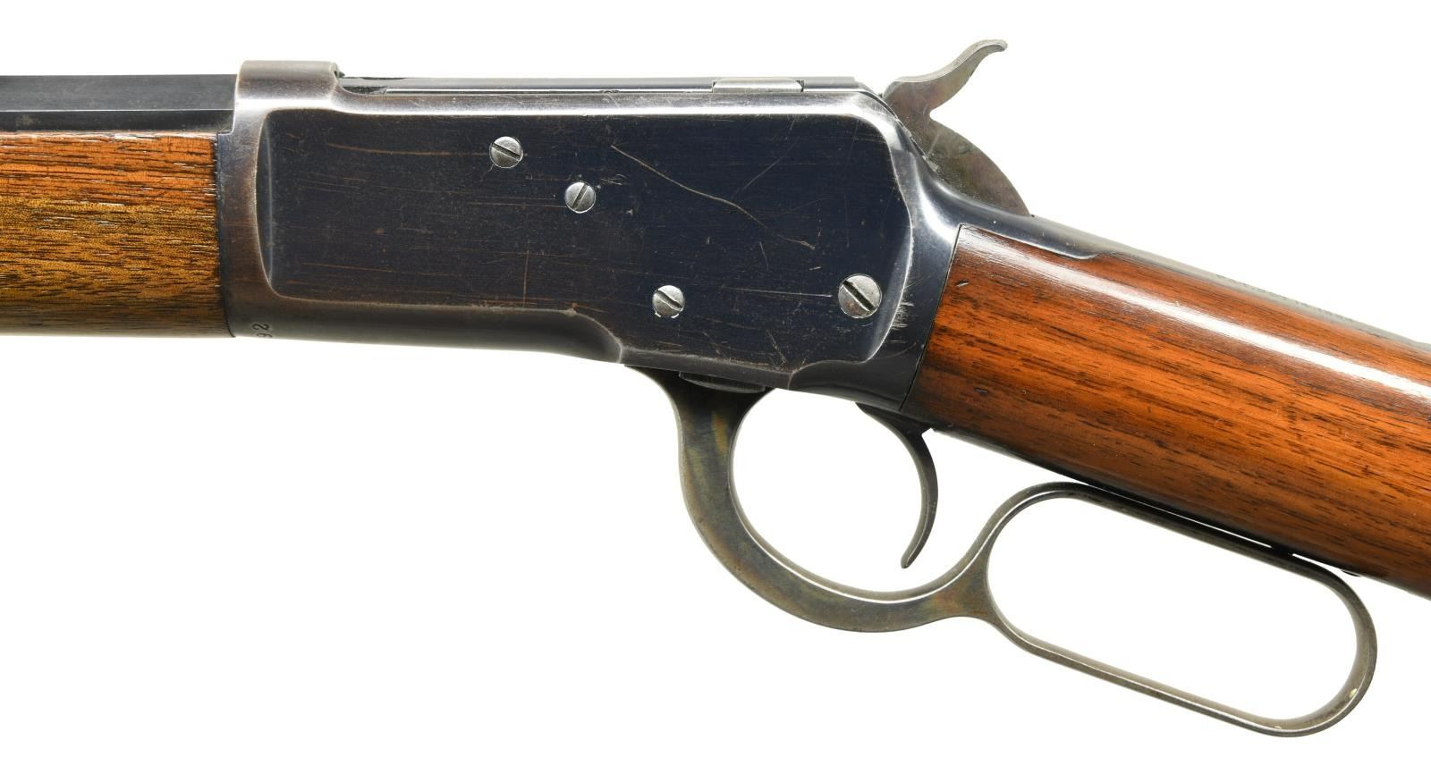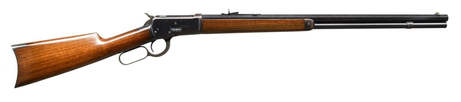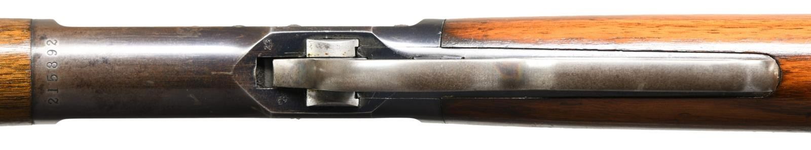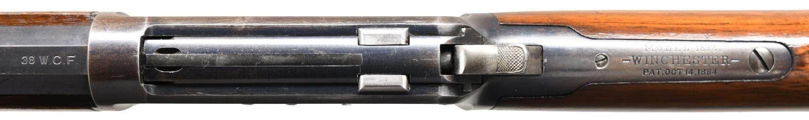 Cal. 38 WCF, (38-40). S# 215892. Bbl. 24" octagon w/ sporting sights. Full length mag. Blue finish w/ case colored hammer, lever & crescent steel buttplate. Walnut forearm & straight grip stock. Mfg. 1903. CONDITION: 80% lightly worn blue showing carry & edge wear w/ series of small dents on left side of action. Lightly worn original wood finish shows numerous scratches, marks & small dents. Bright bore retains strong rifling showing a few small spots of light pitting. (23-4766/DS). CURIO. $2500-3500.