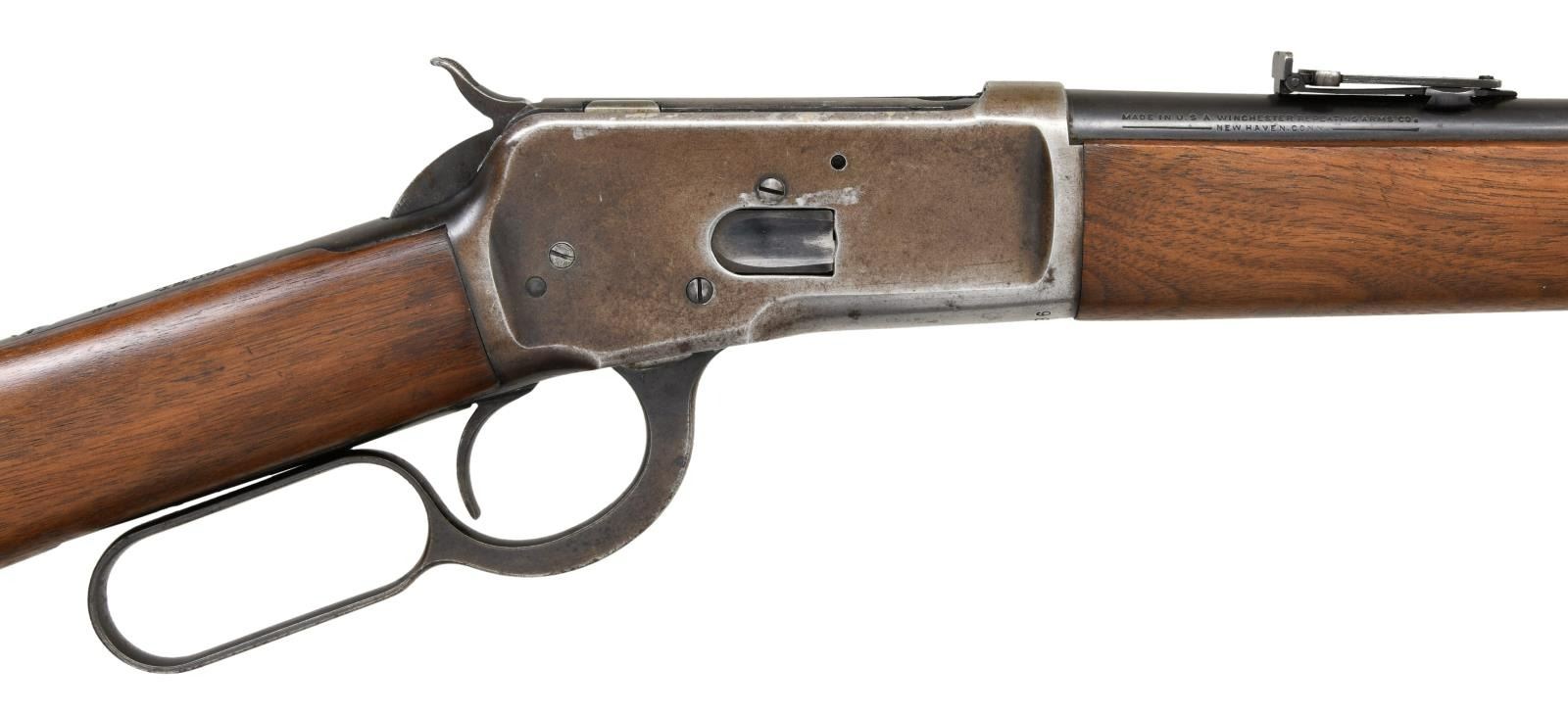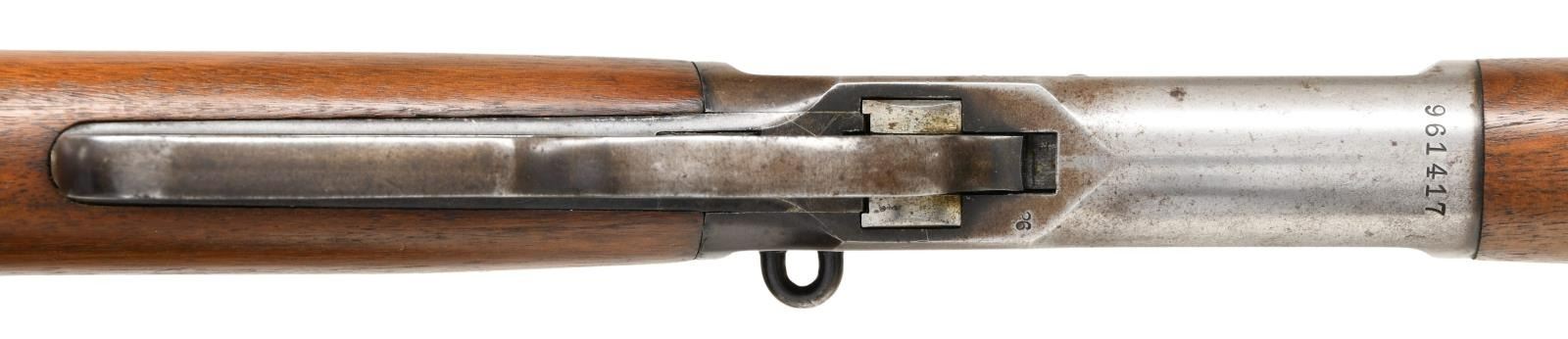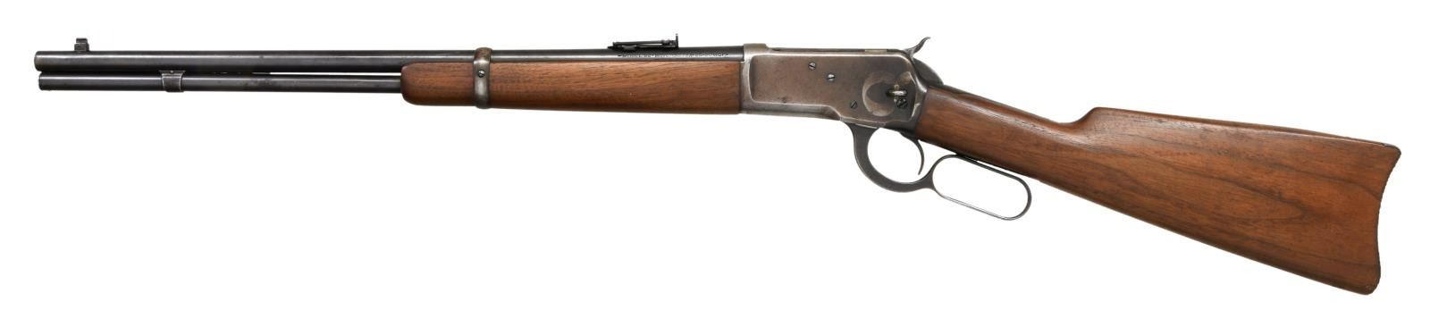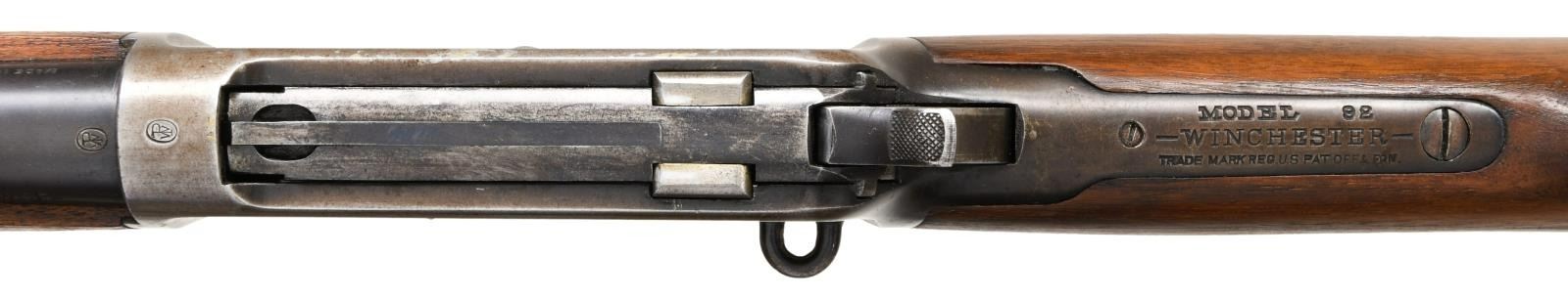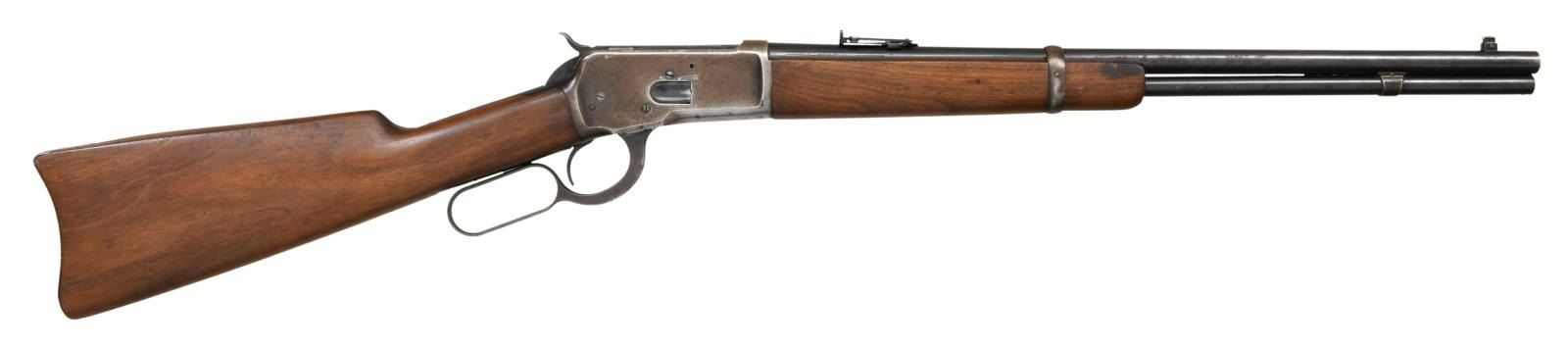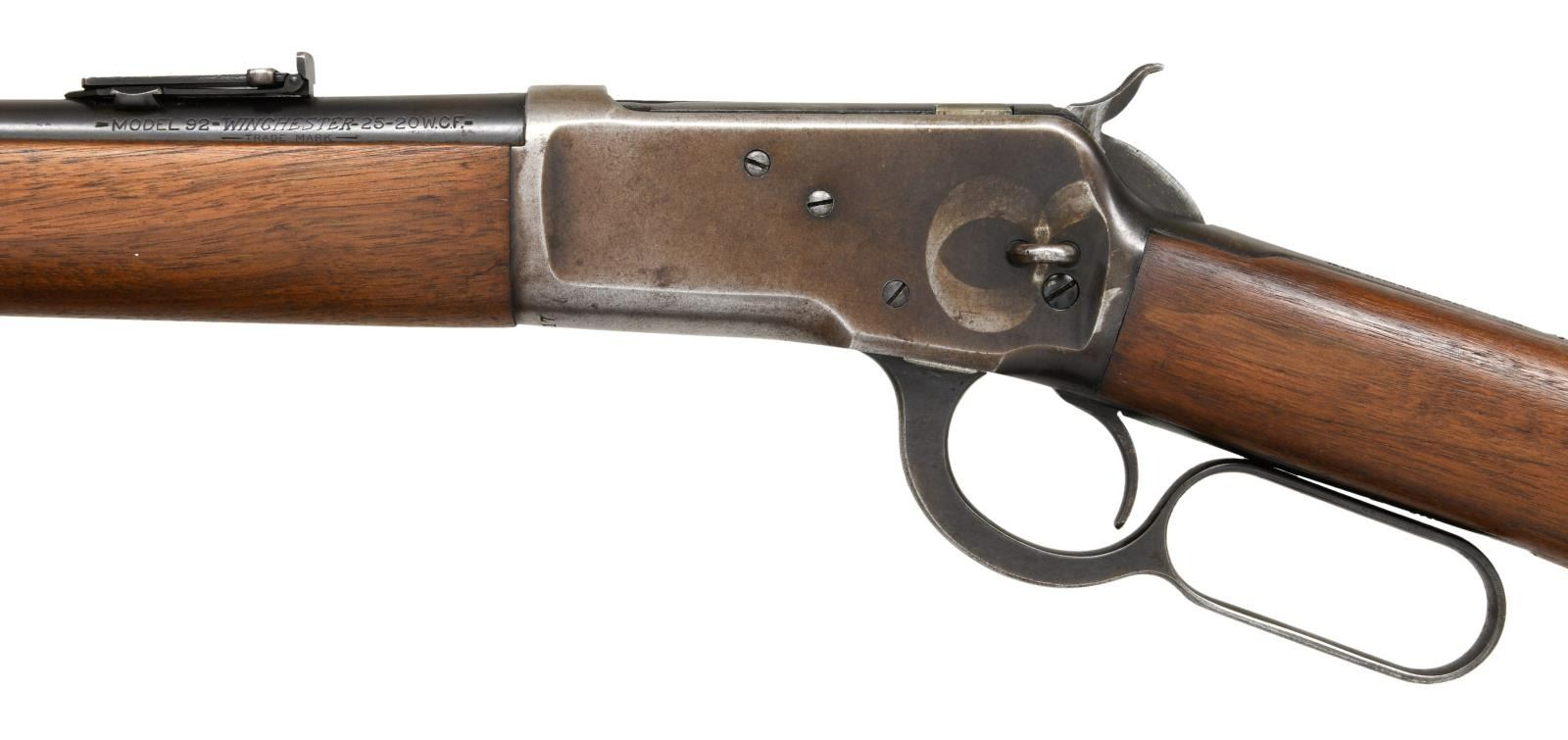 CARBINE. Cal. 25-50 WCF. S# 961417. Bbl 20". Model 1892 saddle ring carbine manufactured by Winchester in 1926. Left side of barrel is stamped with the Winchester trademark logo stamped between the model and caliber designations. Right side bears Winchester's 2 line address. Blued finish, with a plain smooth straight grip buttstock and forend. Ivory beaded front sight with U-notch ladder rear sight. Saddle ring is not present. CONDITION: receiver retains fair amounts of its original factory blue finish, exhibiting wear and thinning overall that shows through to gray and brown patinas, as well as distinctive wear on the left side from the saddle ring. Barrel, lever, and buttplate exhibit areas of wear and thinning that show through to patina, with scattered areas of dark oxidation overall. Very bright bore, exhibiting a few scattered spots of pitting and strong rifling throughout. Wood furniture exhibits some scattered marks and minor impressions from storage and handling, but otherwise is very good overall. (23-2294/MLW). CURIO. $800-1,200.