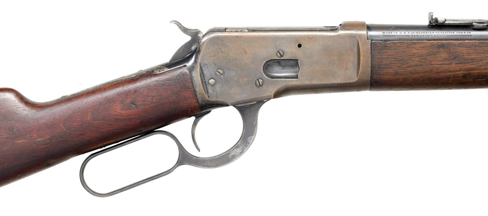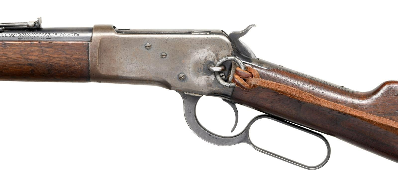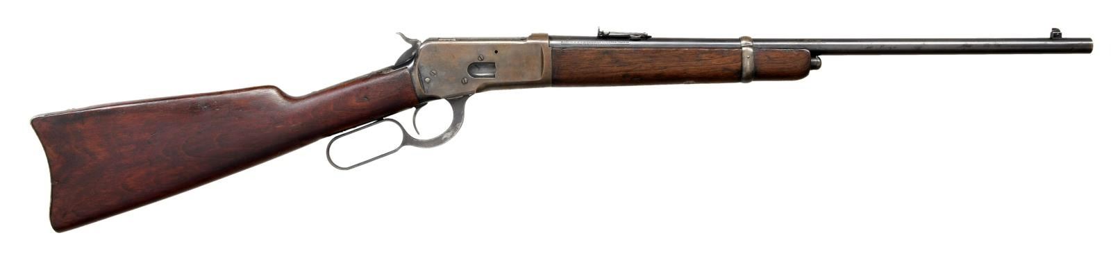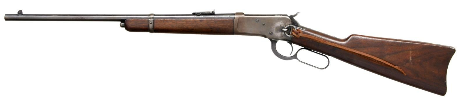 Cal. 25-20. S# 985157. Bbl. 20" carbine style. Pinned blade front sight. Carbine leaf rear sight. Button mag. Action has saddle ring w/ leather thong on left side. Blue finish. Band fastened walnut forearm & carbine stock w/ steel carbine buttplate. Mfg. 1927. CONDITION: bbl. retains over 80% lightly faded blue showing scattered spots of light corrosion. Action shows small amounts of blue flaking to brown. Aged darkened wood shows scattered dents & marks. Bore is generally bright w/ sound rifling. (23-2534/DS). CURIO. $2000-2750.
