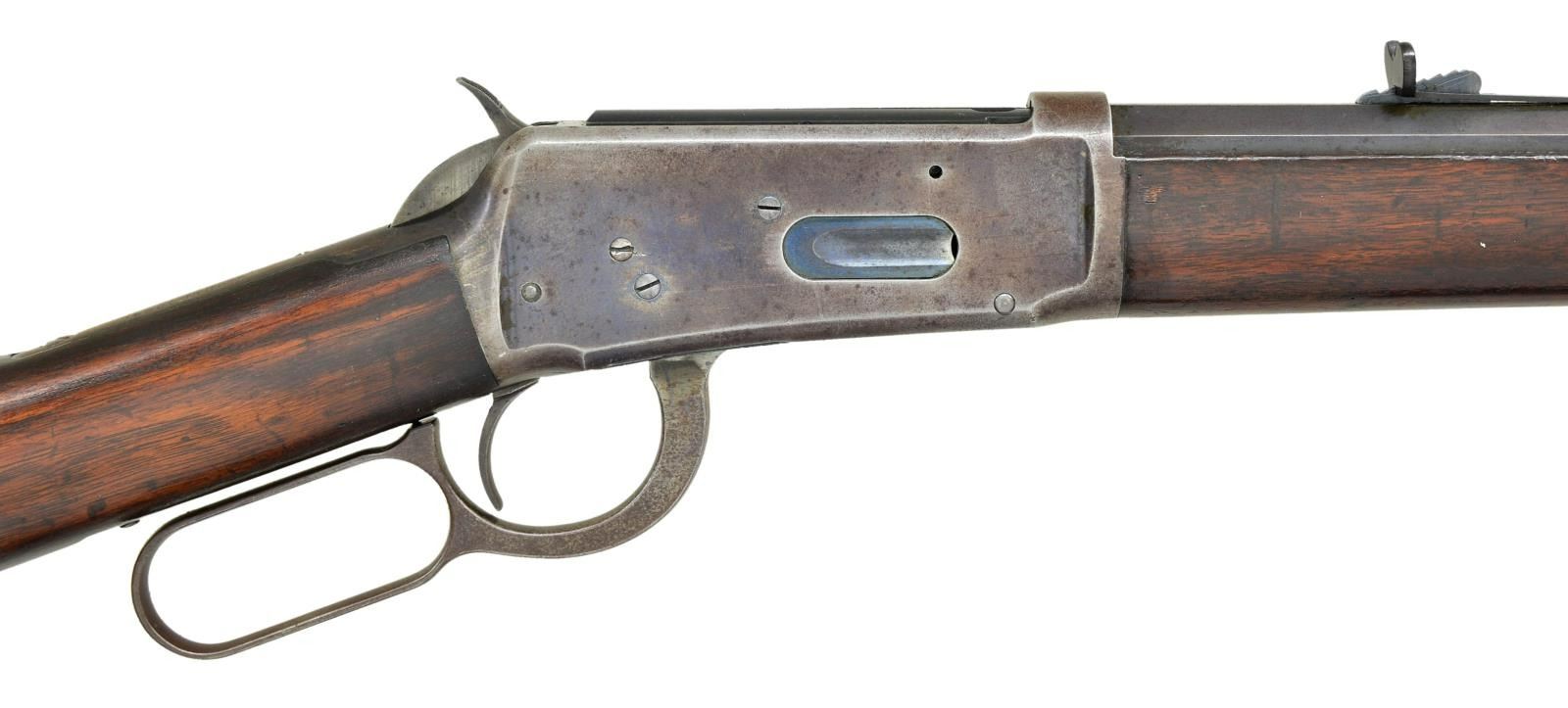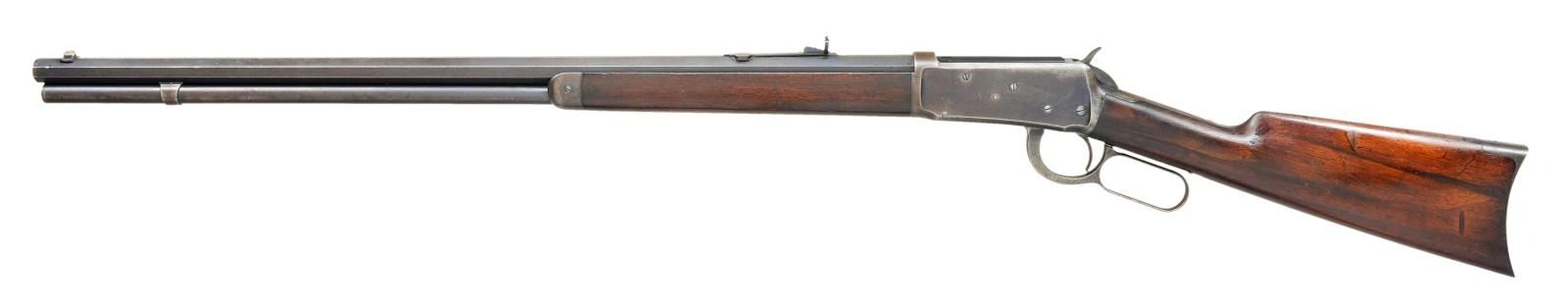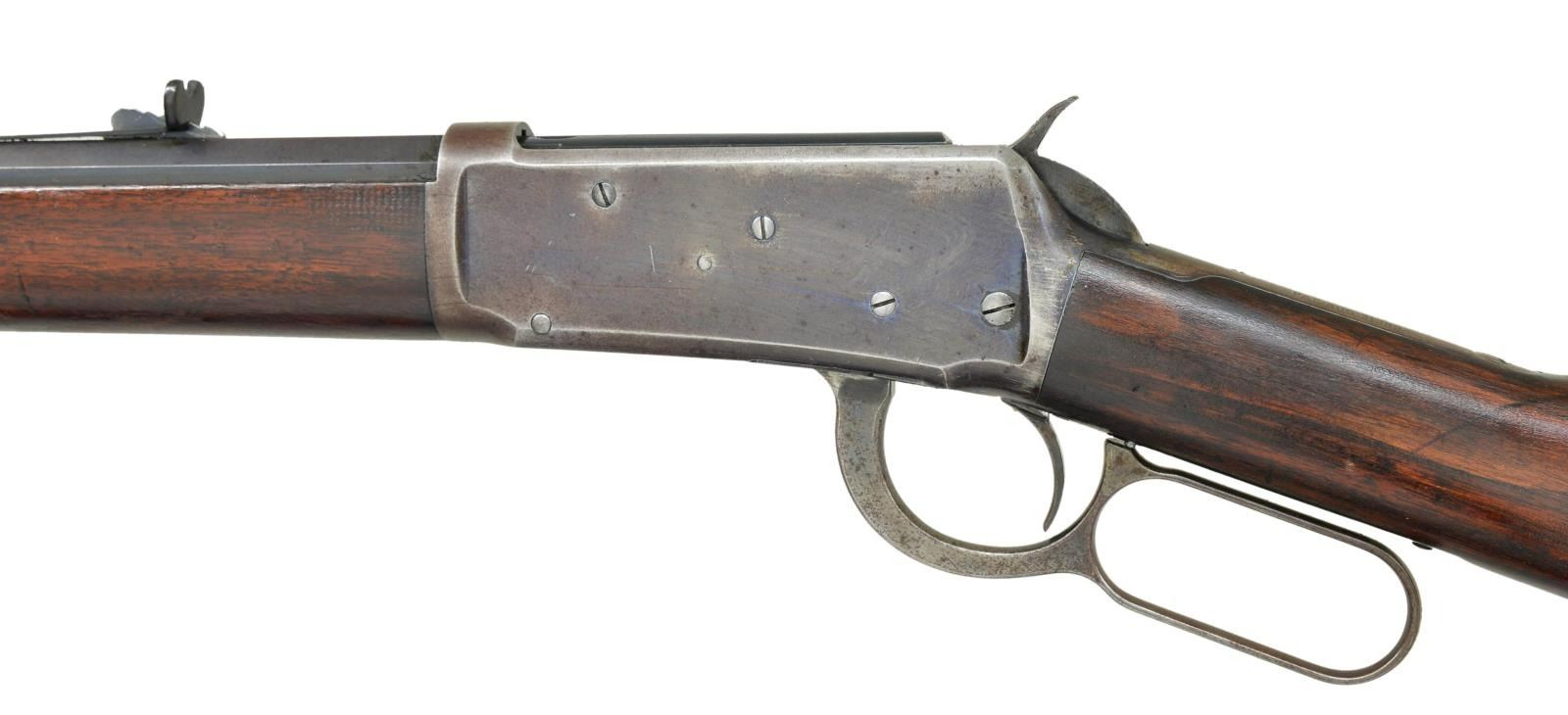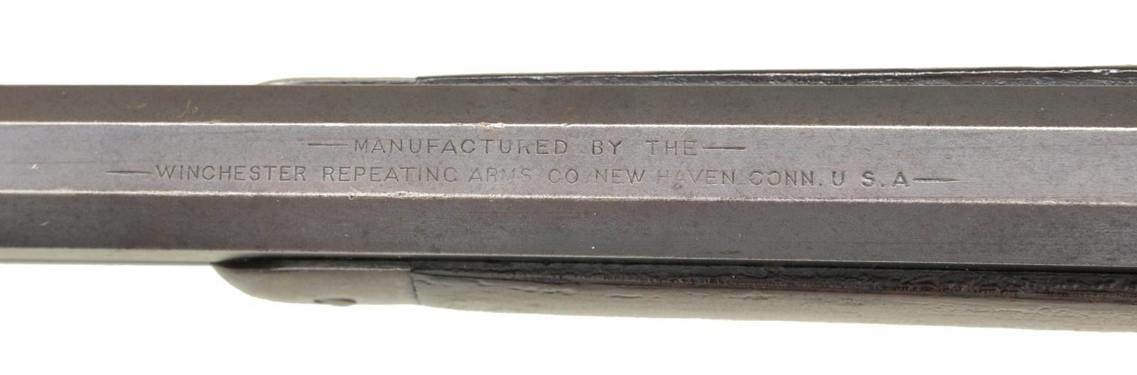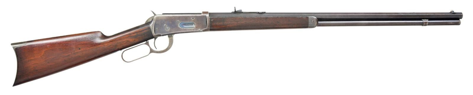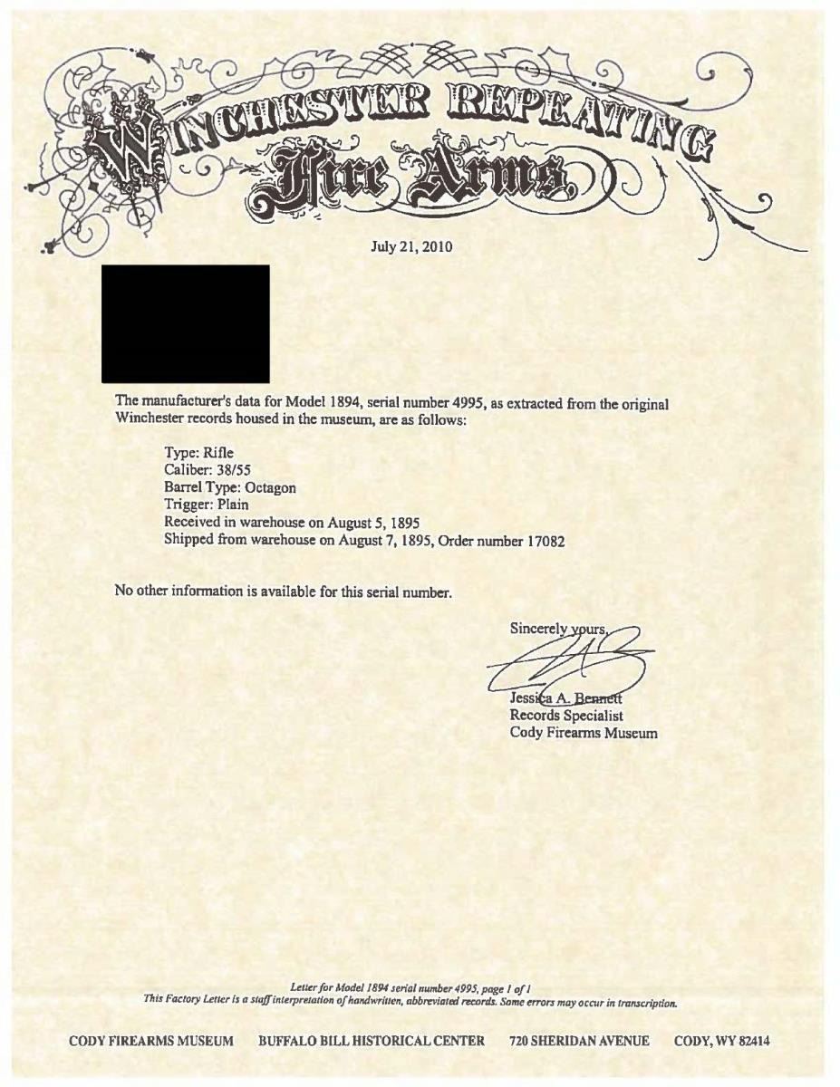 Cal. 38-55. S#. 4995. The highly collectable 1st model rifles are found in S# range 1-7000, but not consecutively. After No. 3000, second model features are predominate. First model rifles are most readily identified by the outside cartridge guide screws on both sides of the receiver. Bbl. 26" octagon. Original sporting sights. Full length mag. Blue finish with case colored hammer & lever. Walnut forend & straight grip stock with crescent steel buttplate. UNATTACHED ACCESSORIES: Cody Firearms Museum letter stating: "Type: Rifle / Caliber: 38/55 / Barrel Type: Octagon / Trigger : Plain / Received in warehouse on august 5, 1895 / Shipped from warehouse on august 7, 1895, Order number 17082." CONDITION: Bbl. & mag. tube have 60% dull original blue with some fading to brown patina showing edge wear. Action shows 30% blue fading to brown with carry wear. Unsanded wood has an added coat of blistering finish over wear, scratches, dents & marks. Sound action. Dark bore retains sound rifling. (01-21667/DS). ANTIQUE. $4,000-6,000.