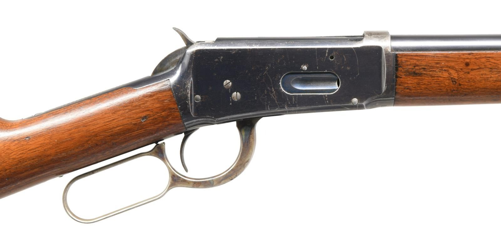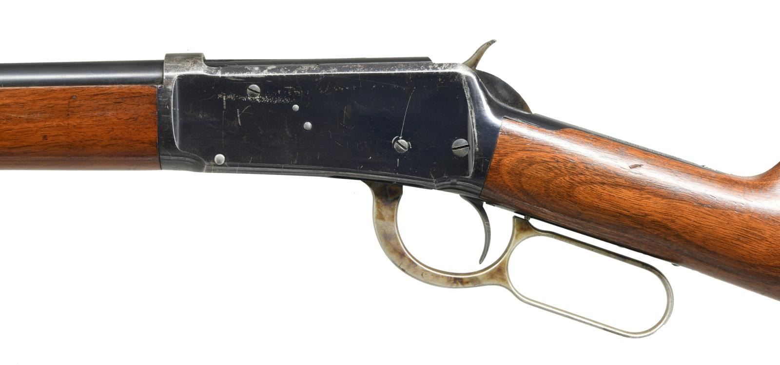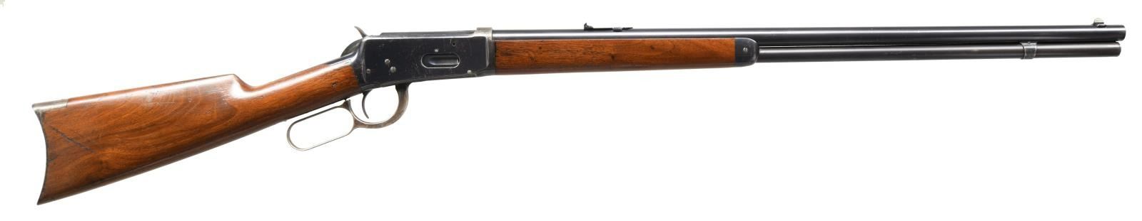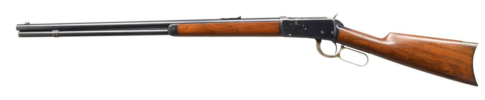 Cal. 25-35. S# 14191. Bbl. 26" round. Sporting front sight w/ Winchester express rear sight. Full length mag. Blue finish w/ case colored hammer & lever. Walnut forearm & straight grip stock w/ crescent steel buttplate. UNATTACHED ACCESSORIES: Cody Firearms Museum records check stating the following: "Type: Rifle / Caliber: 25/35 / Barrel Type: Round / Trigger: Plain / Received in warehouse on October 08, 1896 / Shipped from warehouse on October 22, 1896, Order number 21810". CONDITION: fine. Bbl. & mag. tube retain over 90% blue showing light muzzle wear. Action retains 80% showing edge & carry wear w/ scratches & small marks. Hammer & lever retain 50% lightly visible case colors. Original wood finish shows light wear w/ scratches, marks & dents. Bore has slightly darkened appearance retaining strong rifling. (01-24181/DS). ANTIQUE. $4,000-6,000.