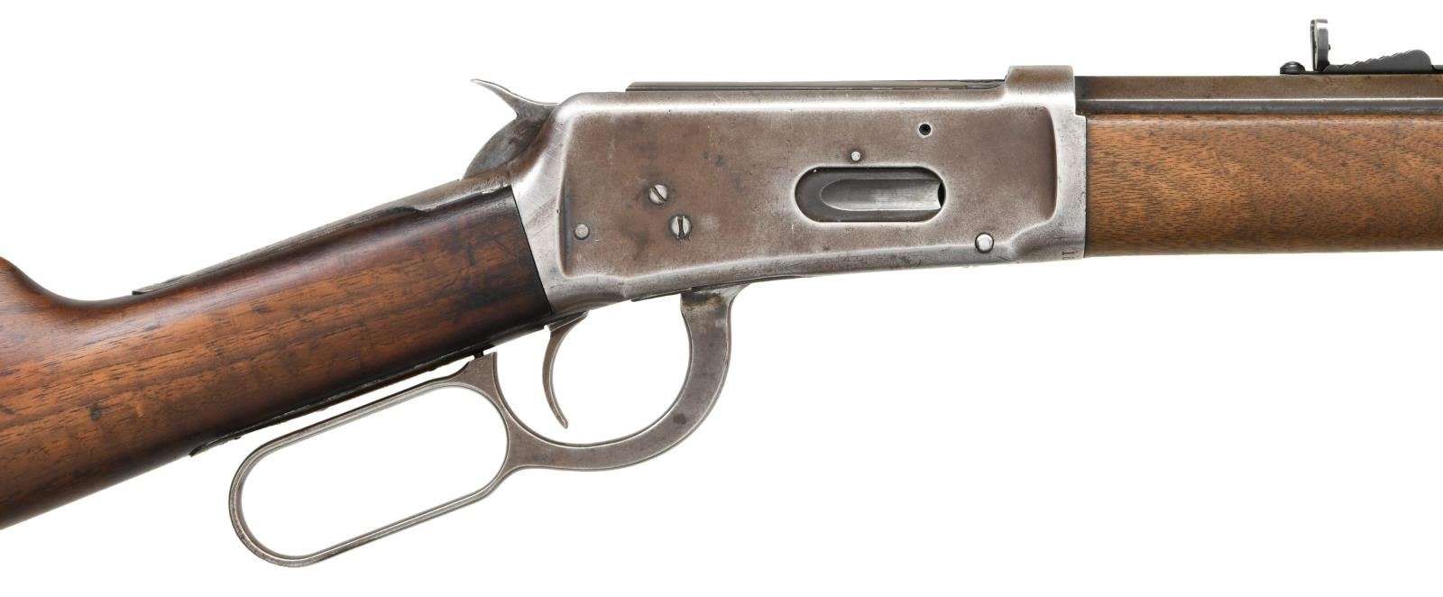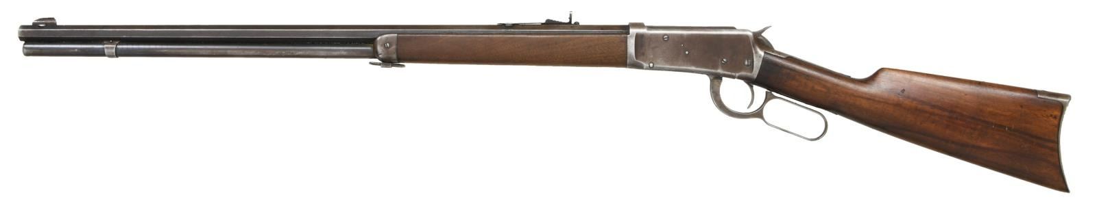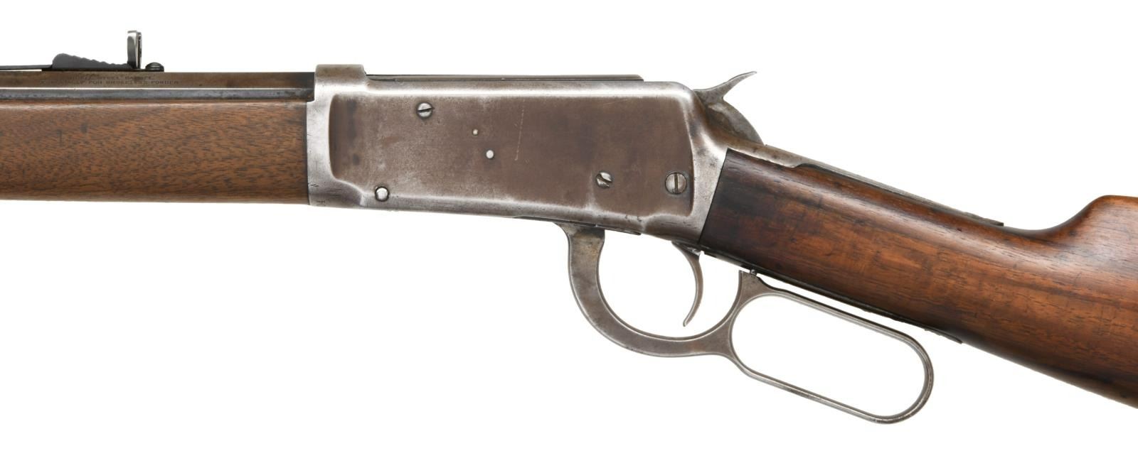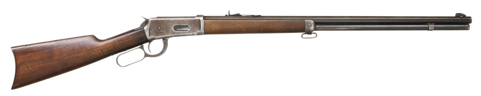 Cal. 32 WS. S# 182804. Bbl 26". Model 1894 lever action rifle manufactured by Winchester in 1899. The top of the barrel is stamped with Winchester's 2 line address, with the caliber designation stamped at the breech. Aftermarket blade front sight with modified brass tip, and reblued Marble's semi-buckhorn U-notch rear sight. Forend nosecap has been mounted with a sling swivel. Plain straight grip wood buttstock with crescent buttplate, and plain wood forend. Stock has been sanded and revarnished at one time. CONDITION: frame retains traces of its original factory blue finish, with the balance exhibiting a gray patina overall. Barrel and magazine tube, exhibiting wear and thinning overall that shows through to a pleasant brown patina. Bore is bright, exhibiting scattered pitting and fair rifling throughout. Wood furniture shows some scattered marks and minor impressions from handling and storage, but otherwise remains sturdy and serviceable. (23-3045/MLW). CURIO. $1,000-1,500.
