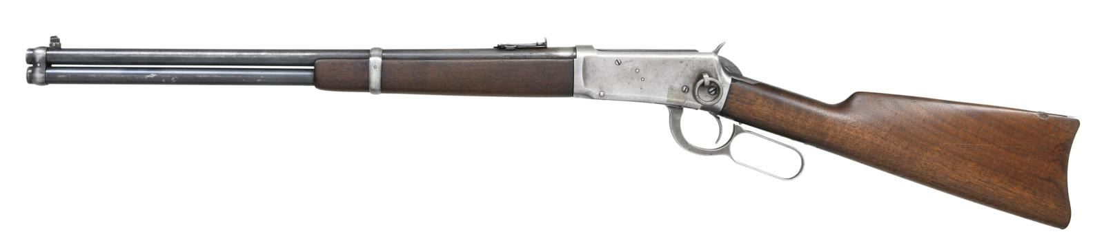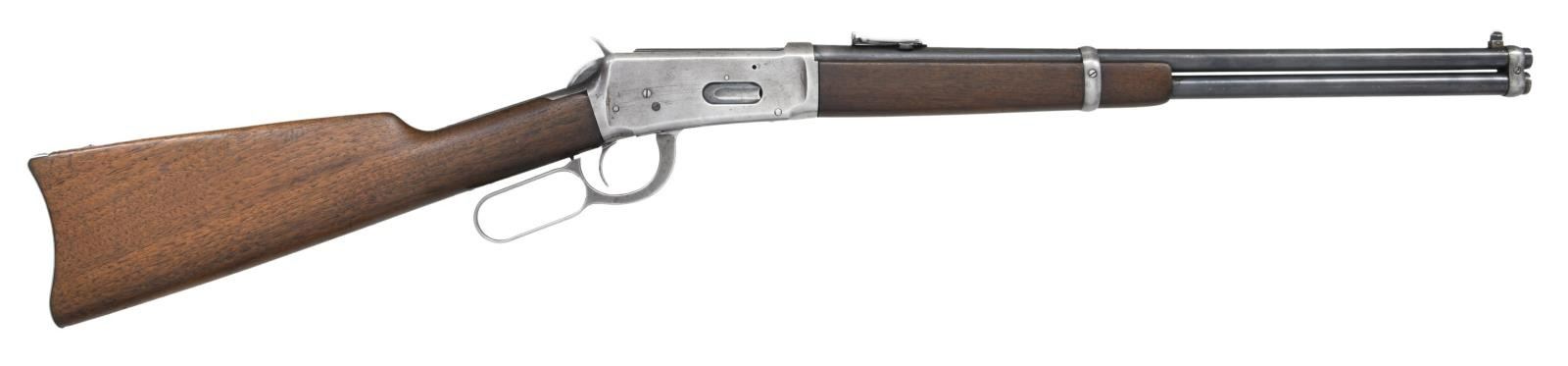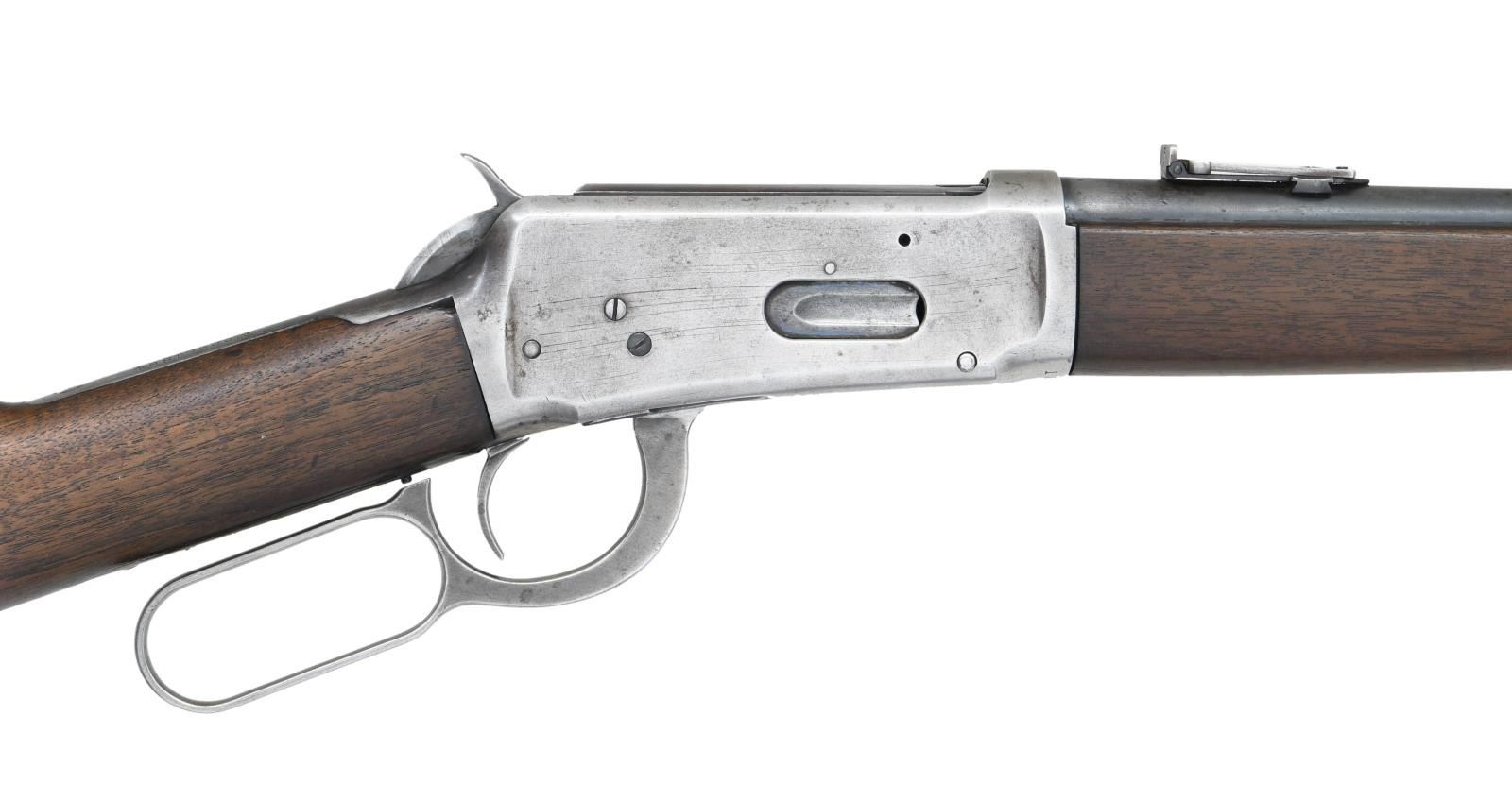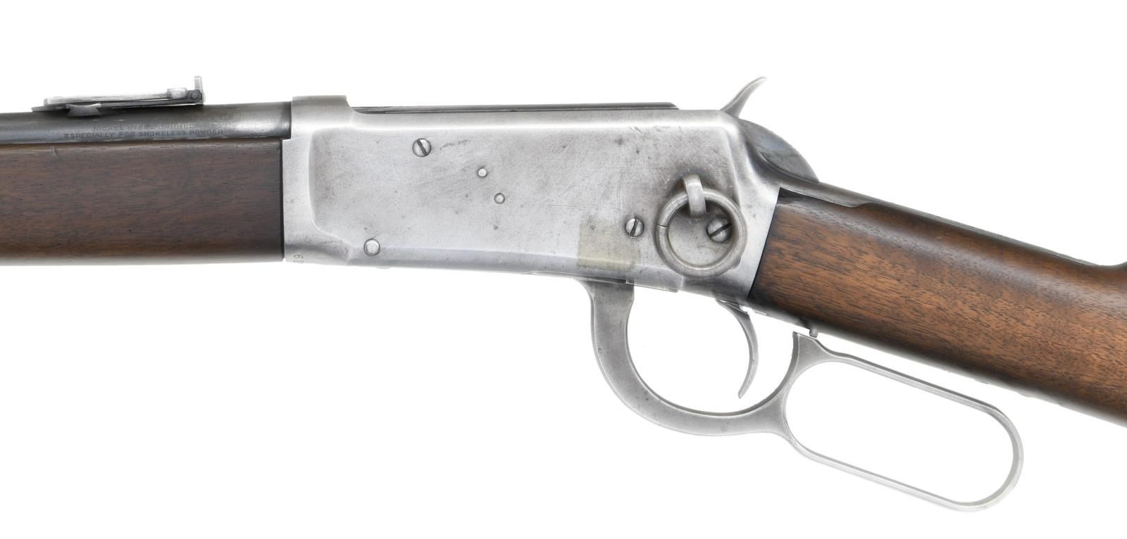 Cal. 32 WS. S# 188219. Bbl 19 5/8". Model 1894 manufactured by Winchester in 1900. The top of the barrel bears Winchester's 2 line address, with "NICKEL STEEL BARREL/ ESPECIALLY FOR SMOKELESS POWDER" stamped on the left towards the breech. Barrel has been shorted, now retaining a Marbles 894L front sight. Left side of receiver is mounted with a saddle ring. Receiver and buttplate have been cleaned and are in-the-white. Furniture consists of a solid wood buttstock and forend. CONDITION: metal components retain fair amounts of their original finish, with the majority of components exhibiting wear through to gray patina or being in-the-white from cleaning. Bore is bright, exhibiting moderate amounts of light pitting and fair rifling throughout. Wood furniture shows some scattered marks and minor impressions from storage and handling, with a small gouge on the top left side of the buttstock. (23-2387/MLW). CURIO. $700-1,100.