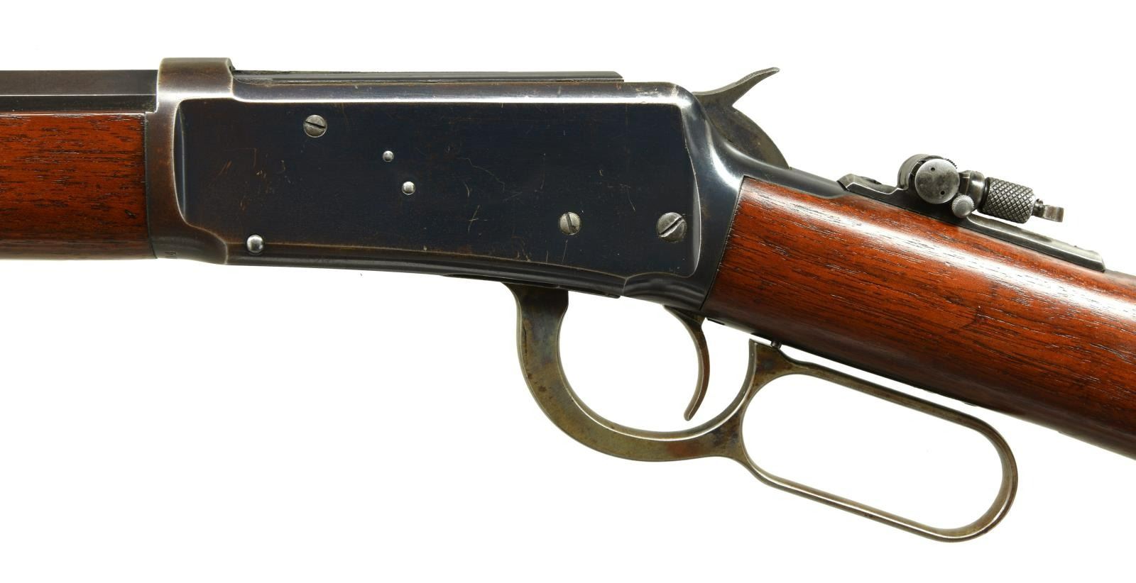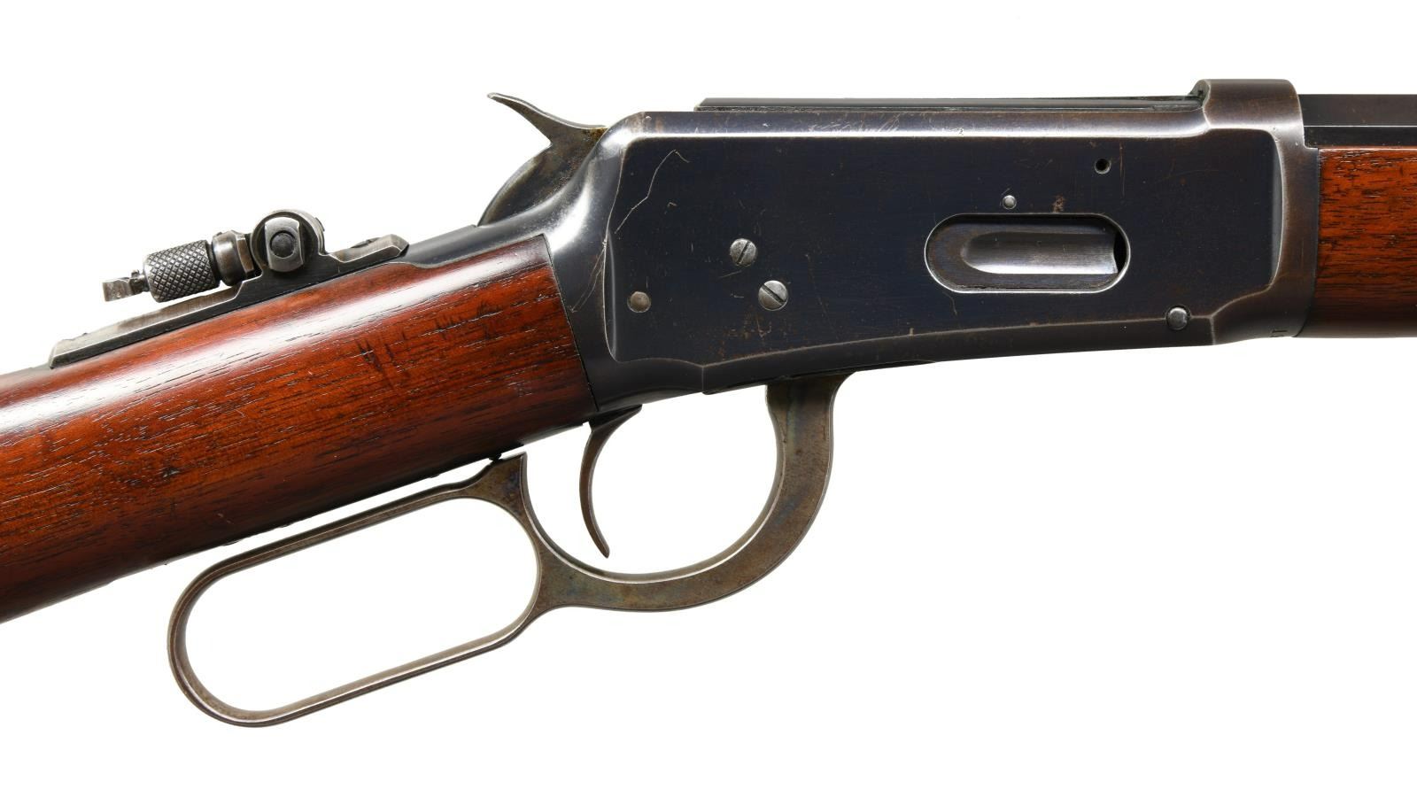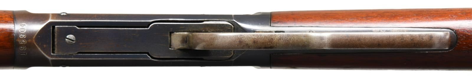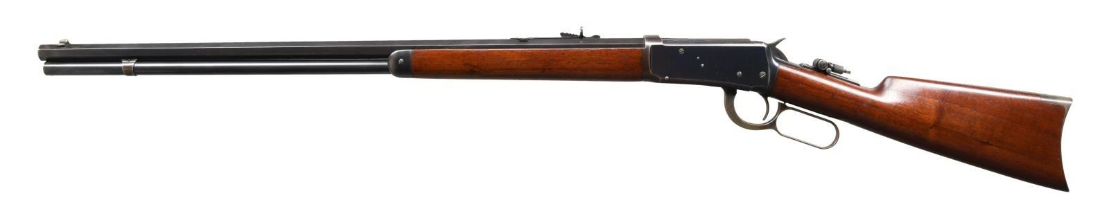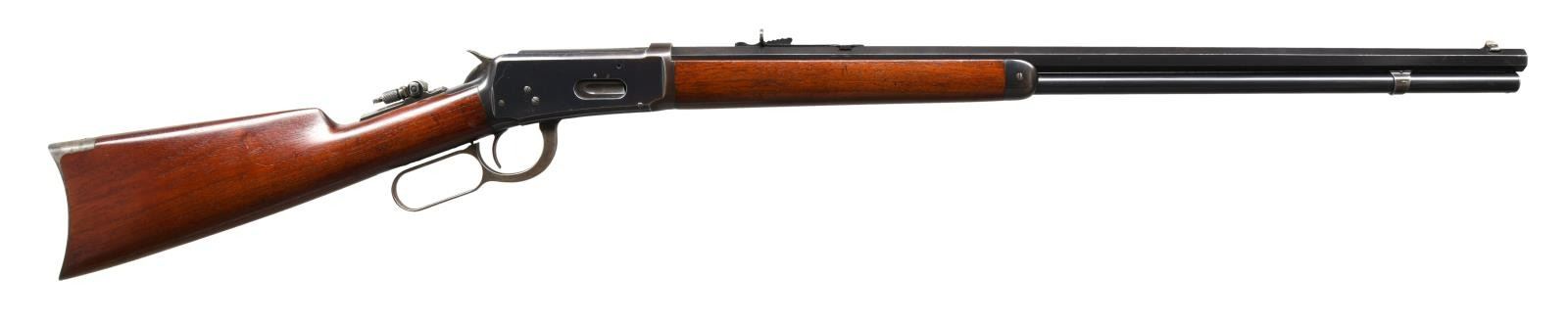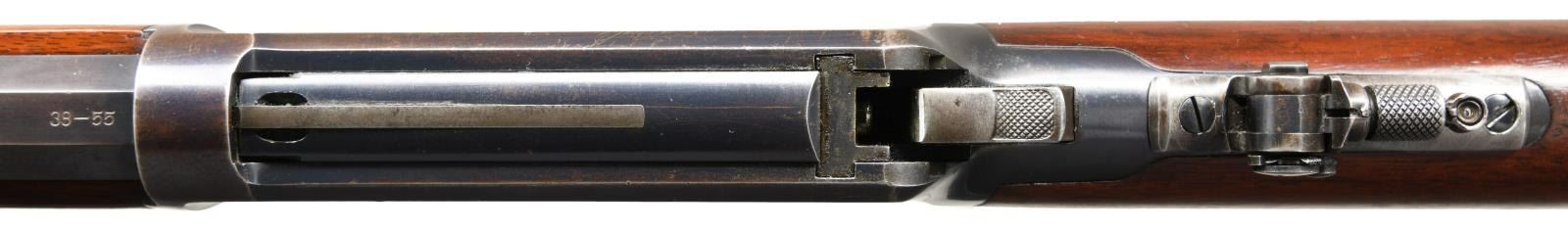 Cal. 38-55. S# 195904. Bbl. 26" octagon. Sporting front & rear sight w/ combination tang sight. Full length mag. Blue finish w/ case colored hammer, lever & crescent steel buttplate. Walnut forearm & straight grip stock. Mfg. 1900. CONDITION: 90% blue showing light carry & edge wear. Hammer & lever retain 50% case colors. Wood shows light wear w/ scattered scratches & marks. Lightly pitted bore retains sound rifling. (23-4764/DS). CURIO. $4000-5500.